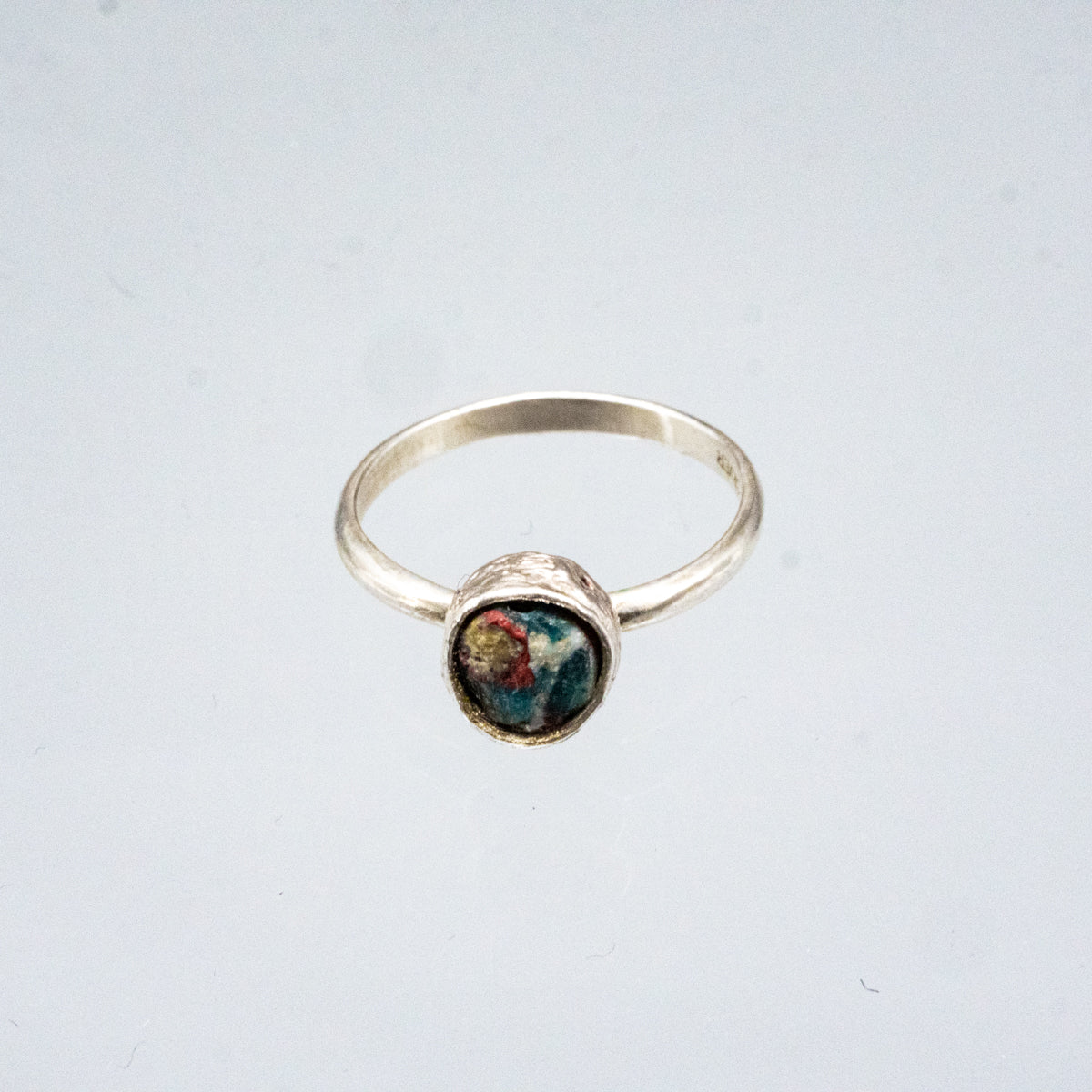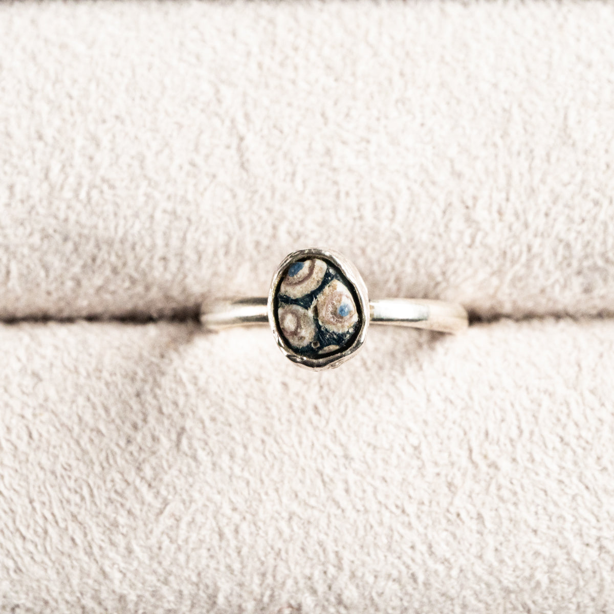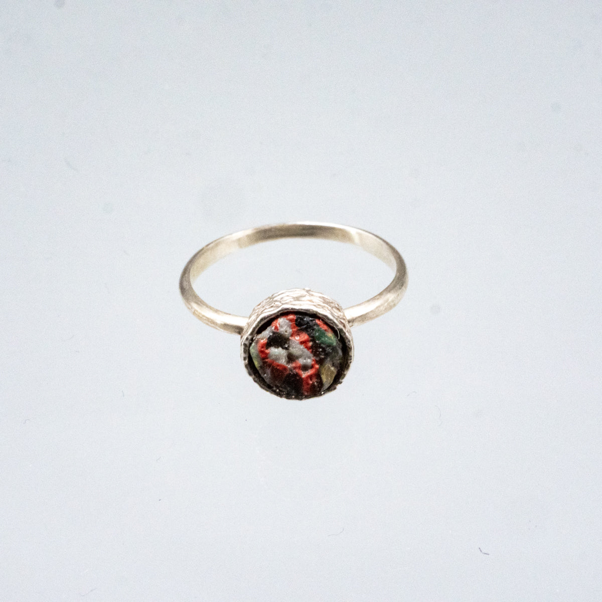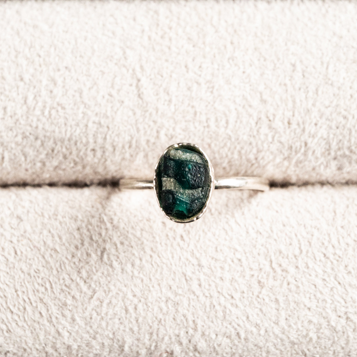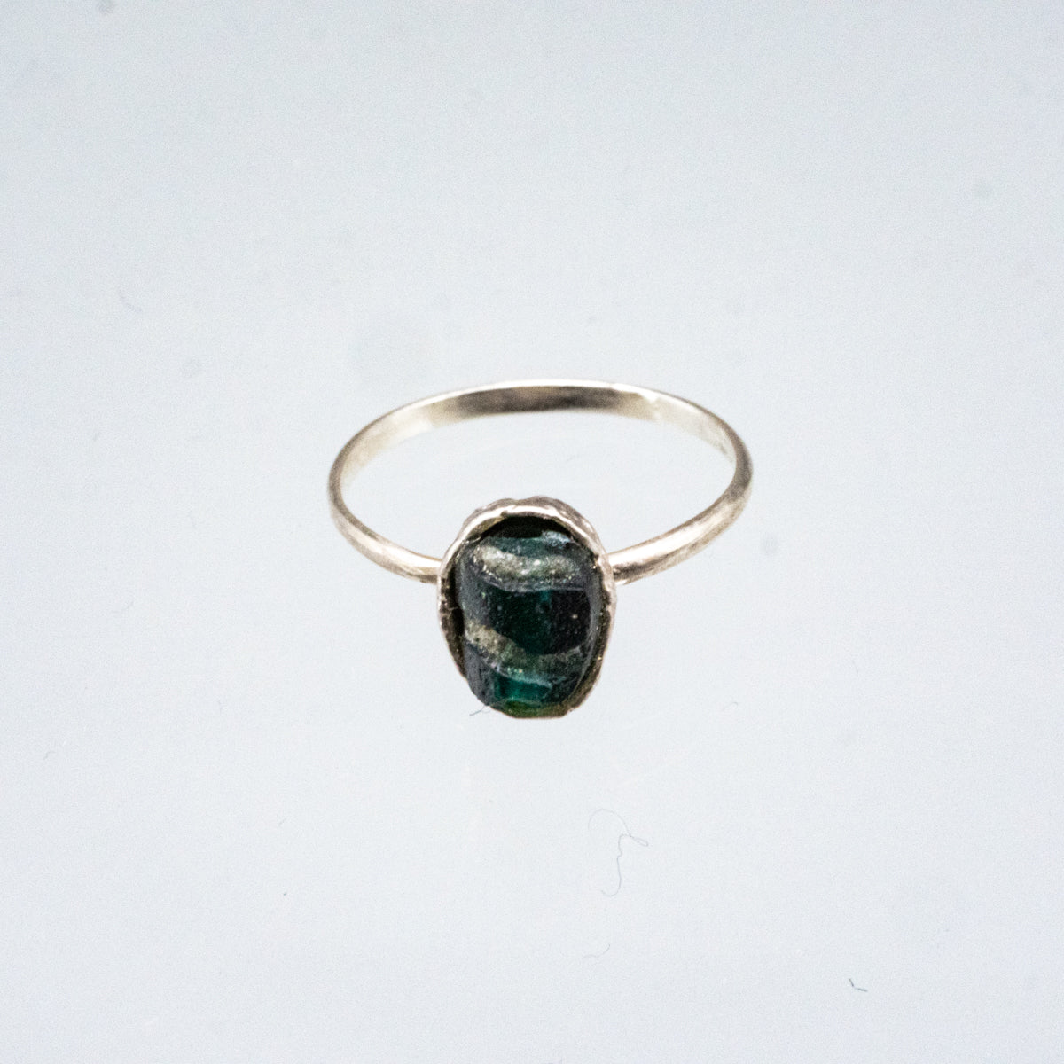東京のアトリエサジが1000〜2000年前くらいの古代ローマンモザイクとんぼ玉破片(ガラス)の形を丸く使えるようにし、シルバー925のリングとして仕上げた美しいワンアンドオンリーなリング。 長い年月を経て新たな形で蘇った歴史を感じる逸品です。