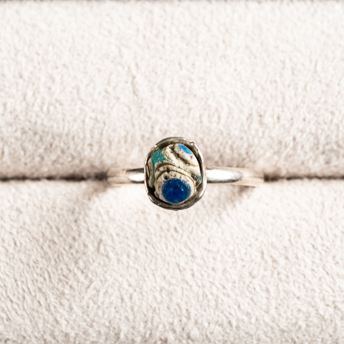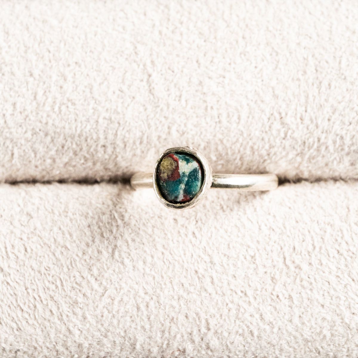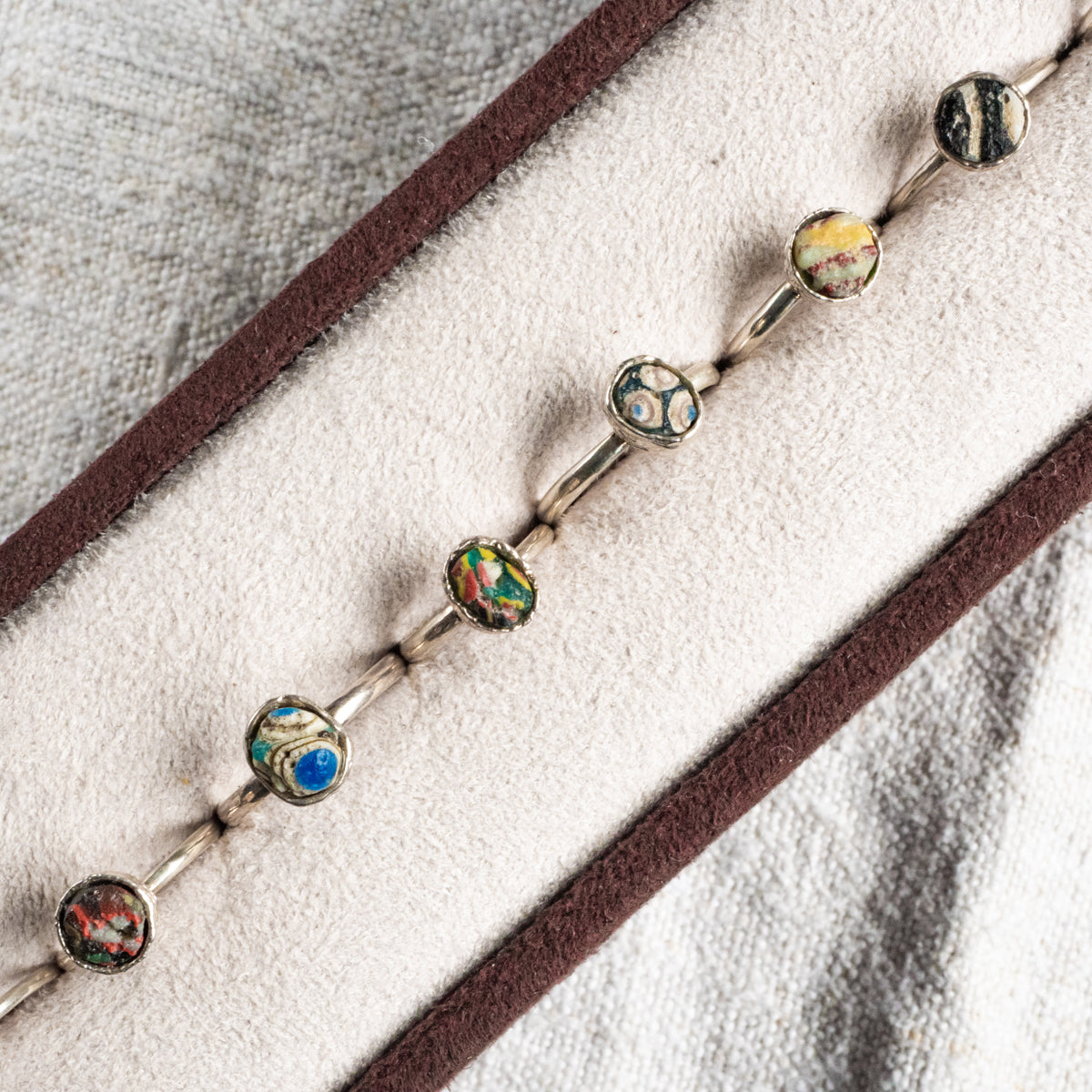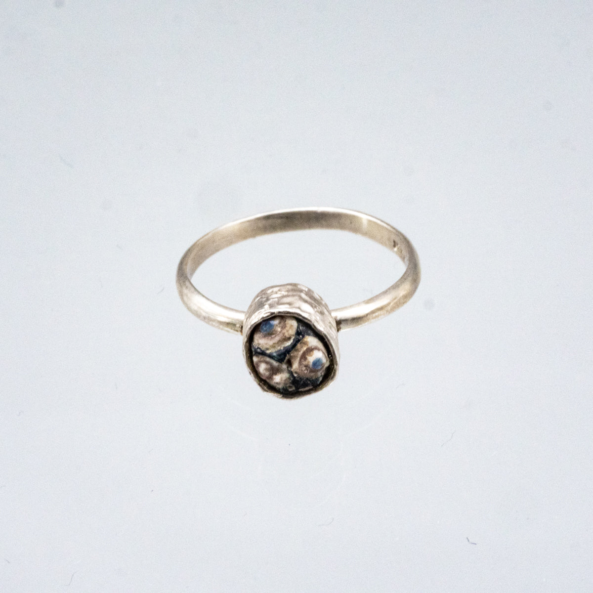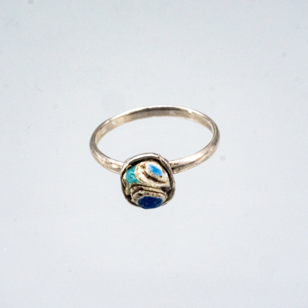 東京のアトリエサジが1000〜2000年前くらいの古代ローマンモザイクとんぼ玉破片(ガラス)の形を丸く使えるようにし、シルバー925のリングとして仕上げた美しいワンアンドオンリーなリング。 長い年月を経て新たな形で蘇った歴史を感じる逸品です。