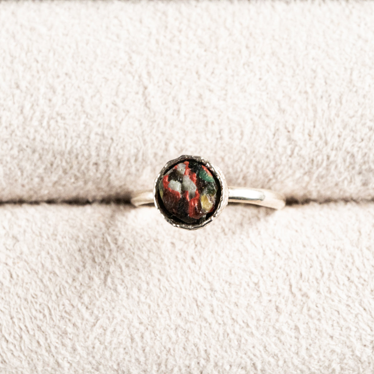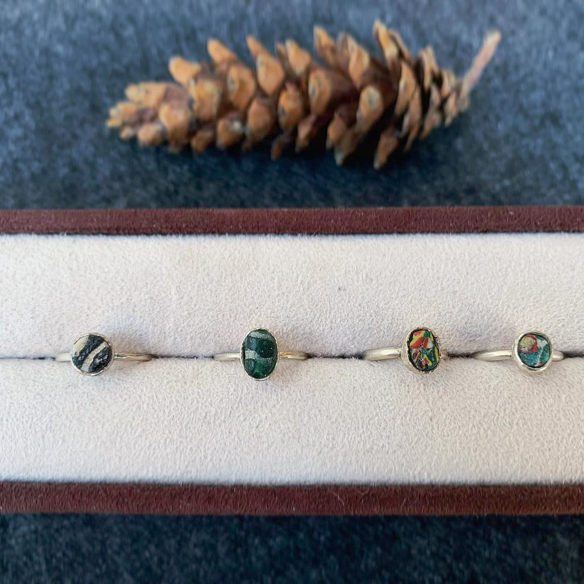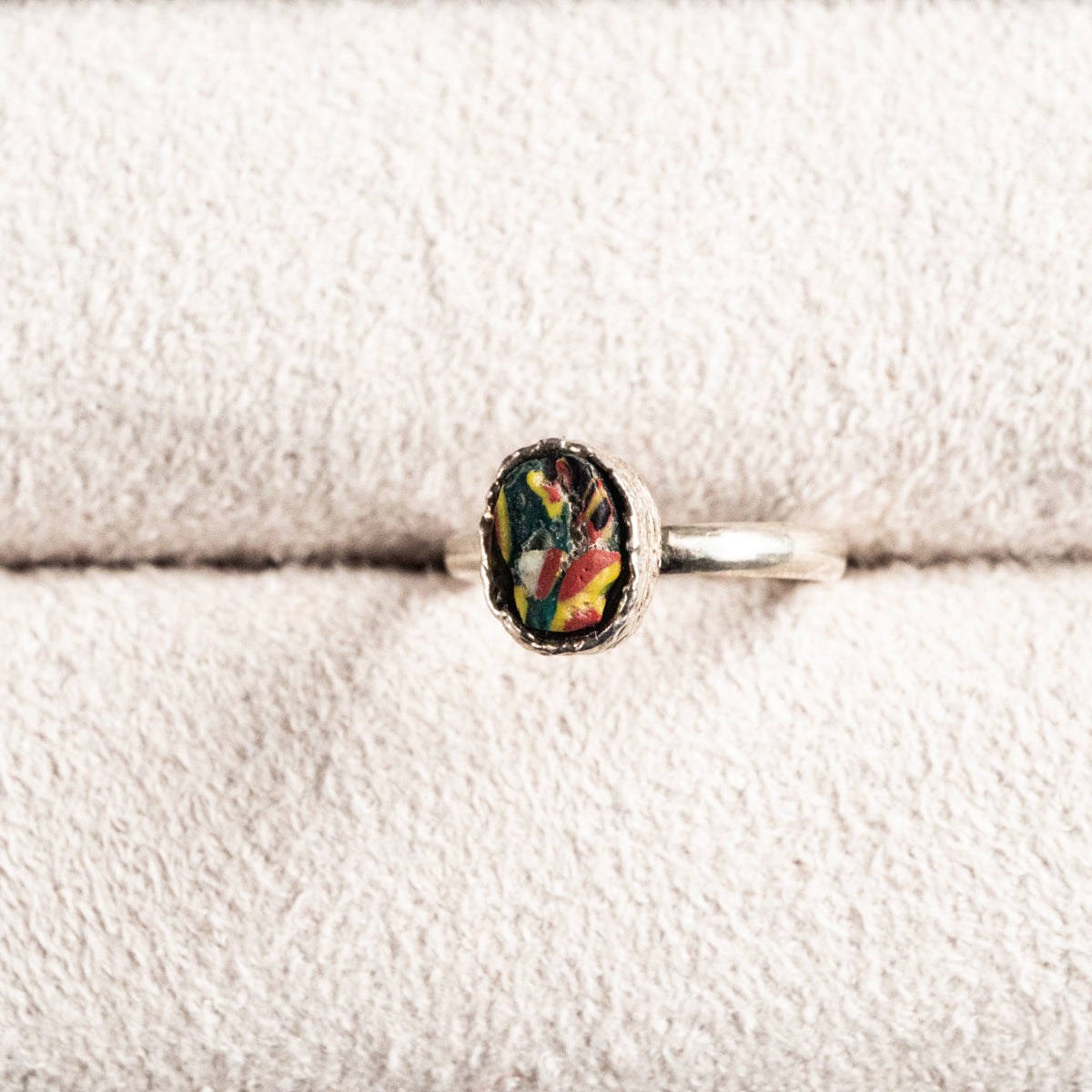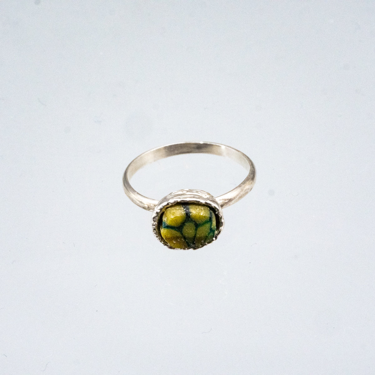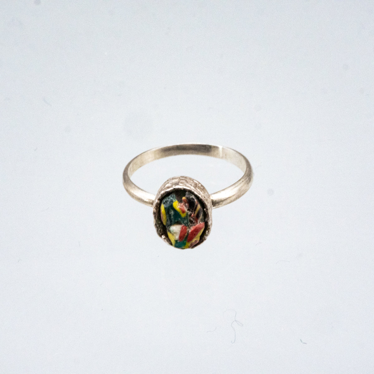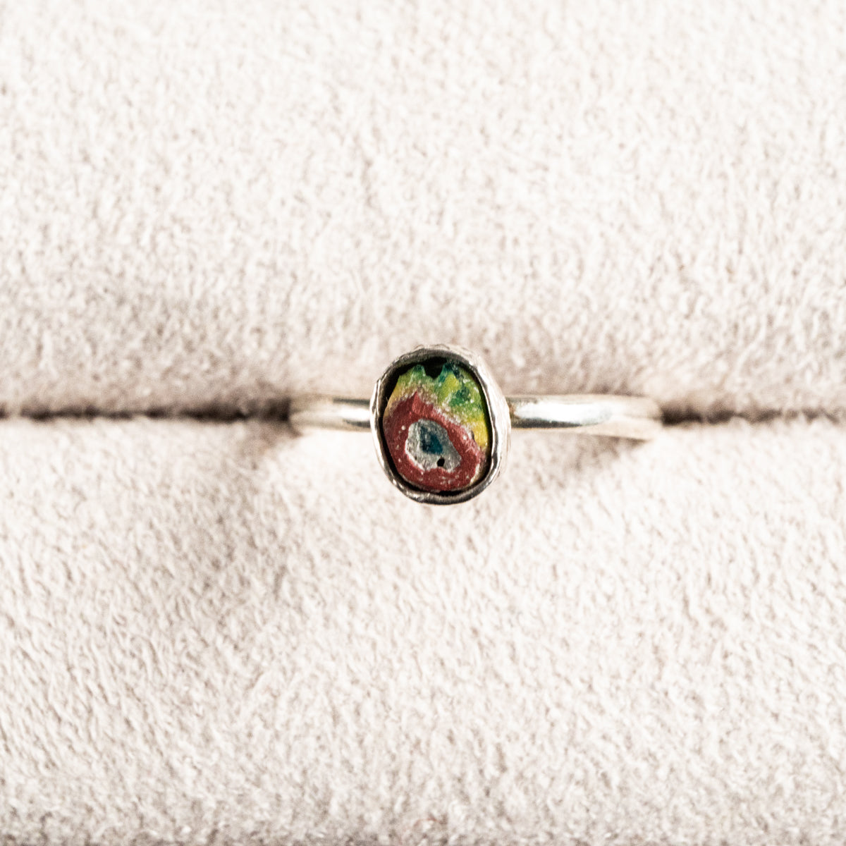東京のアトリエサジが1000〜2000年前くらいの古代ローマンモザイクとんぼ玉破片(ガラス)の形を丸く使えるようにし、シルバー925のリングとして仕上げた美しいワンアンドオンリーなリング。 長い年月を経て新たな形で蘇った歴史を感じる逸品です。