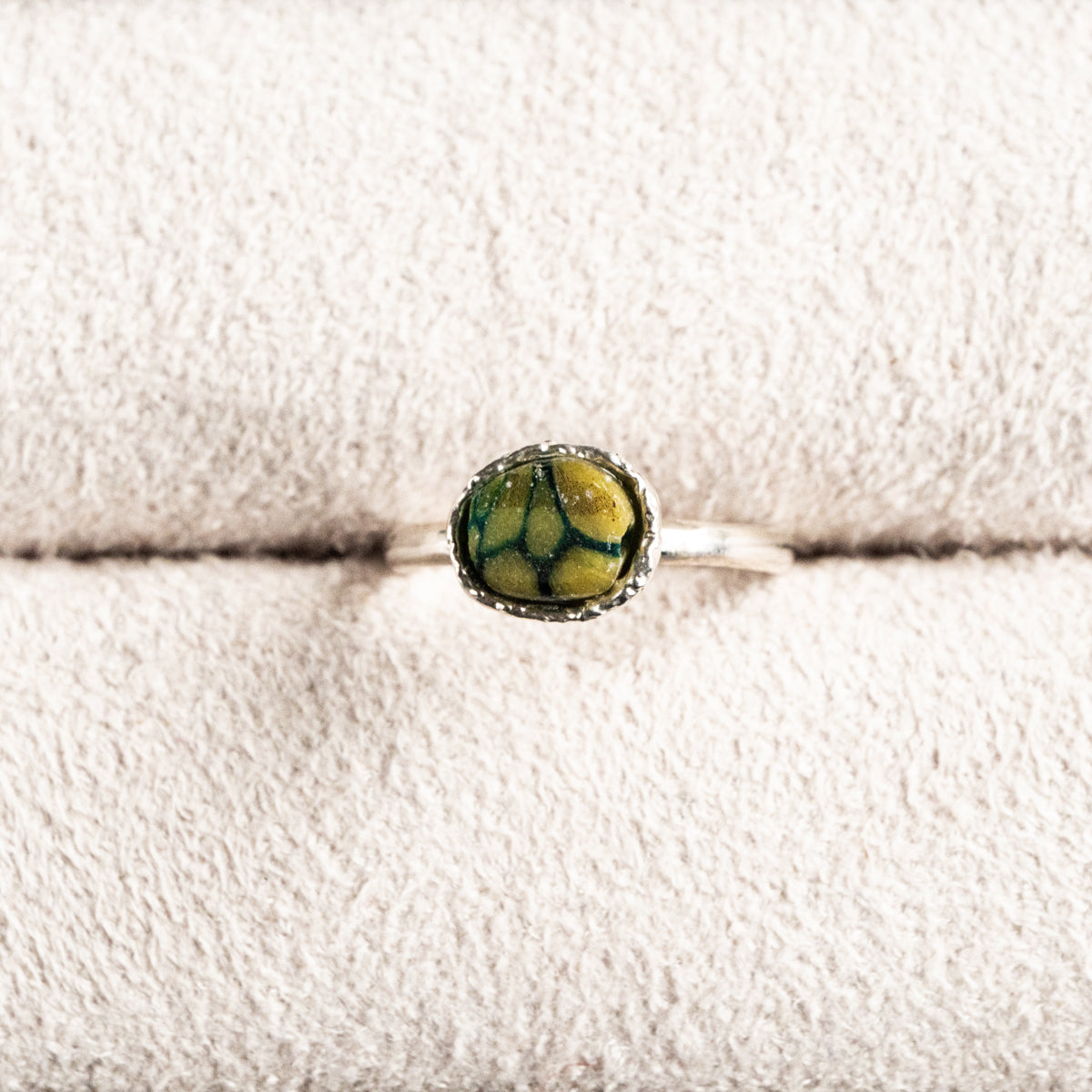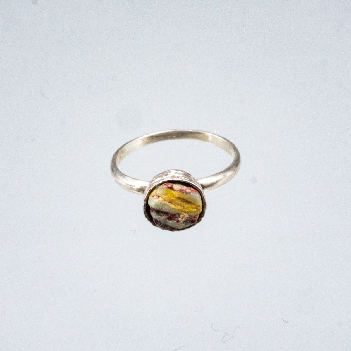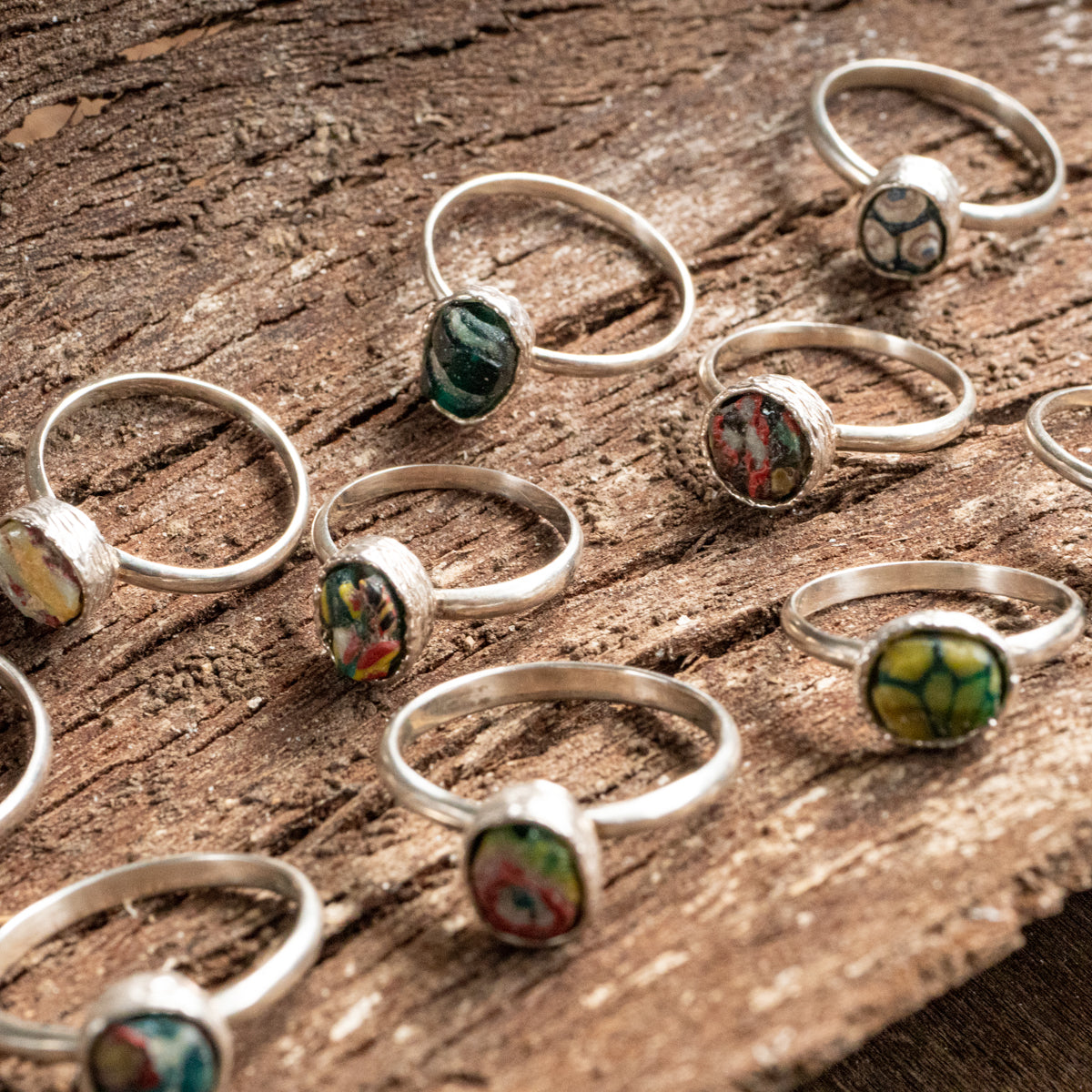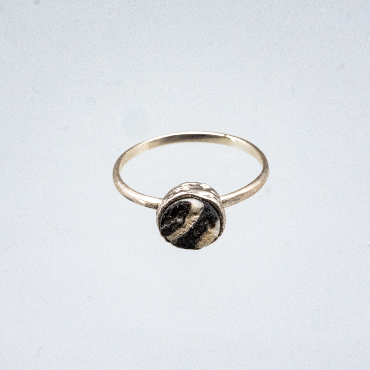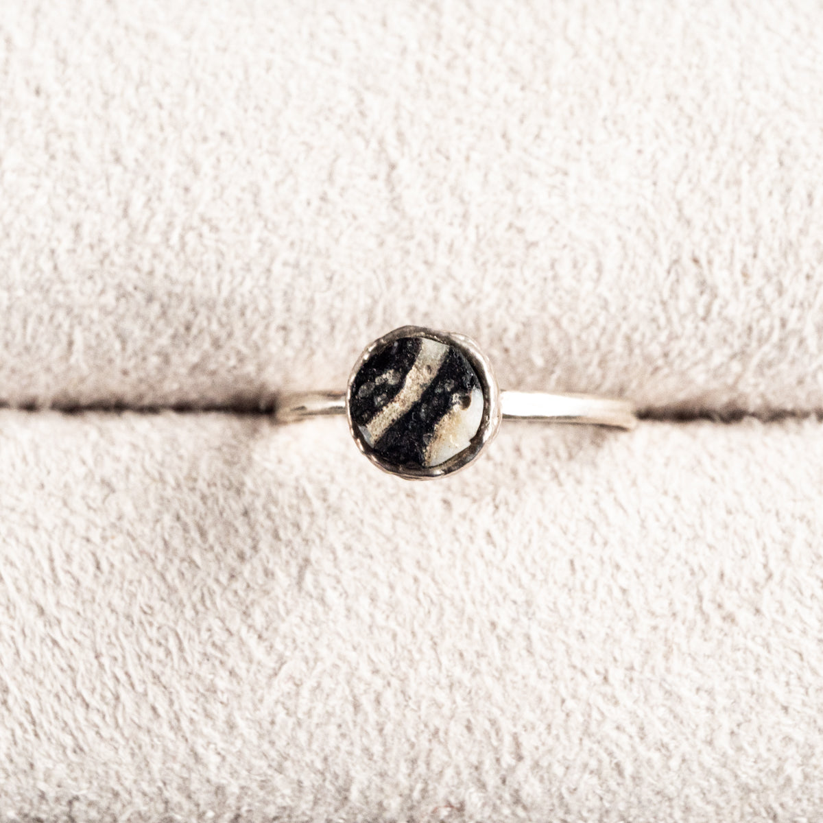 東京のアトリエサジが1000〜2000年前くらいの古代ローマンモザイクとんぼ玉破片(ガラス)の形を丸く使えるようにし、シルバー925のリングとして仕上げた美しいワンアンドオンリーなリング。 長い年月を経て新たな形で蘇った歴史を感じる逸品です。