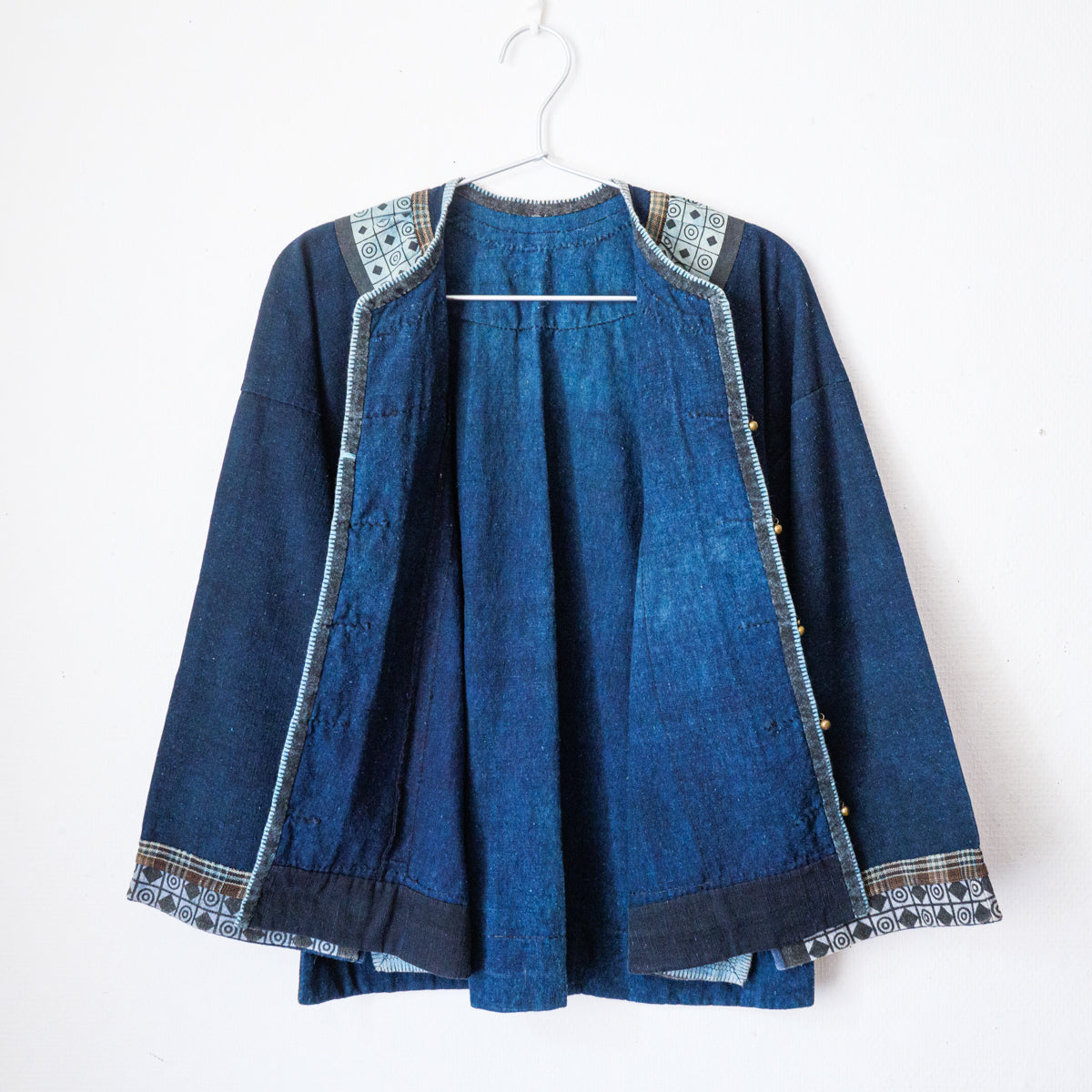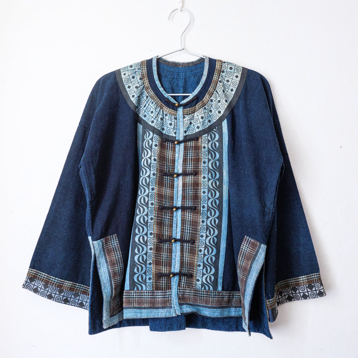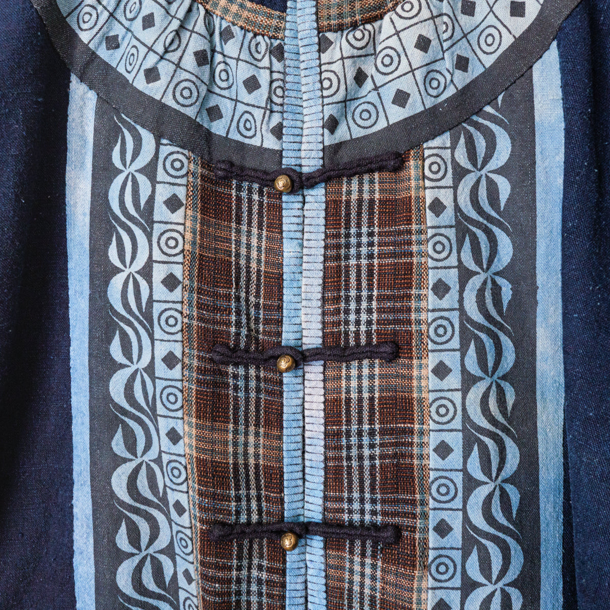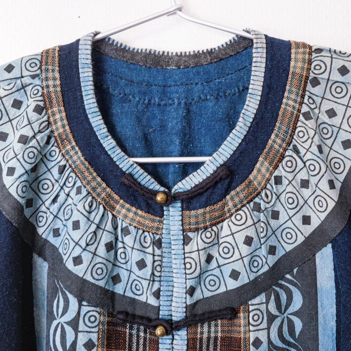雲南省マリポ地区の少数民族、イ族の女性用衣装。美しい滑らかな質感の手織り藍染め生地をベースに、可愛らしい模様のロウケツ染め生地を装飾的にあて、さらに茶色の手織り生地を重ねた労力の詰まった逸品です。真鍮ボタンをループに通して閉める構造です。とても良好な状態で、飾るだけでも良い雰囲気です。