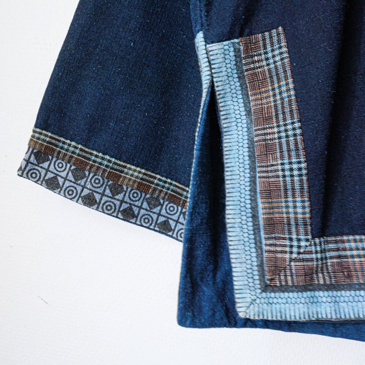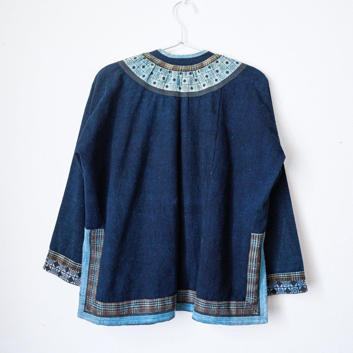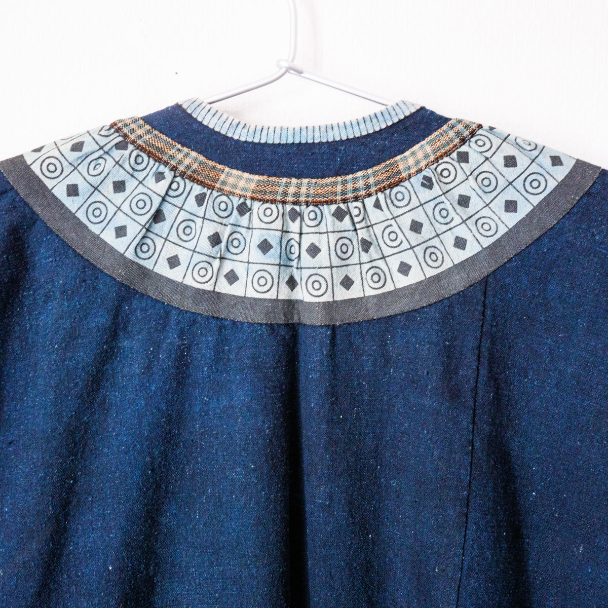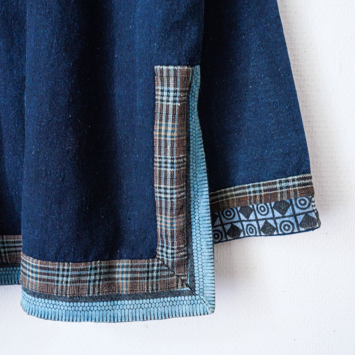 雲南省マリポ地区の少数民族、イ族の女性用衣装。美しい滑らかな質感の手織り藍染め生地をベースに、可愛らしい模様のロウケツ染め生地を装飾的にあて、さらに茶色の手織り生地を重ねた労力の詰まった逸品です。真鍮ボタンをループに通して閉める構造です。とても良好な状態で、飾るだけでも良い雰囲気です。