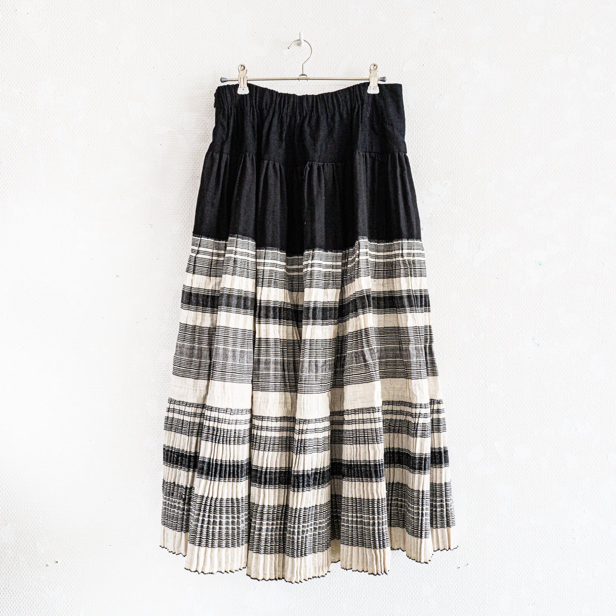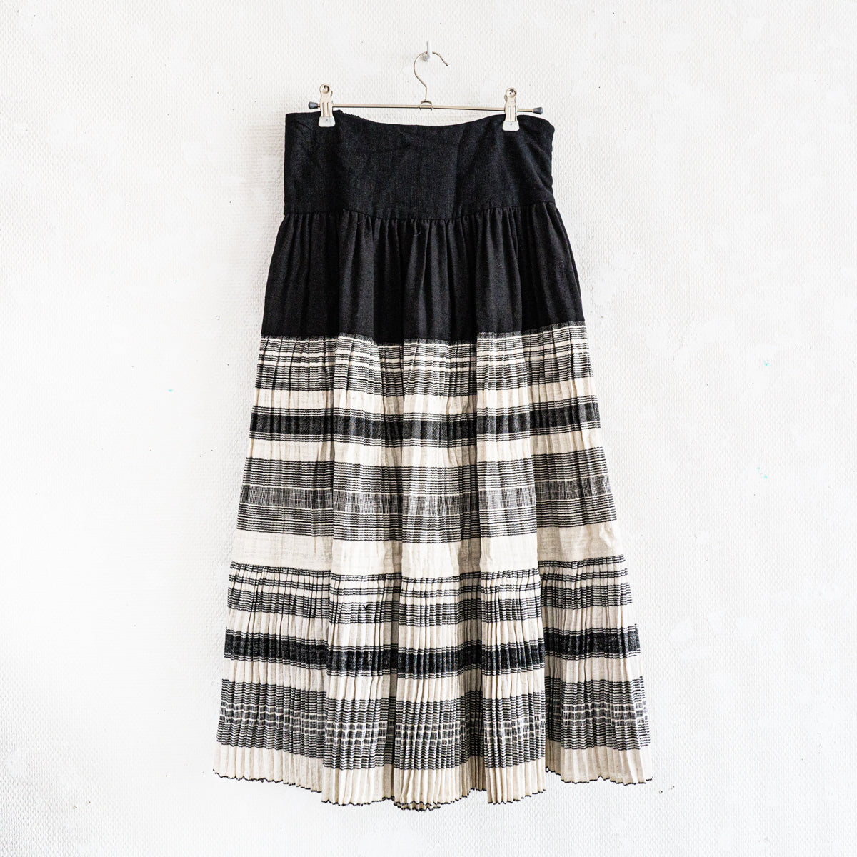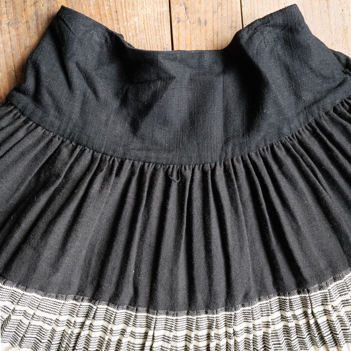 タイ少数民族モン族によるプリーツスカート、すべて広げると大きな美しい円形になり圧巻です。ウェストの腰部分にちょっとしたファスナーがあり、さらにゴムなので履きやすくフリーサイズになります。