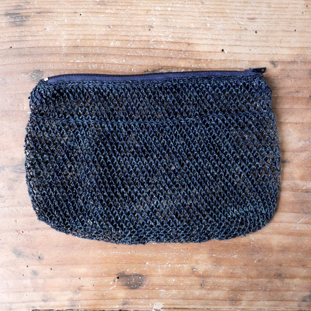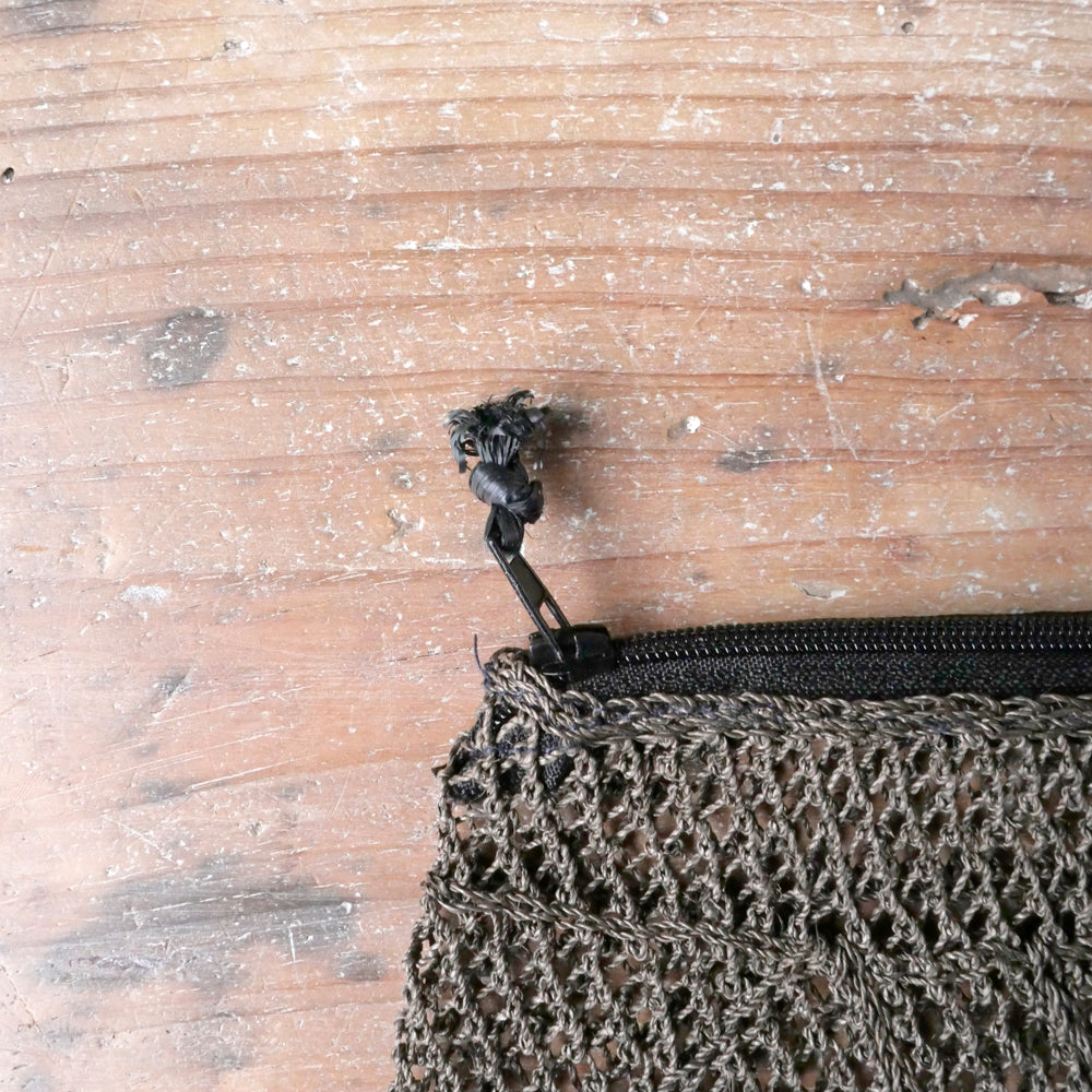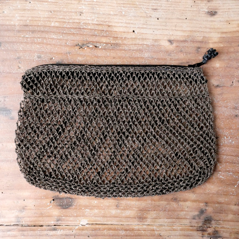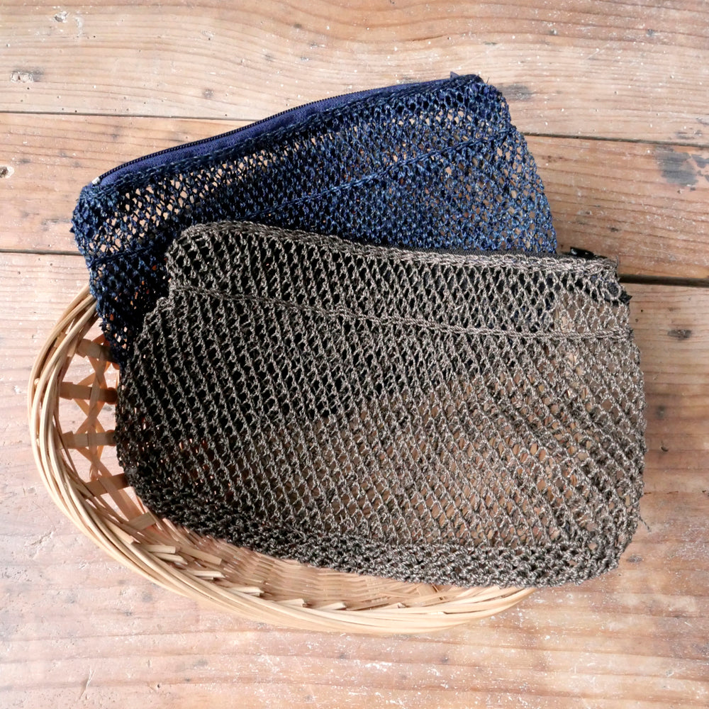 古くはラオスのカム族によって、魚の網を編むようにして作られていた、葛の繊維で出来たポーチ。シースルーでプリミティブな雰囲気がオシャレ。こちらは通常のスタンダードタイプとは異なる、斜めの網目模様が表面の片側に入っているタイプになります。中身が見えるので、バッグインポーチとして大変便利です。ファスナー部分にはタッセルが付いていたり、付いていなかったりと、その時々の入荷でまちまちです。ブラウン、ネイビーの2色展開で、すべて現地の植物で染められています。