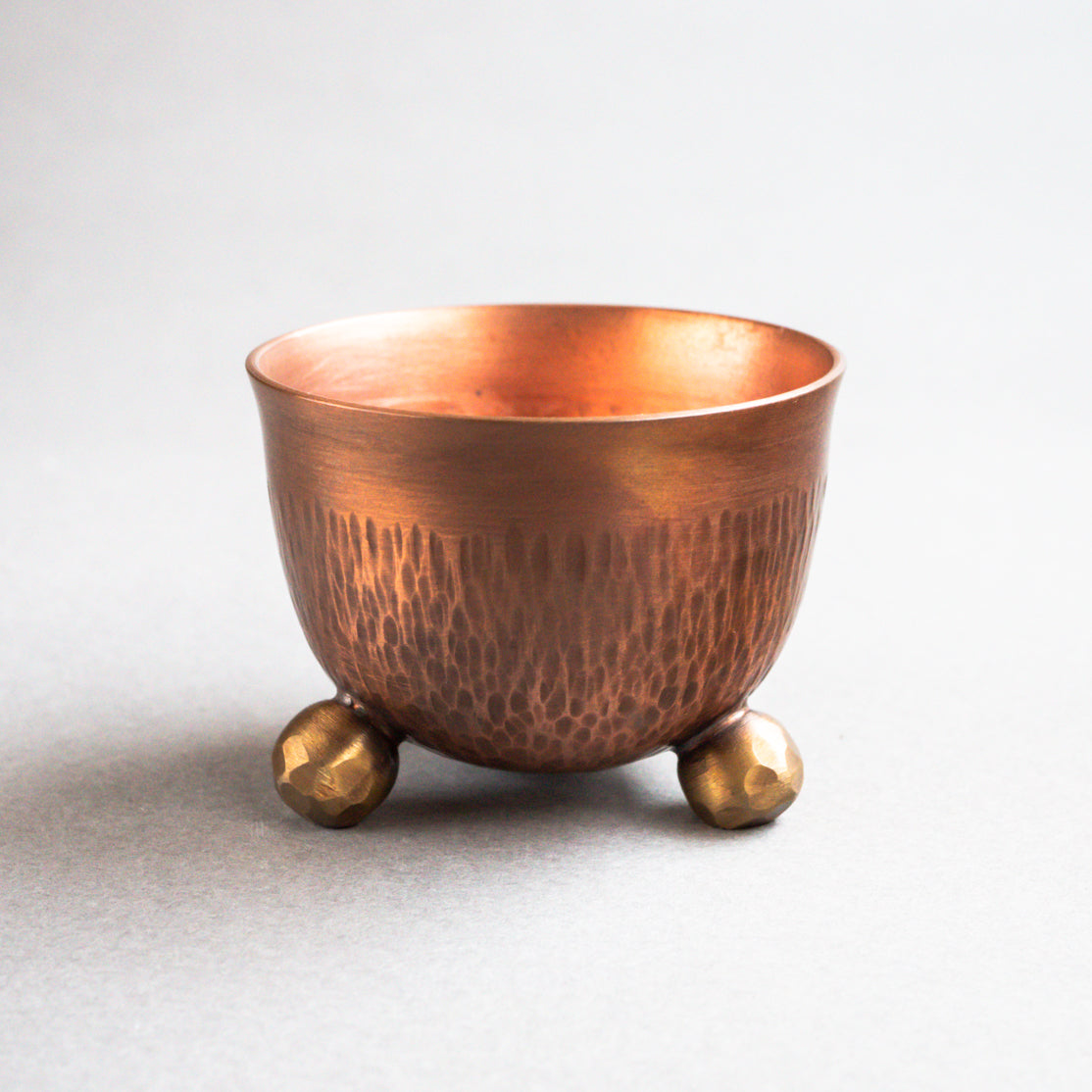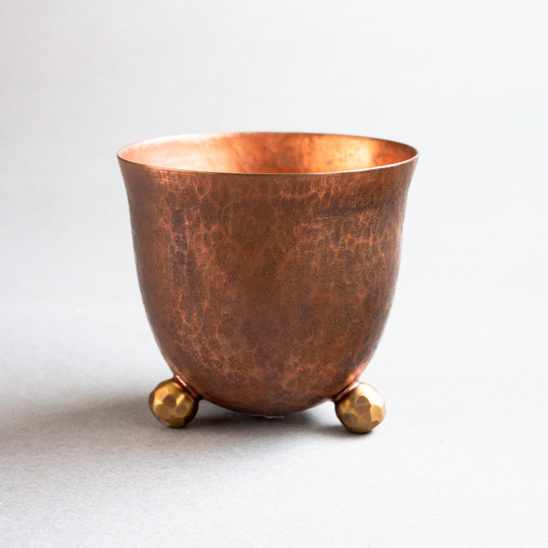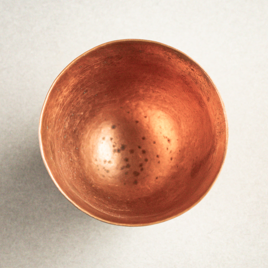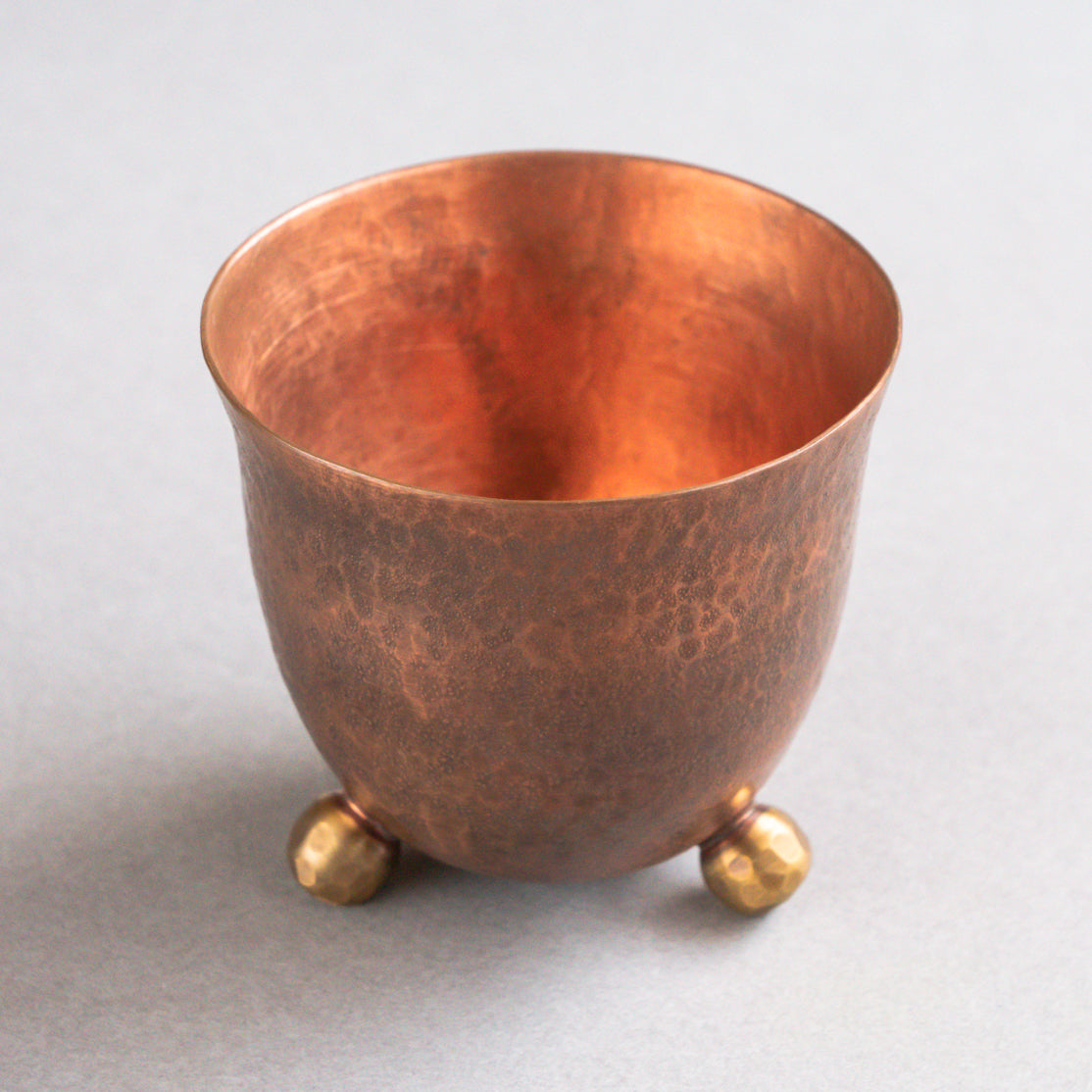 こちらは銅製のぐい呑で、銅なので美しい経年変化をします。丹精に数千回も叩き描いた槌目模様は美しさだけではなく、本体の強度を増す役割も果たしています。持ったときのひんやりとした重厚感がたまりません。お酒が好きな方へのギフトとしてオススメです。