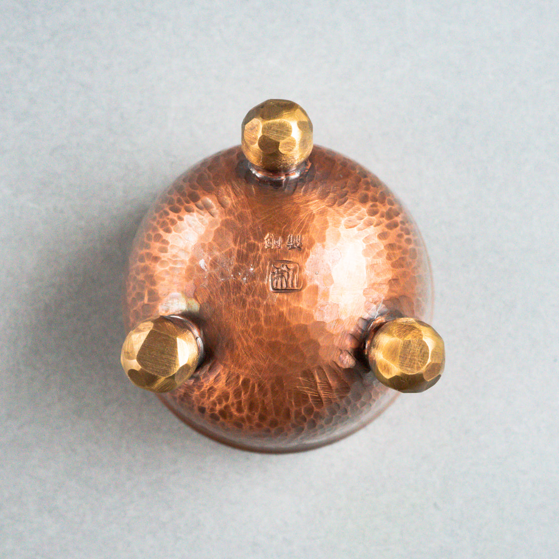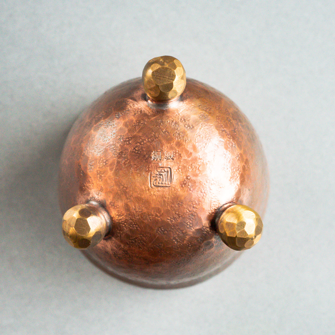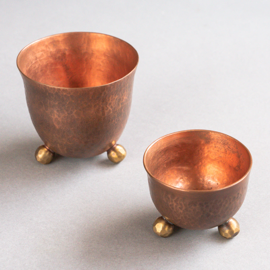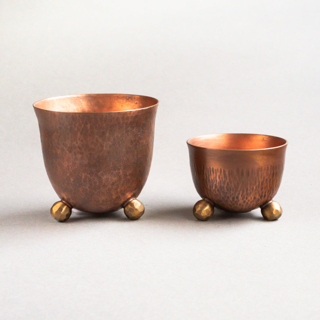 こちらは銅製のぐい呑で、銅なので美しい経年変化をします。丹精に数千回も叩き描いた槌目模様は美しさだけではなく、本体の強度を増す役割も果たしています。持ったときのひんやりとした重厚感がたまりません。お酒が好きな方へのギフトとしてオススメです。
