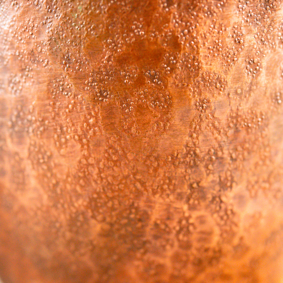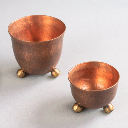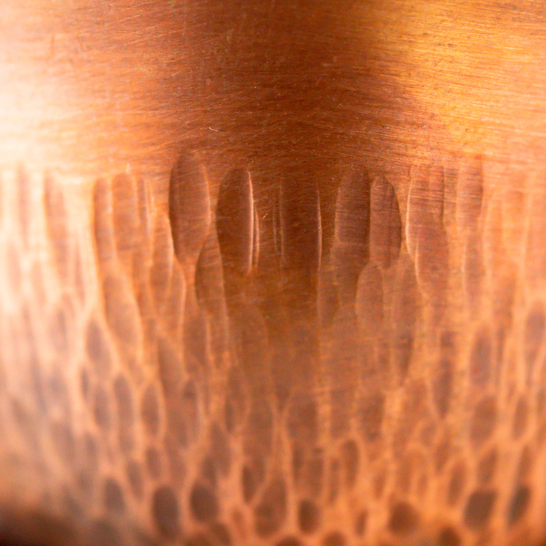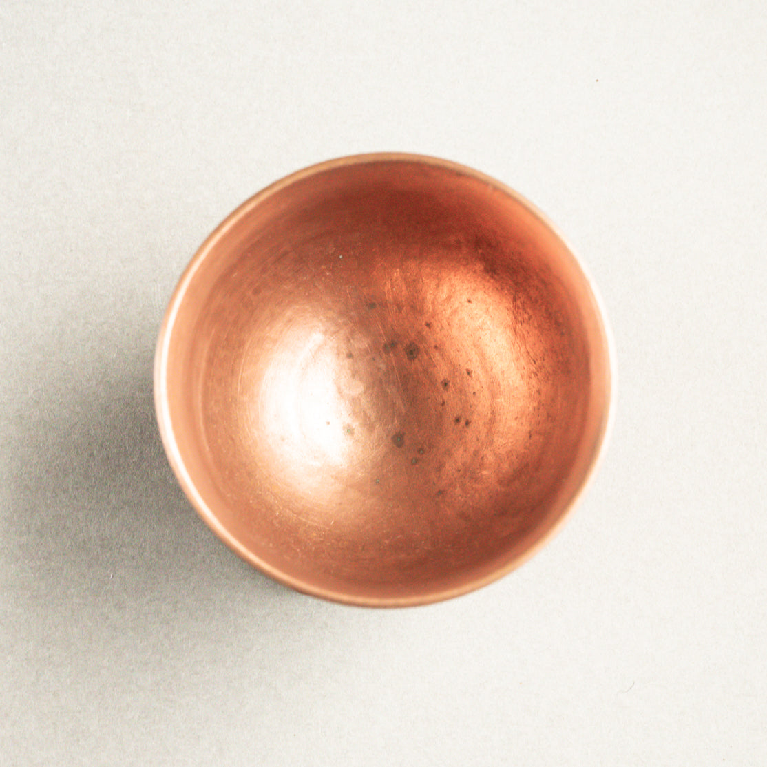 こちらは銅製のぐい呑で、銅なので美しい経年変化をします。丹精に数千回も叩き描いた槌目模様は美しさだけではなく、本体の強度を増す役割も果たしています。持ったときのひんやりとした重厚感がたまりません。お酒が好きな方へのギフトとしてオススメです。