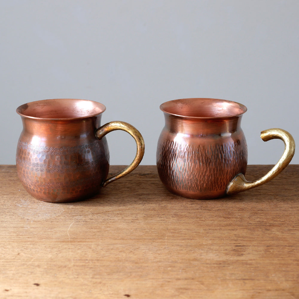 こちらは銅のマグカップで、銅は抗菌作用があるのできれいに保てます。2種類のデザインがありまして、1つは鍛金模様がかさね模様と丸槌目模様が交互になったボーダー柄、もう1つは大胆に取っ手が本体から離脱したもの。これが実に持ちやすく豪快なデザインが素敵です。さらにお写真のように、それぞれ表面の鍛金模様が異なります。そして持ち手は真鍮素材で出来ています。
