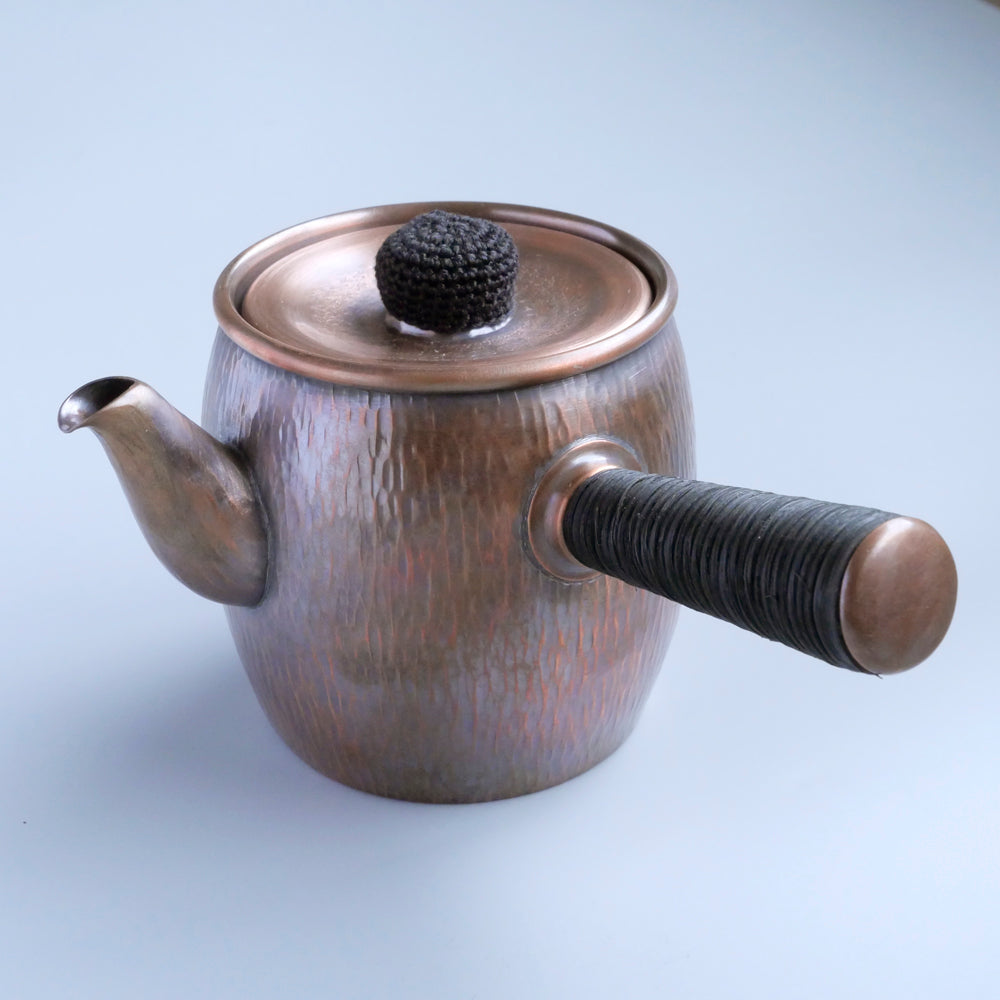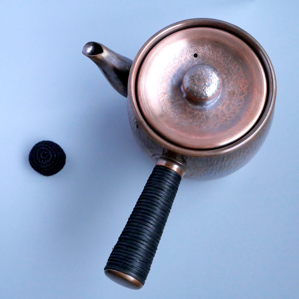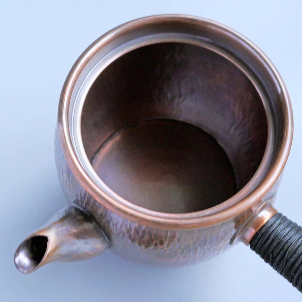こちらは銅の急須で、持ち手は熱くならないように蔓を巻き付け、さらに持ち蓋には手編みキャップも付いております。装着可能な金属の茶こしアミも付属。銅は熱伝導が良いため、濃いお茶が好きな方にオススメで、さらに抗菌作用があるのでお手入れも乾拭きだけで大丈夫です。銅は経年変化も美しく、まさに一生ものの逸品です。また丹精に数千回も叩き描いた槌目模様は美しさだけではなく、本体の強度を増す役割も果たしています。