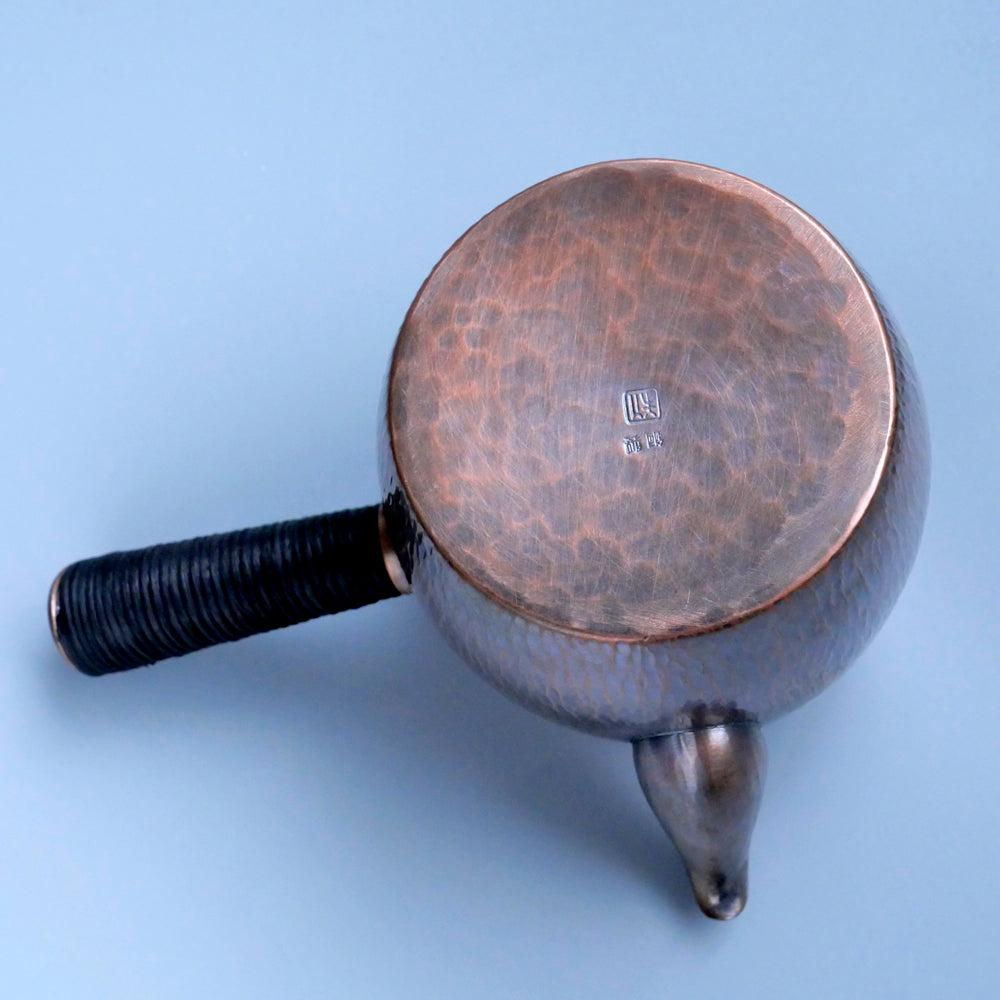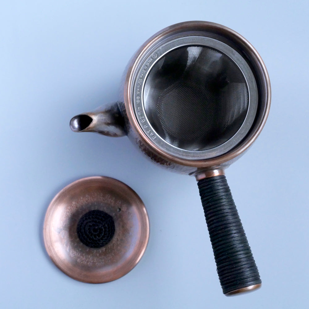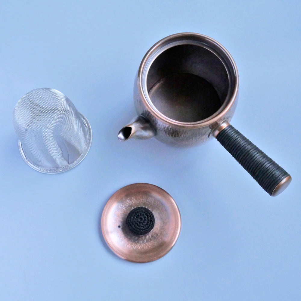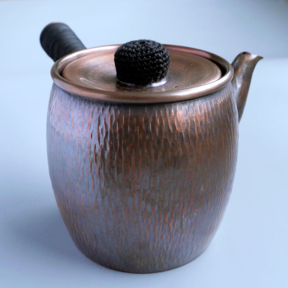 こちらは銅の急須で、持ち手は熱くならないように蔓を巻き付け、さらに持ち蓋には手編みキャップも付いております。装着可能な金属の茶こしアミも付属。銅は熱伝導が良いため、濃いお茶が好きな方にオススメで、さらに抗菌作用があるのでお手入れも乾拭きだけで大丈夫です。銅は経年変化も美しく、まさに一生ものの逸品です。また丹精に数千回も叩き描いた槌目模様は美しさだけではなく、本体の強度を増す役割も果たしています。