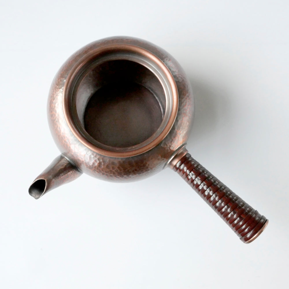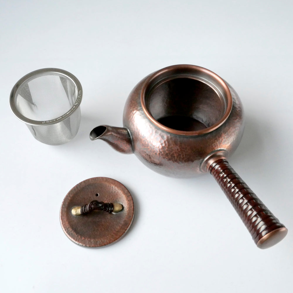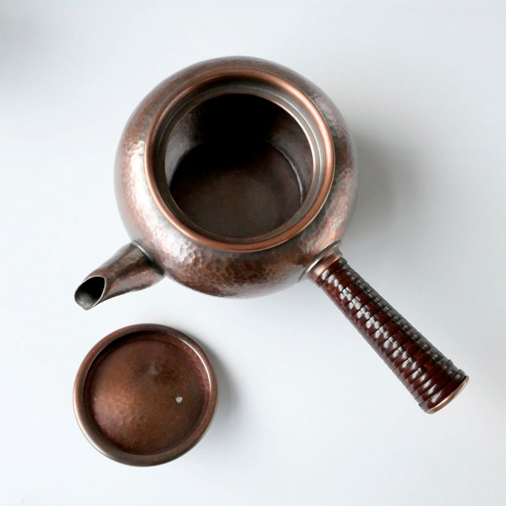 こちらは銅の急須で、持ち手は熱くならないように蔓を巻き付けております。装着可能な金属の茶こしアミも付属。銅は熱伝導が良いため、濃いお茶が好きな方にオススメで、さらに抗菌作用があるのでお手入れも乾拭きだけで大丈夫です。銅は経年変化も美しく、まさに一生ものの逸品です。また丹精に数千回も叩き描いた槌目模様は美しさだけではなく、本体の強度を増す役割も果たしています。