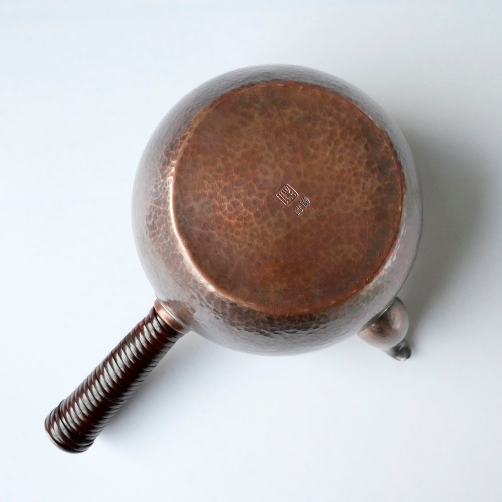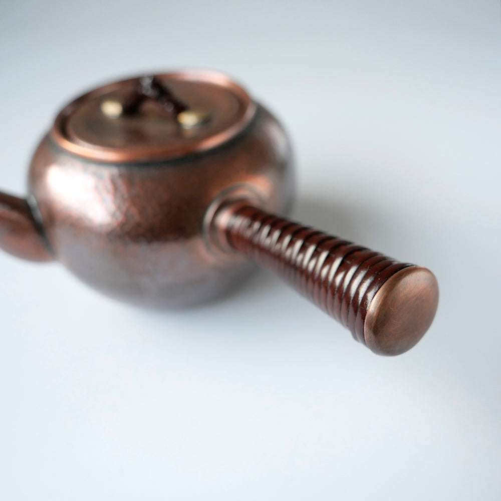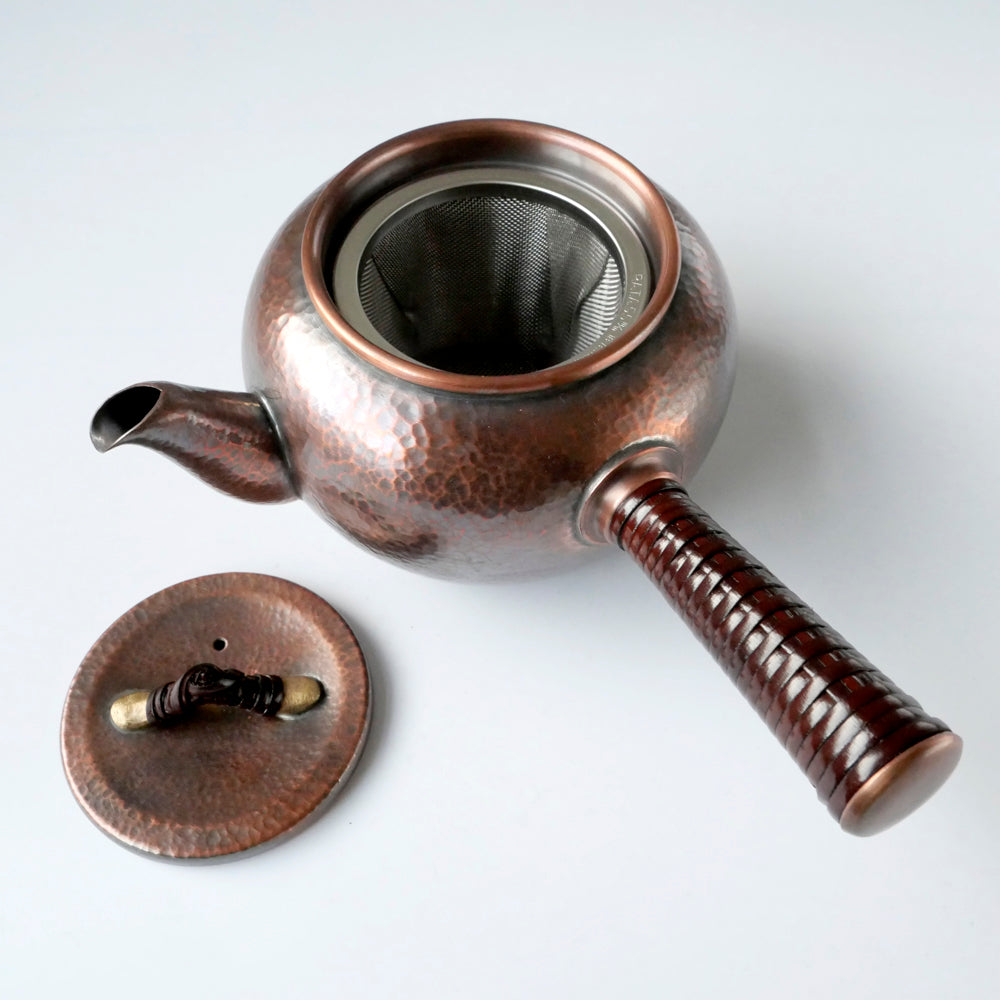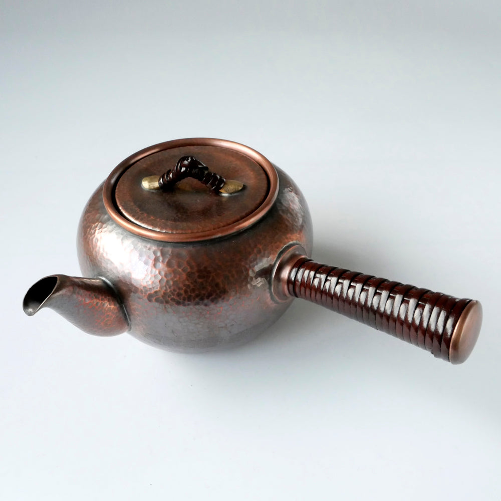 こちらは銅の急須で、持ち手は熱くならないように蔓を巻き付けております。装着可能な金属の茶こしアミも付属。銅は熱伝導が良いため、濃いお茶が好きな方にオススメで、さらに抗菌作用があるのでお手入れも乾拭きだけで大丈夫です。銅は経年変化も美しく、まさに一生ものの逸品です。また丹精に数千回も叩き描いた槌目模様は美しさだけではなく、本体の強度を増す役割も果たしています。
