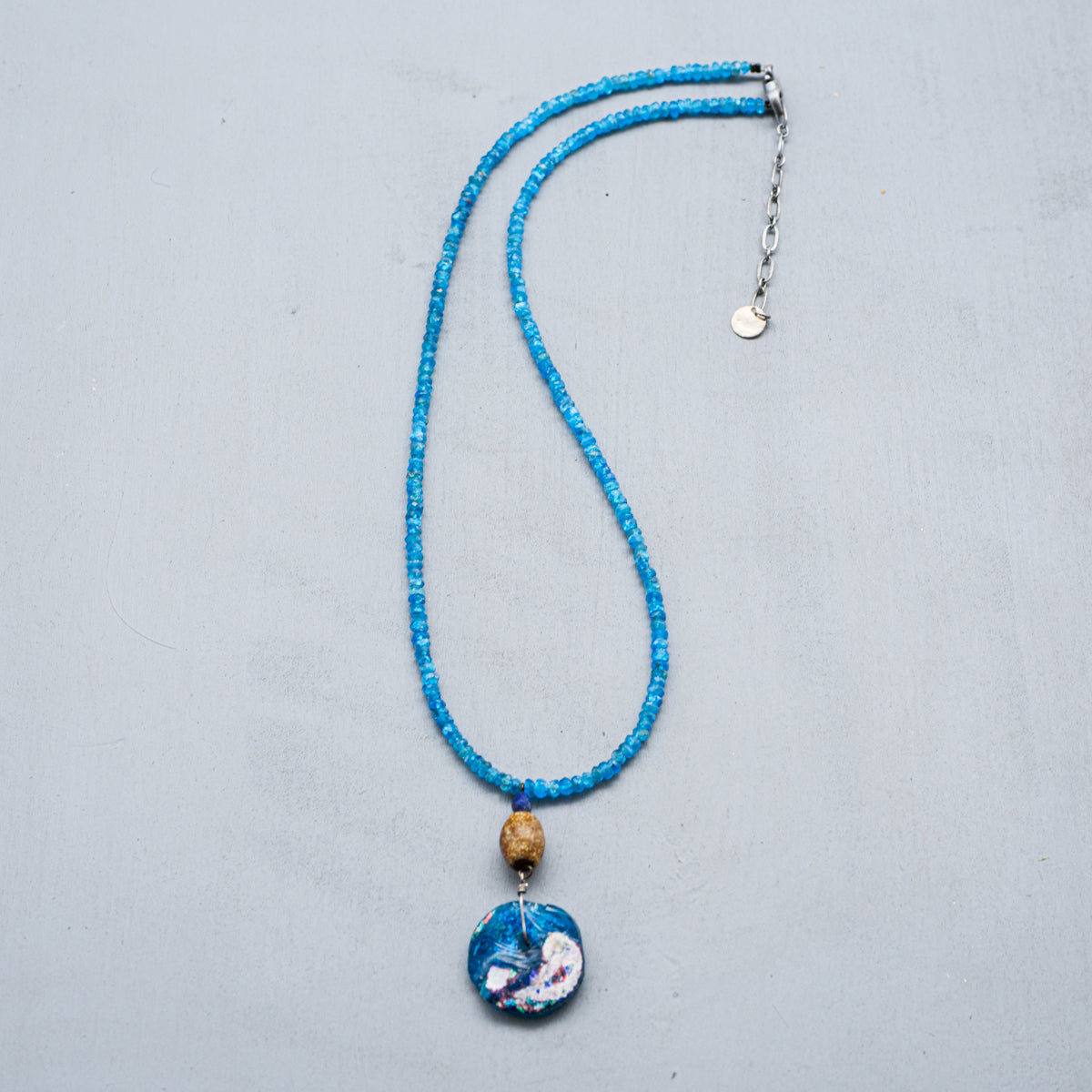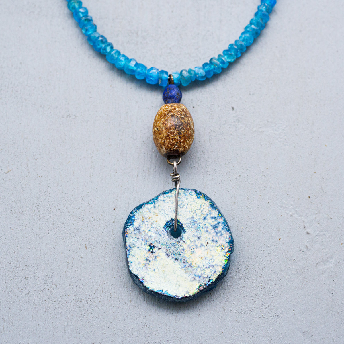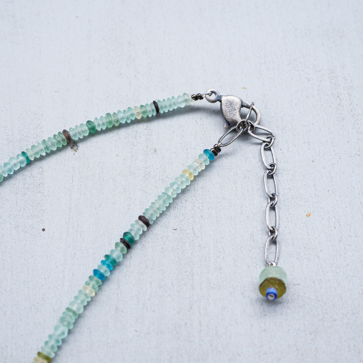 今から約1600年から2000年前のローマ時代からササン朝ペルシャ時代にかけて作られたガラス製品はローマングラスと呼ばれています。時代に渡る厳しい自然の中で、砂はガラスの表面に化学反応を起こさせ、銀化と云われる荘厳な輝きを与えました。こちらはそのローマングラスをアトリエサジさんが厳選しアクセサリーにしたもので、太陽光に反射した姿がとても美しいです。どちらもプラス40mmまで調整可能です。