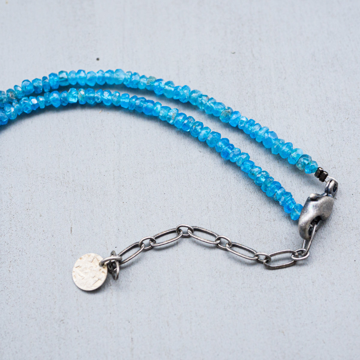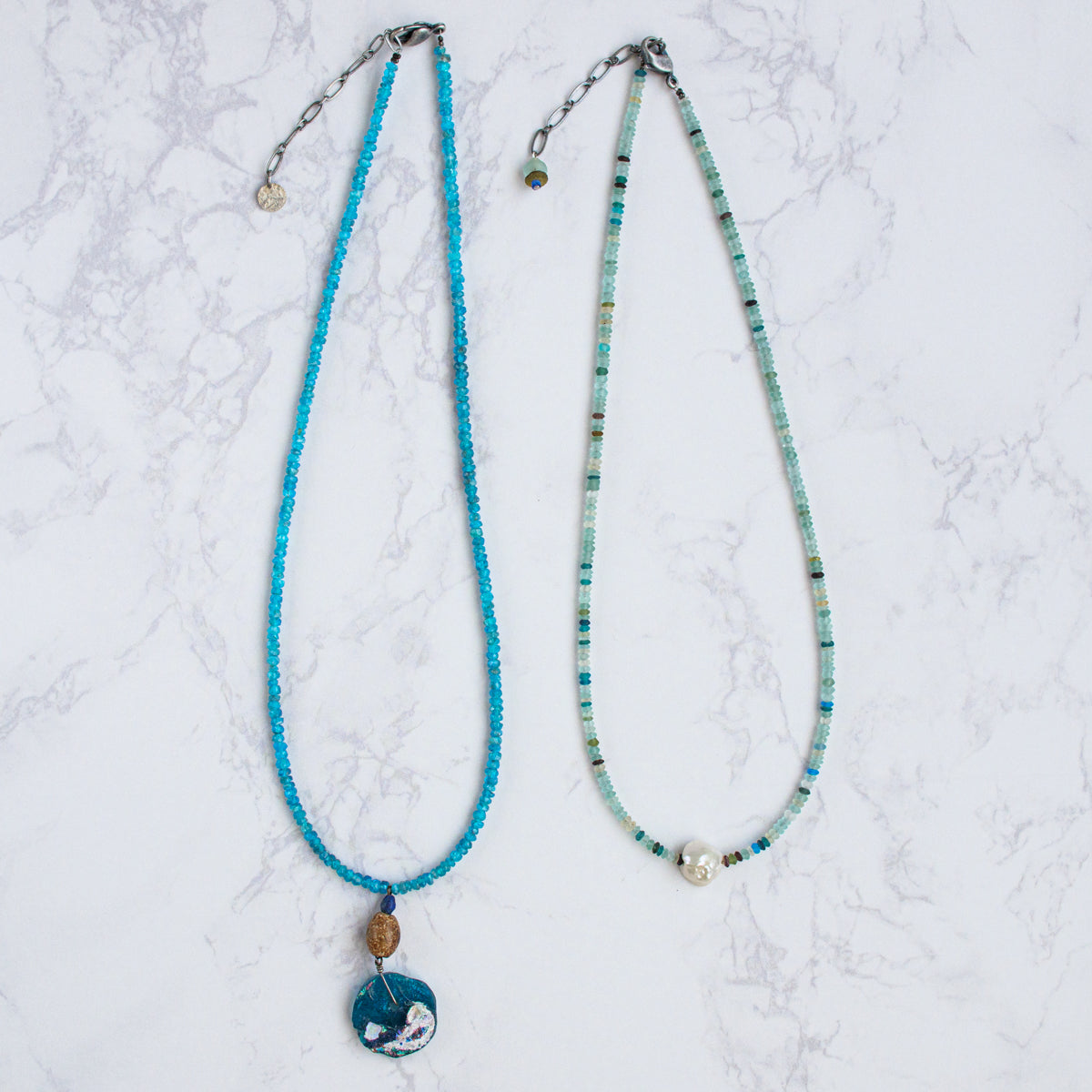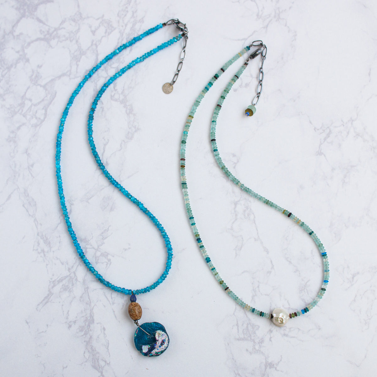 今から約1600年から2000年前のローマ時代からササン朝ペルシャ時代にかけて作られたガラス製品はローマングラスと呼ばれています。時代に渡る厳しい自然の中で、砂はガラスの表面に化学反応を起こさせ、銀化と云われる荘厳な輝きを与えました。こちらはそのローマングラスをアトリエサジさんが厳選しアクセサリーにしたもので、太陽光に反射した姿がとても美しいです。どちらもプラス40mmまで調整可能です。