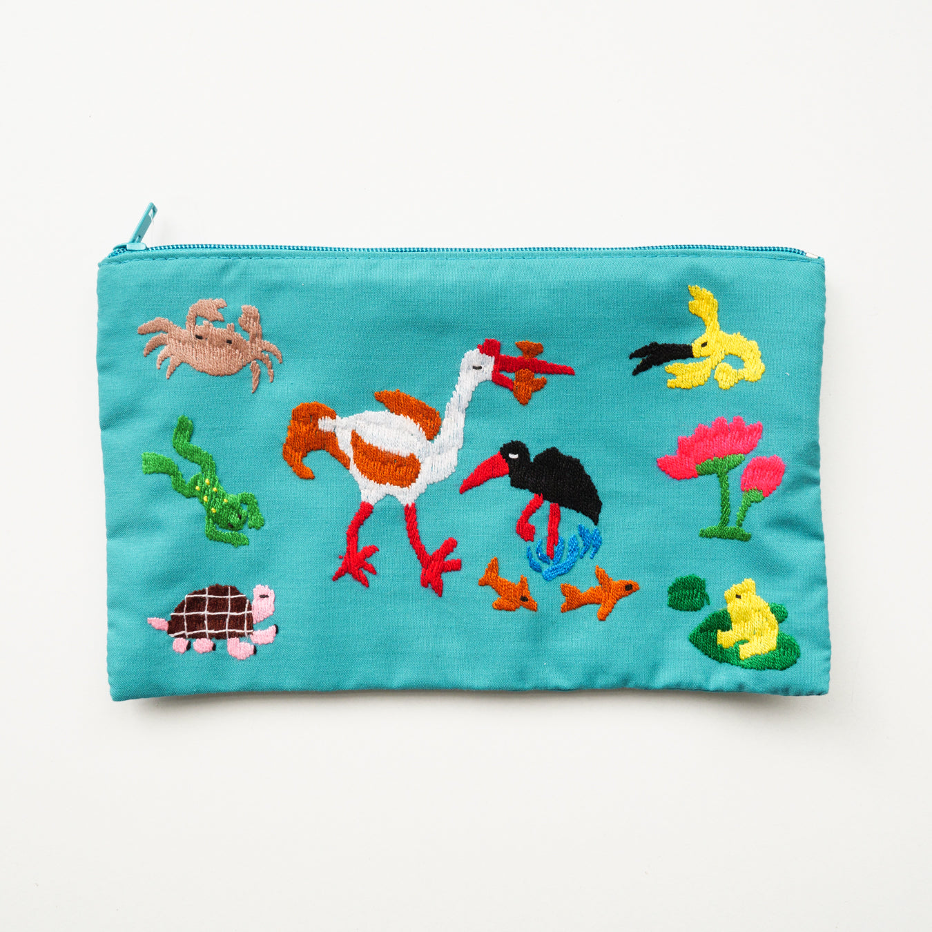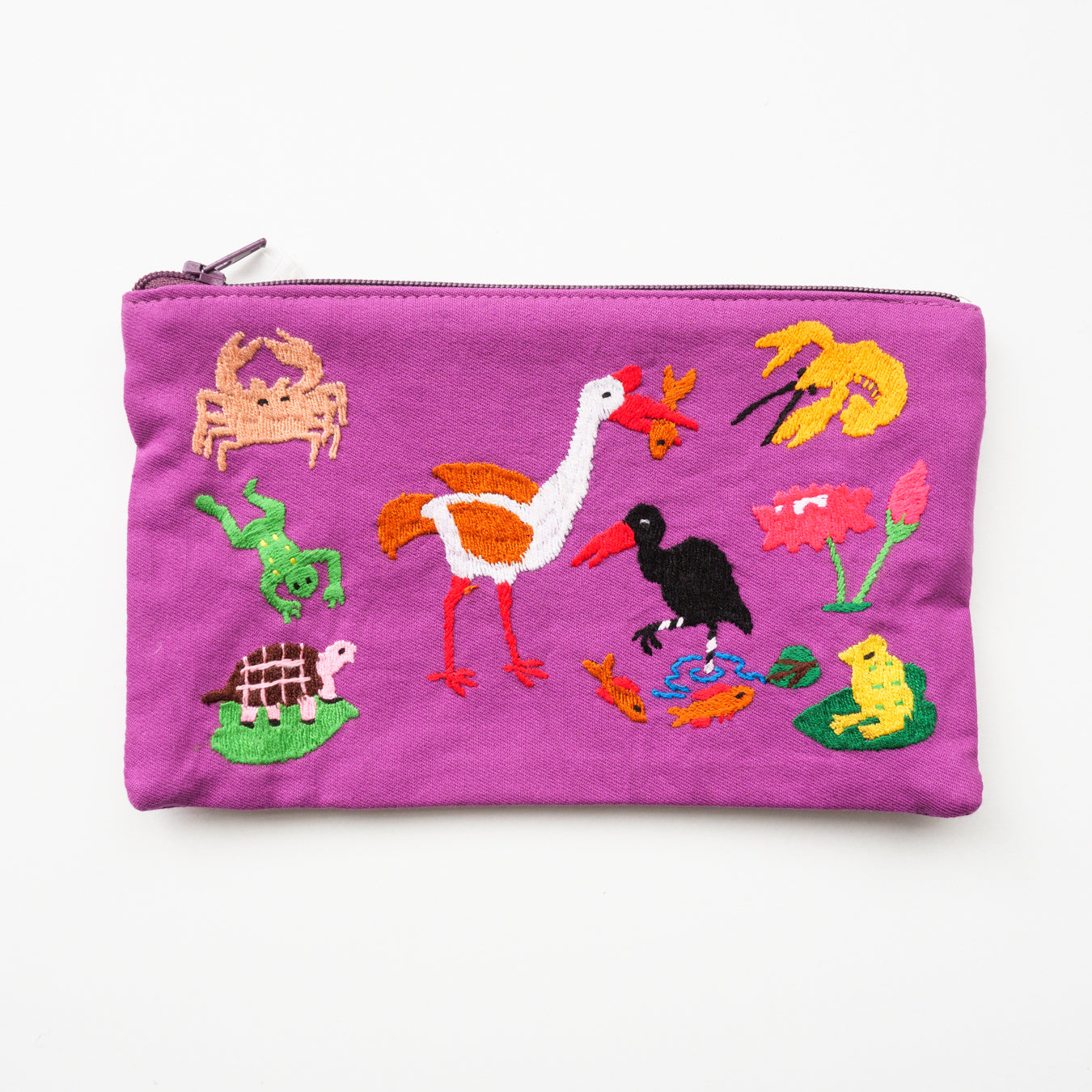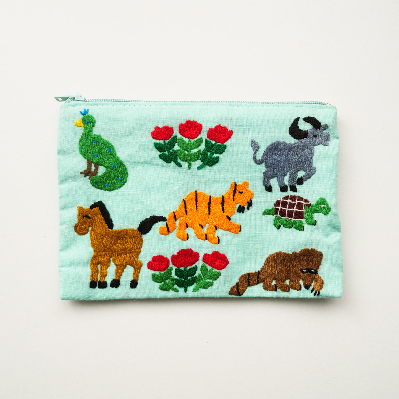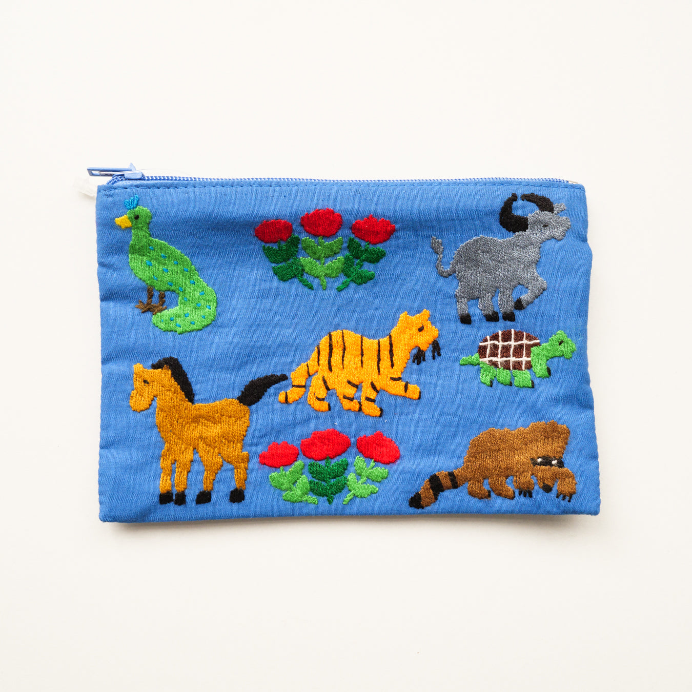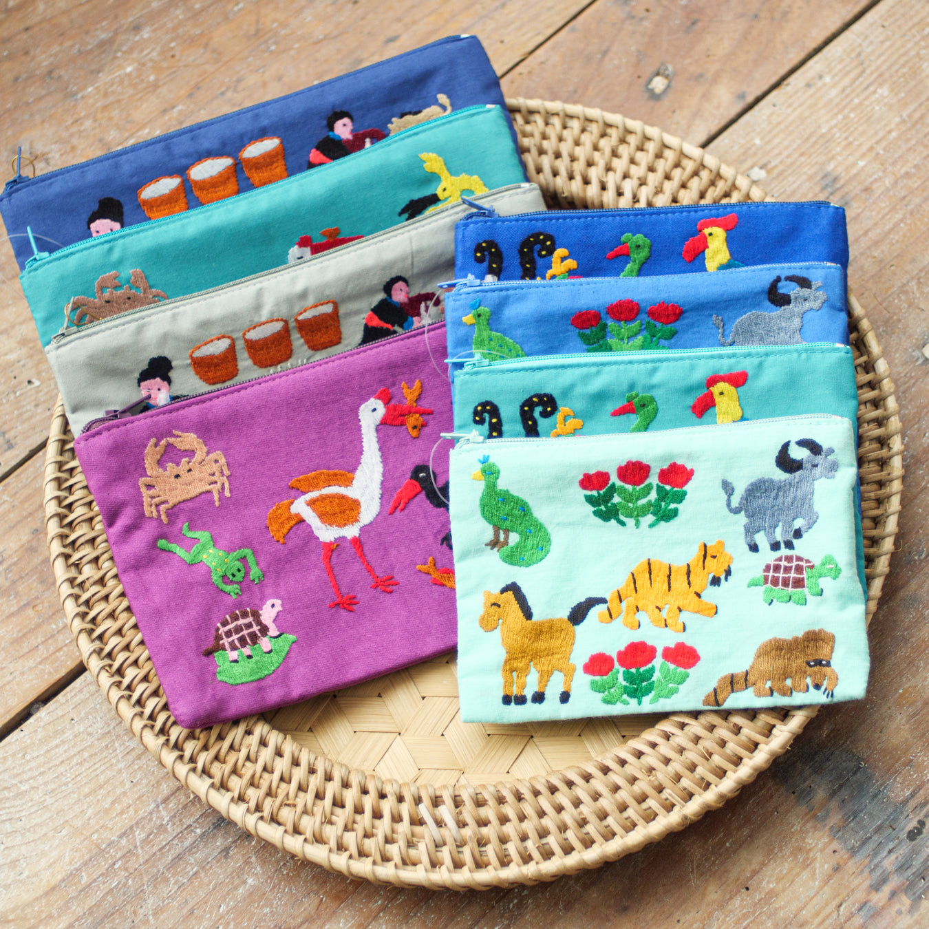 ラオス北部の少数民族モン族が作っている手刺繍のポーチ。こちらはラオスと日本で活動する日本人女性2人組ユニットThuadinのオリジナルデザイン。描かれている絵柄はどれも動物を描いているもので、手刺繍とは思えないほどの良く出来た刺繍です。内側はすべて表地と同じお色で、内側にポケットは付いておりません。