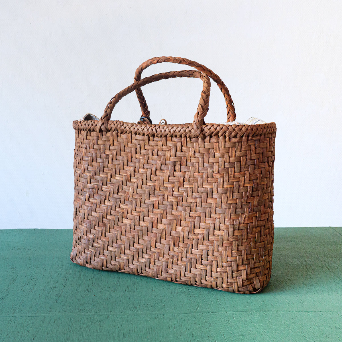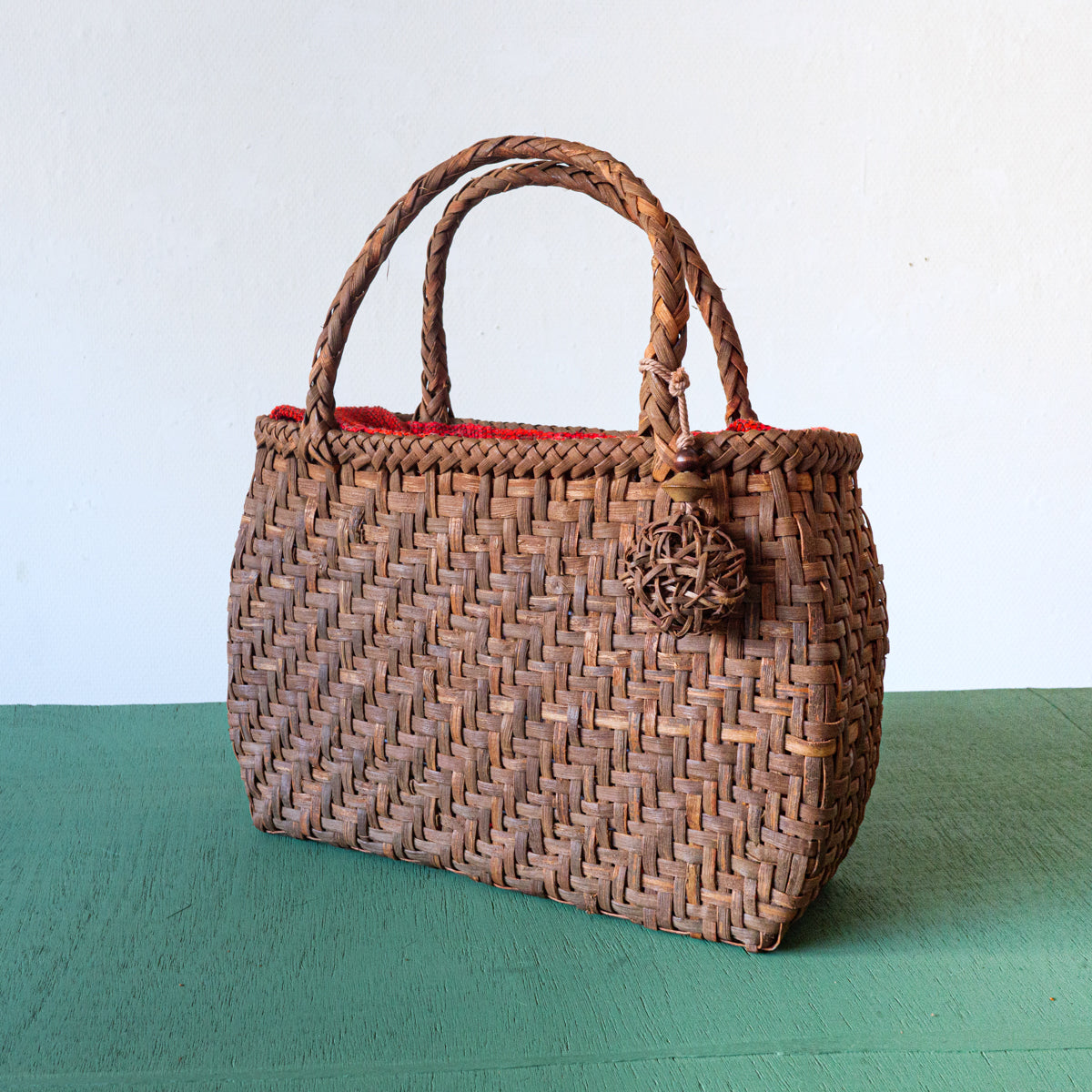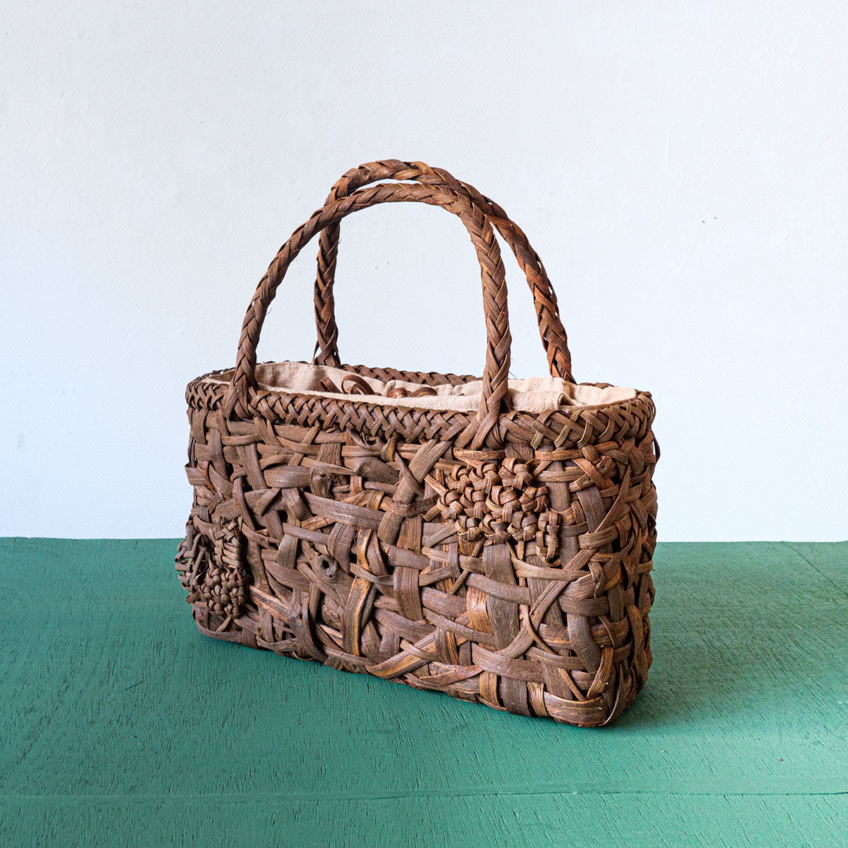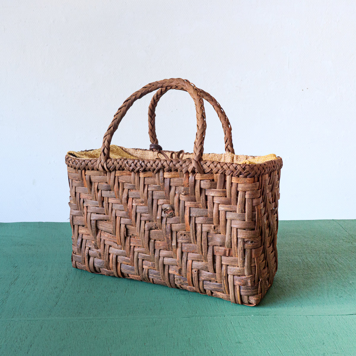新潟の裂織り/山葡萄作家さん仁科俊子氏による山葡萄のバスケット。地元の新潟の素材を使用し、内側には裂織や柿渋染め生地の中敷付き。山葡萄のカゴは親子3代使用できると言われる程丈夫で、使用するごとに、手の脂でとても美しい飴色に経年変化をしてきます。