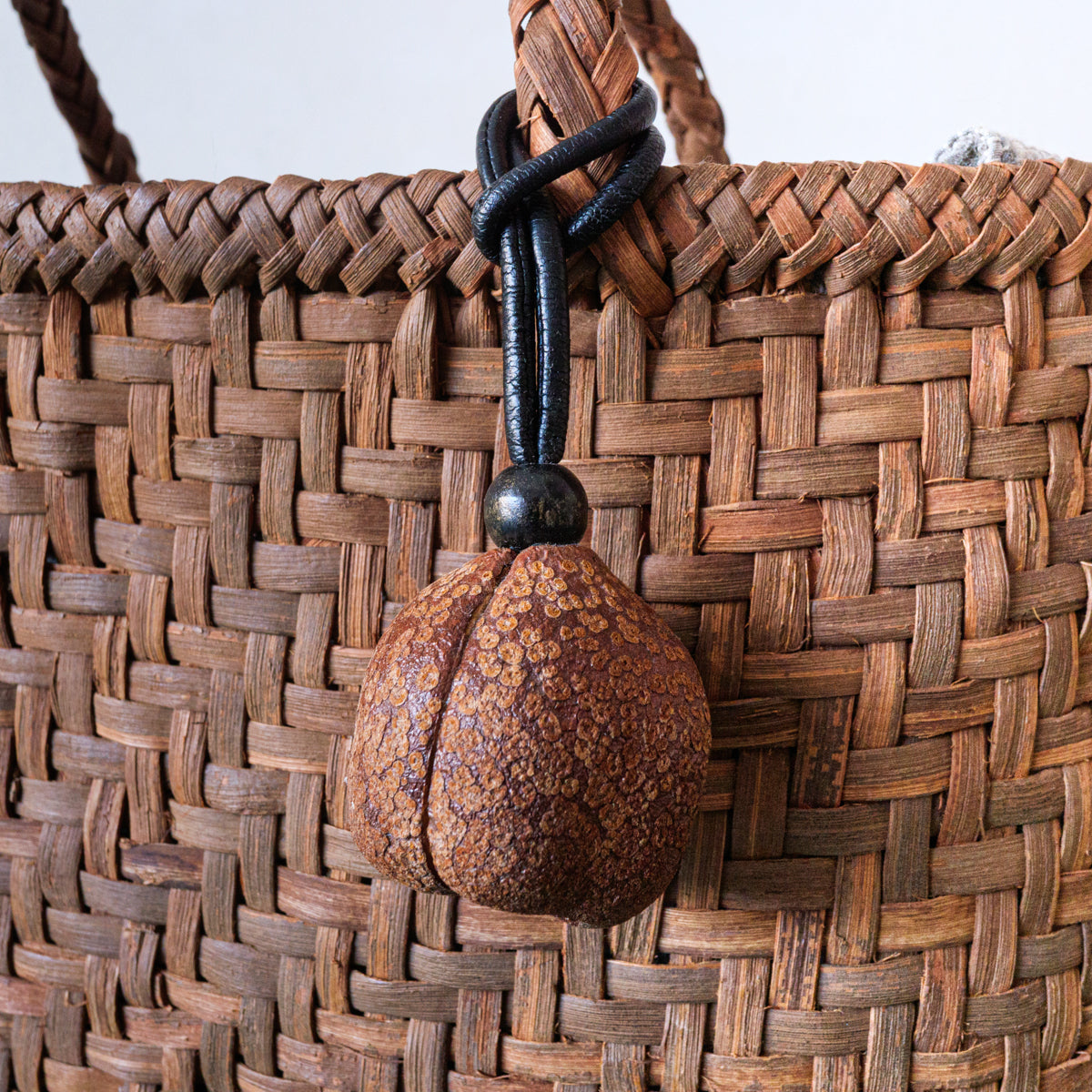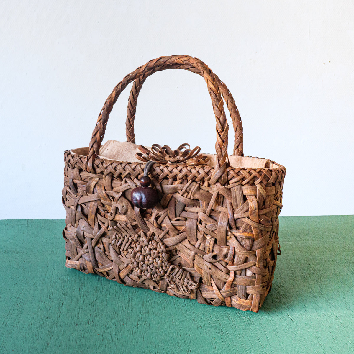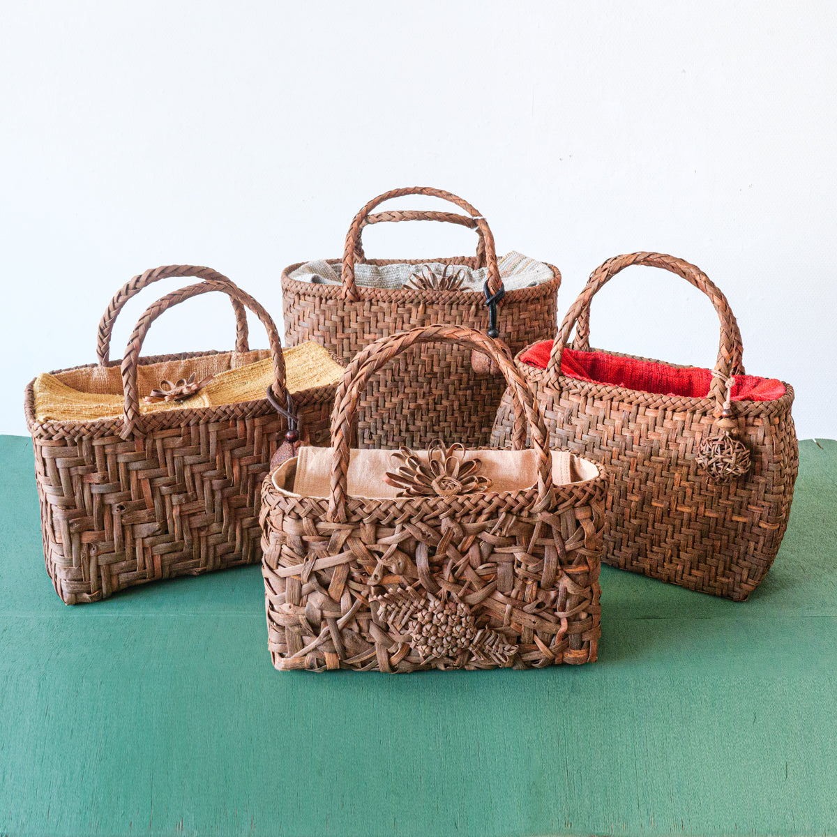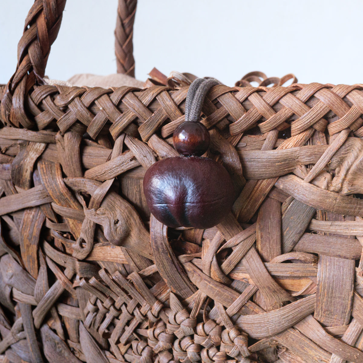 新潟の裂織り/山葡萄作家さん仁科俊子氏による山葡萄のバスケット。地元の新潟の素材を使用し、内側には裂織や柿渋染め生地の中敷付き。山葡萄のカゴは親子3代使用できると言われる程丈夫で、使用するごとに、手の脂でとても美しい飴色に経年変化をしてきます。