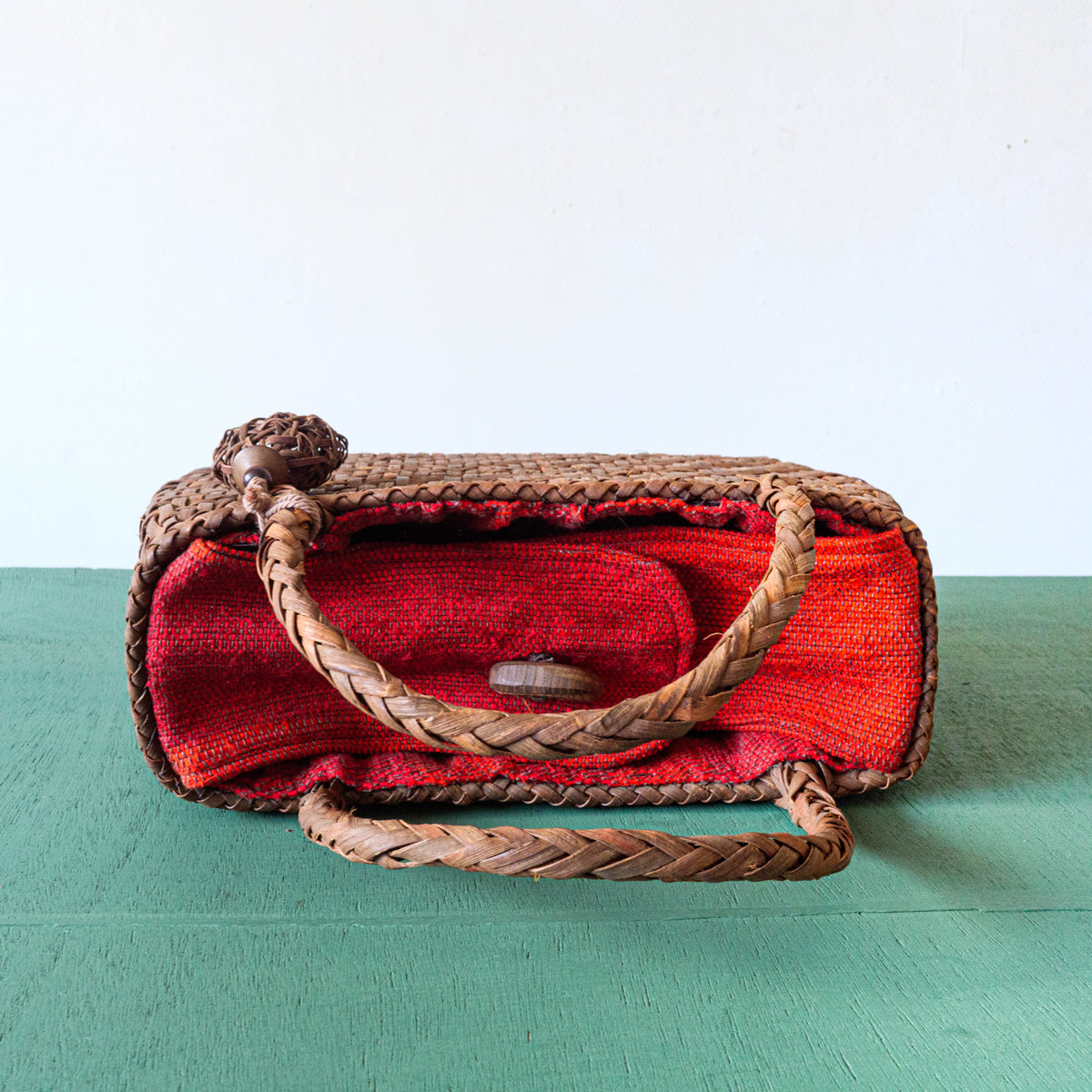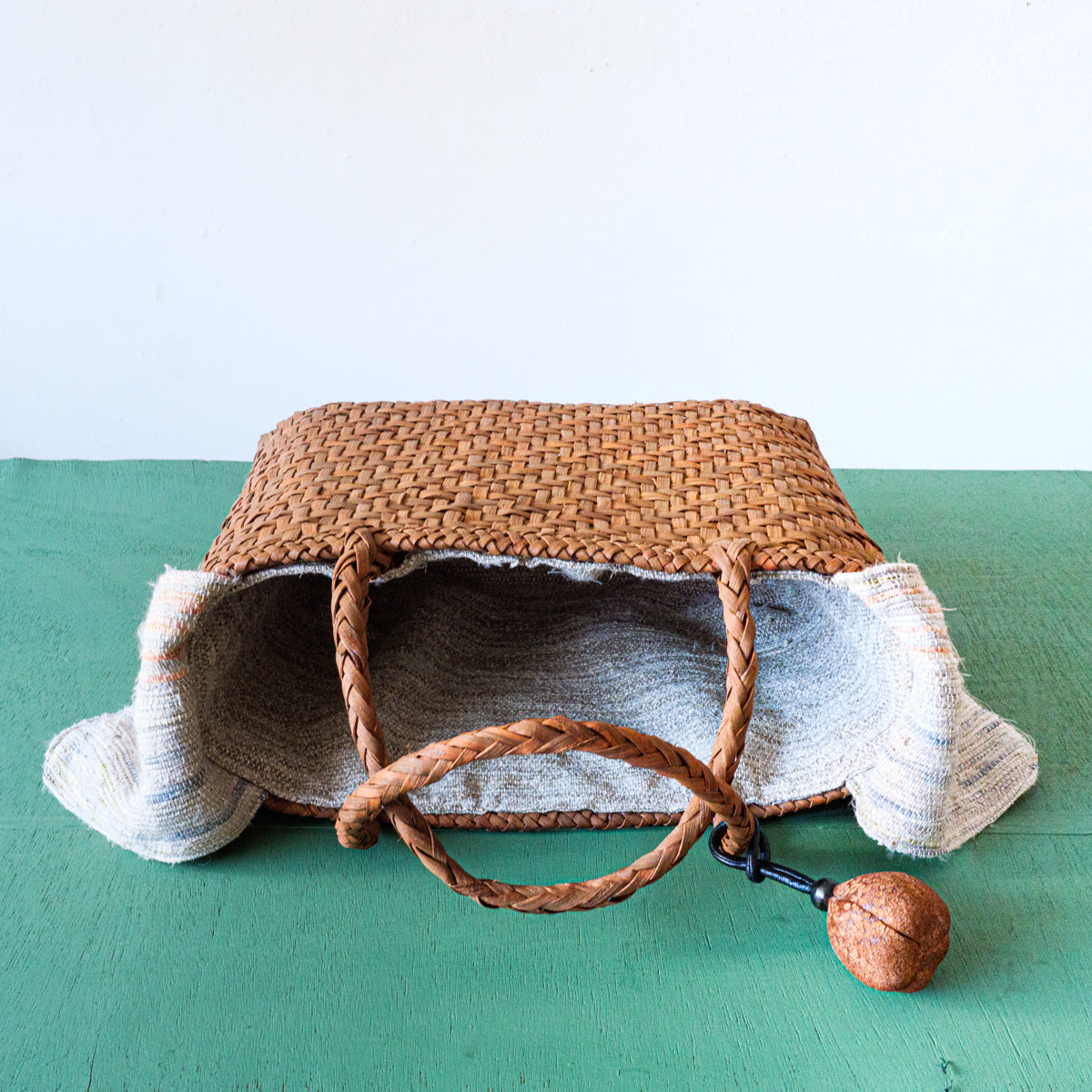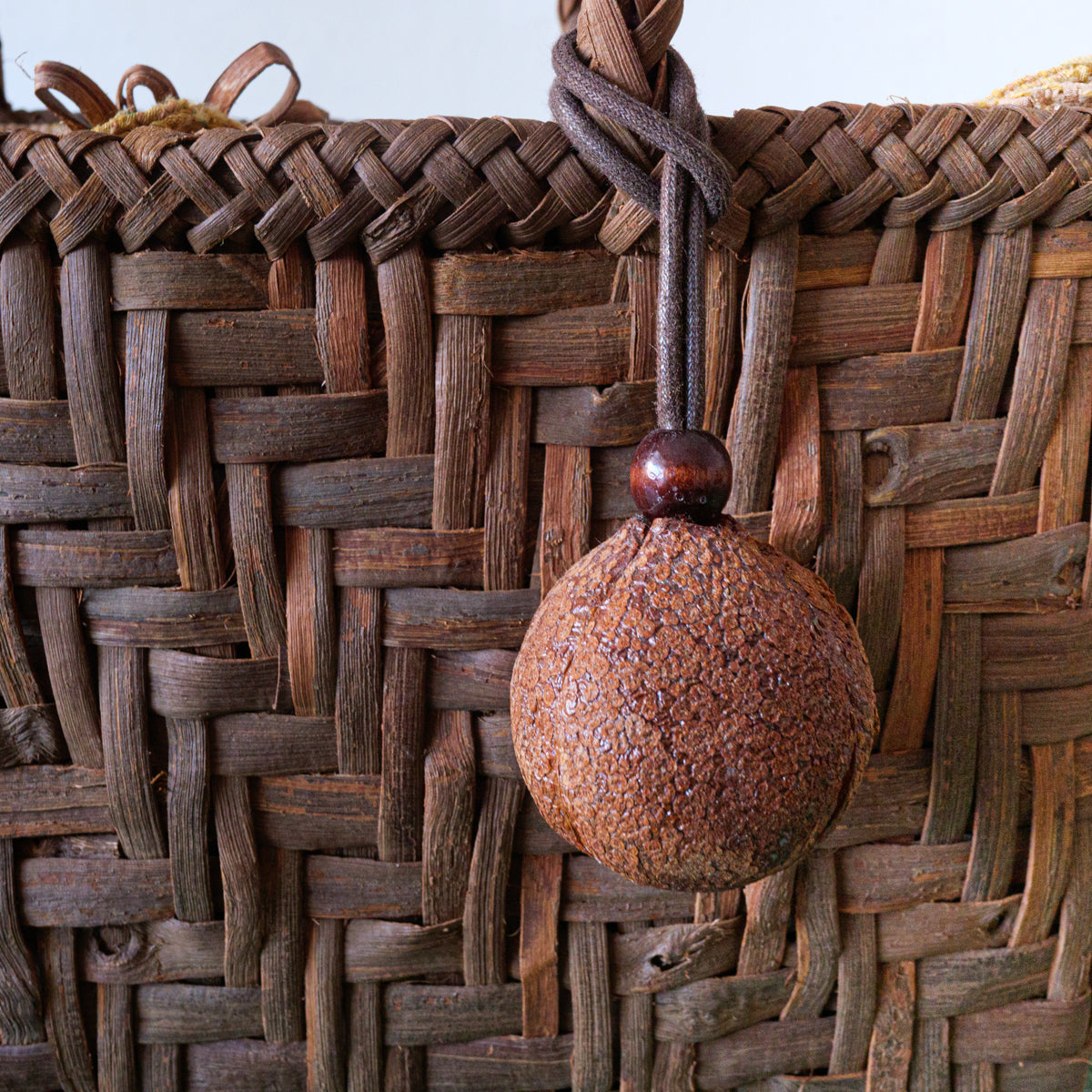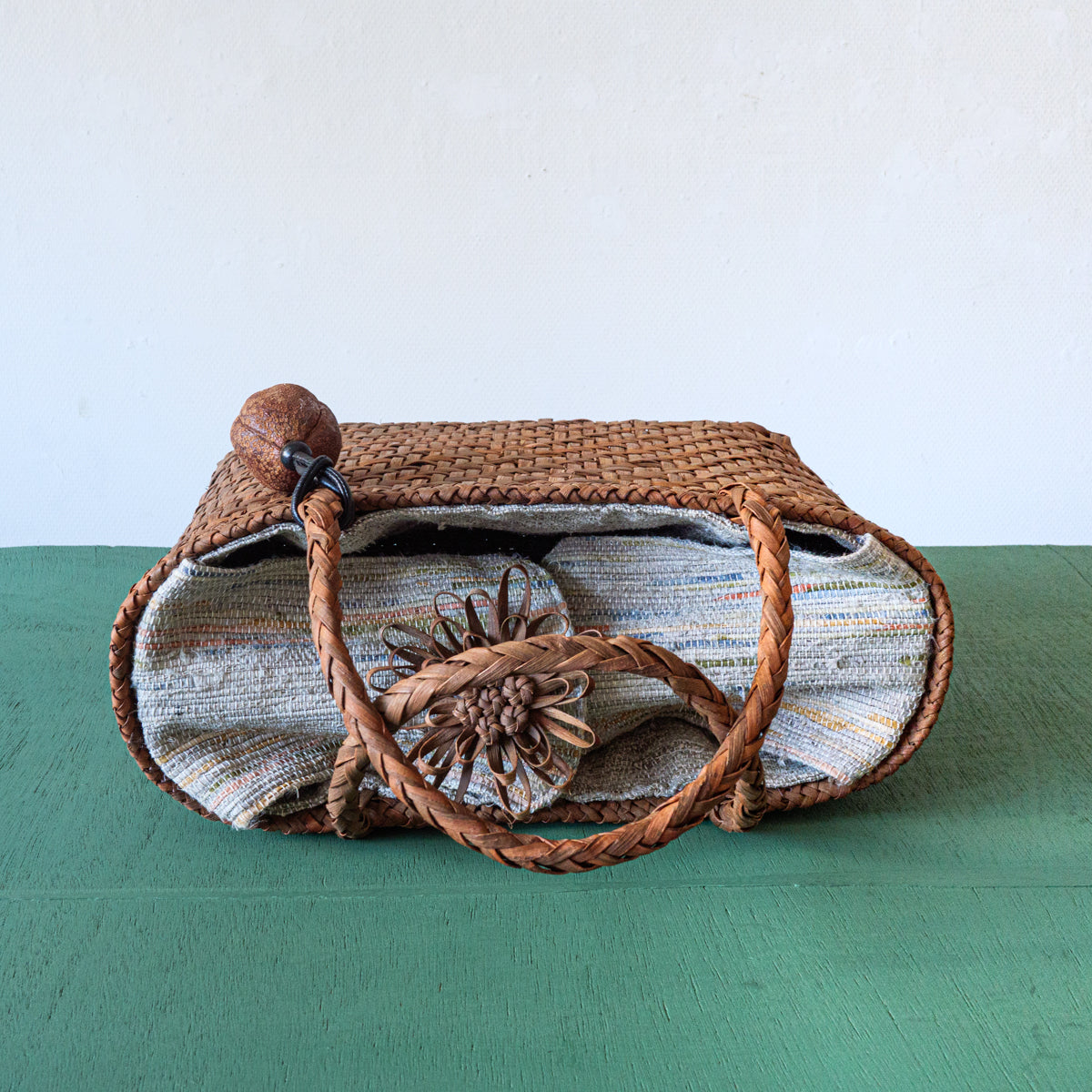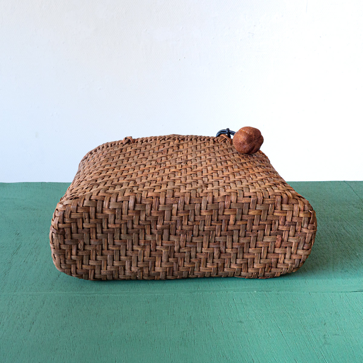 新潟の裂織り/山葡萄作家さん仁科俊子氏による山葡萄のバスケット。地元の新潟の素材を使用し、内側には裂織や柿渋染め生地の中敷付き。山葡萄のカゴは親子3代使用できると言われる程丈夫で、使用するごとに、手の脂でとても美しい飴色に経年変化をしてきます。