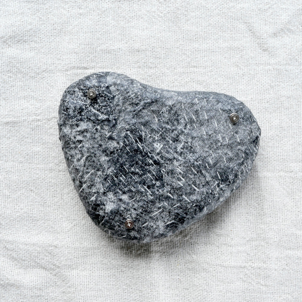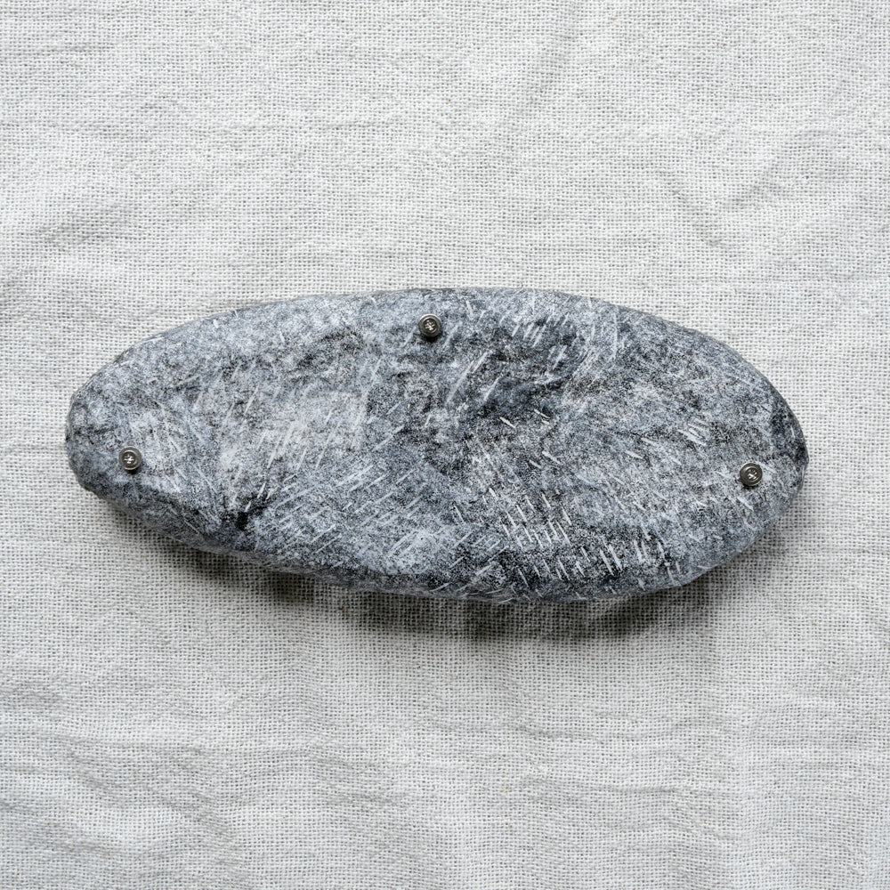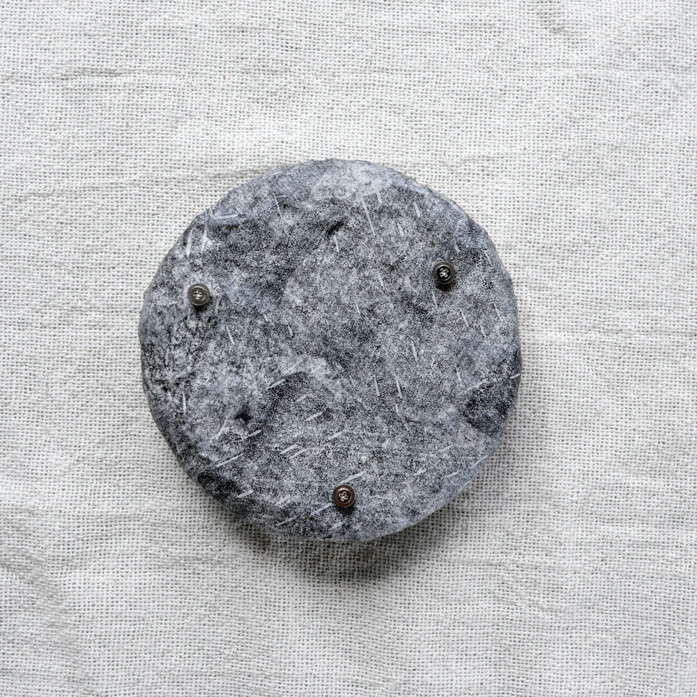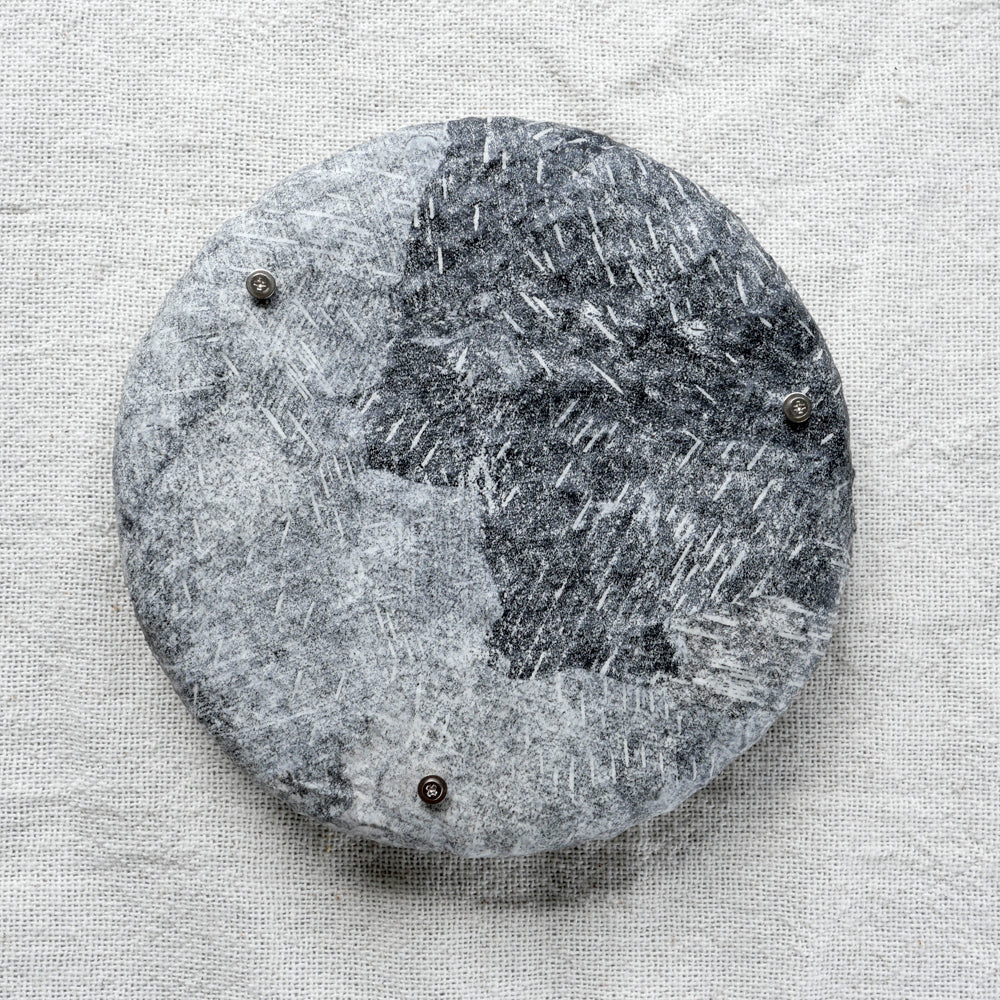 台湾の美術作家、林希羽(V vv studio)による 銅版画オブジェ作品。芯の部分を茶紙で成形し、表面に幾重にも習字の半紙を重ね、さらに表面をグルーで固めて制作したもの。刺子という作品タイトルは、さらにそこに刺子の目のような線を細かく入れている所から来ています。見た目は石そのものですが、持つと軽くて風合いを感じられるという不思議な気分にさせてくれるトレイたち。最後の写真のように、裏面には置いたときの安定感を得るために、3点でネジがとめてあります。固くてしっかりしているので、アクセサリー入れとしてもオススメです。