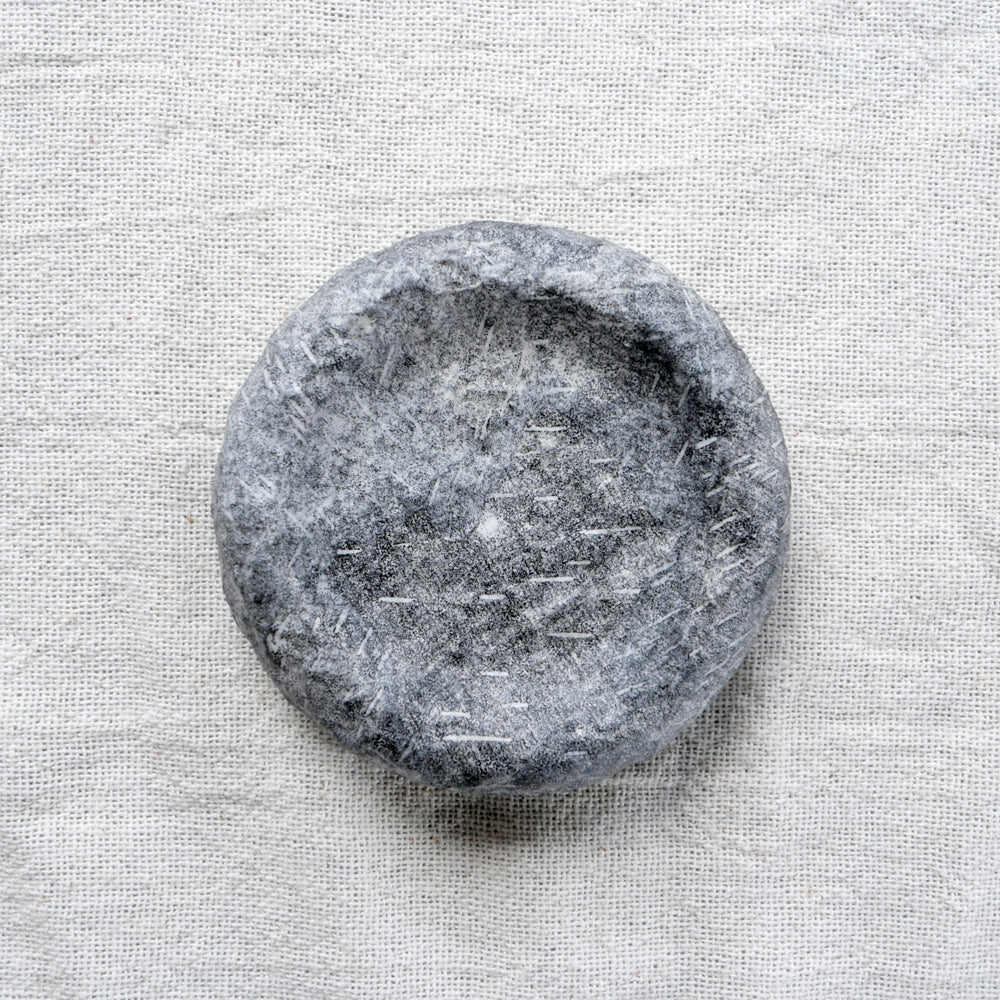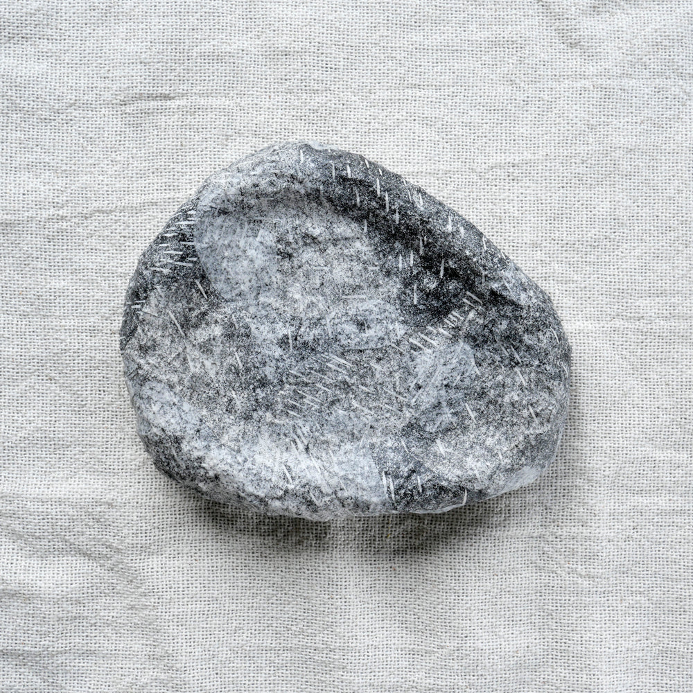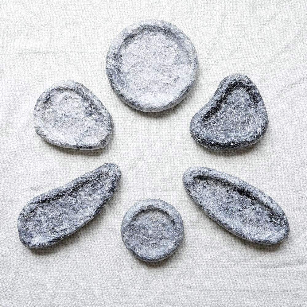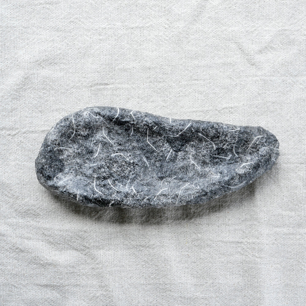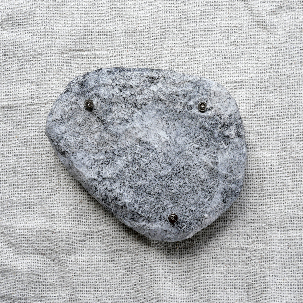 台湾の美術作家、林希羽(V vv studio)による 銅版画オブジェ作品。芯の部分を茶紙で成形し、表面に幾重にも習字の半紙を重ね、さらに表面をグルーで固めて制作したもの。刺子という作品タイトルは、さらにそこに刺子の目のような線を細かく入れている所から来ています。見た目は石そのものですが、持つと軽くて風合いを感じられるという不思議な気分にさせてくれるトレイたち。最後の写真のように、裏面には置いたときの安定感を得るために、3点でネジがとめてあります。固くてしっかりしているので、アクセサリー入れとしてもオススメです。
