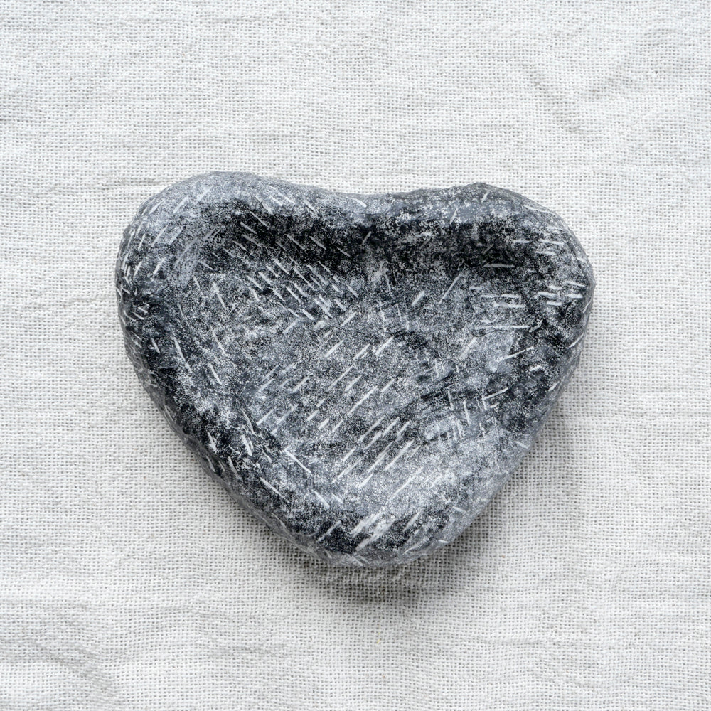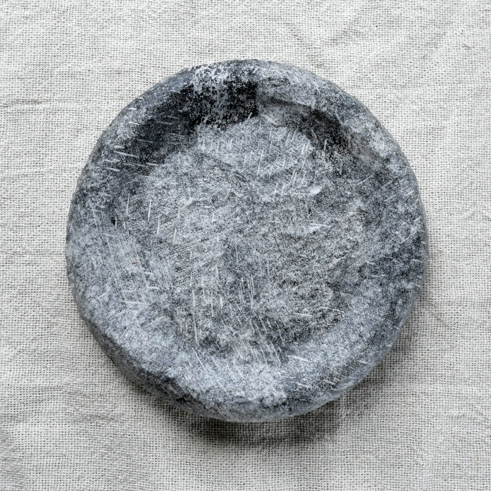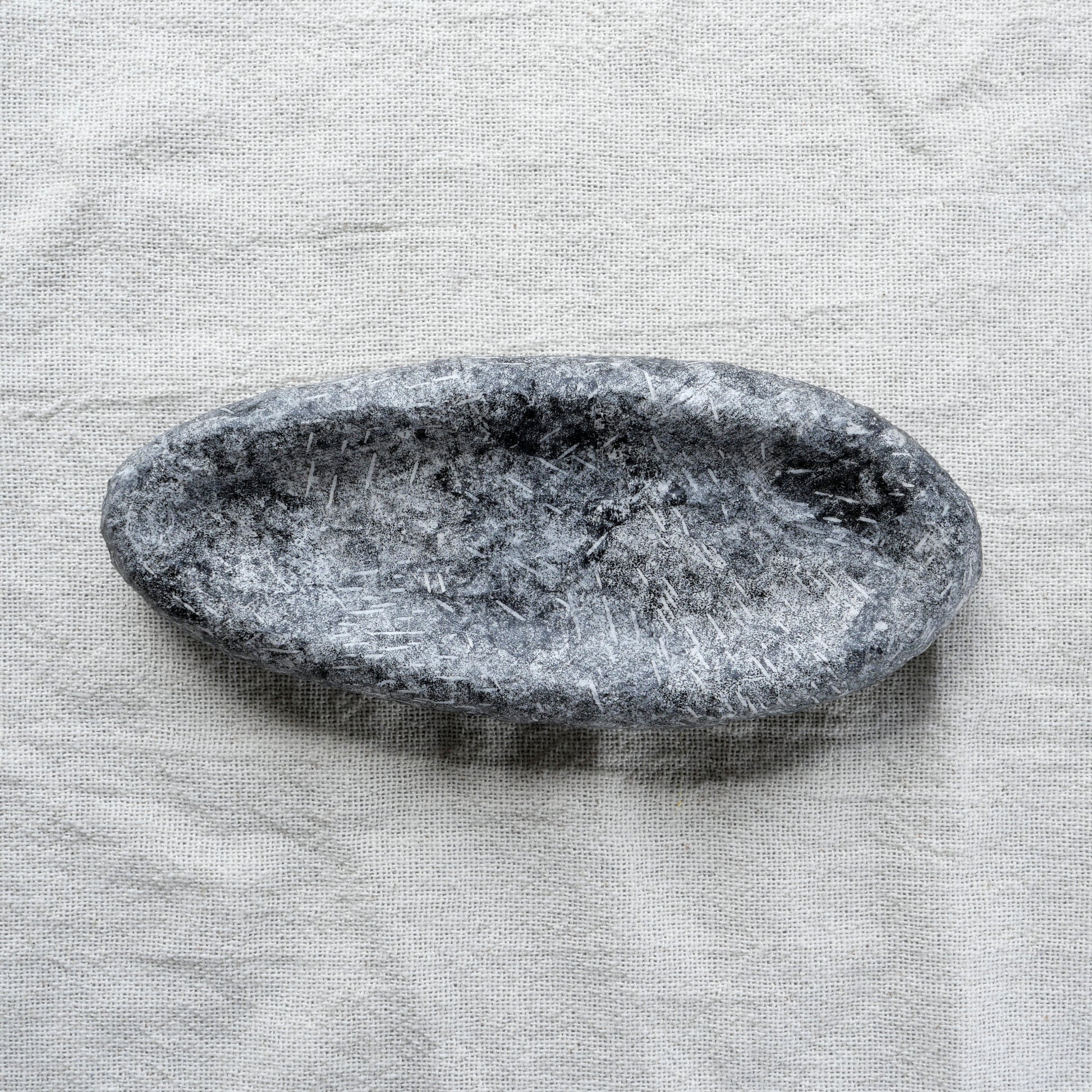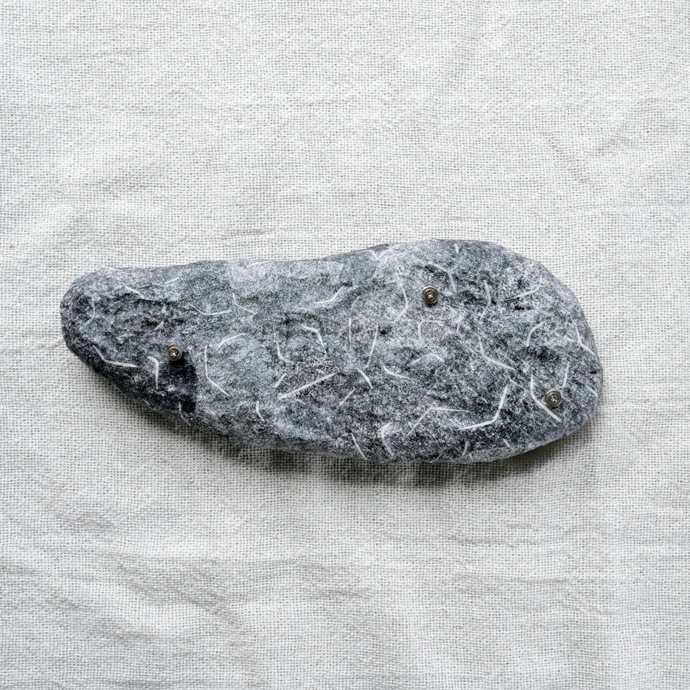 台湾の美術作家、林希羽(V vv studio)による 銅版画オブジェ作品。芯の部分を茶紙で成形し、表面に幾重にも習字の半紙を重ね、さらに表面をグルーで固めて制作したもの。刺子という作品タイトルは、さらにそこに刺子の目のような線を細かく入れている所から来ています。見た目は石そのものですが、持つと軽くて風合いを感じられるという不思議な気分にさせてくれるトレイたち。最後の写真のように、裏面には置いたときの安定感を得るために、3点でネジがとめてあります。固くてしっかりしているので、アクセサリー入れとしてもオススメです。
