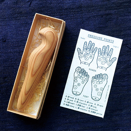鹿児島県屋久島の樹齢1000年以上の屋久杉を使用したツボ押し棒。多様な大きさのカーブ(曲面)を利用し、適宜にツボを押せるよう鳥の形状にしました。屋久島の杉工房、杉の舎さんに制作依頼したもので、3Dで描いたデザインを見事なまでに手作業で削りだし再現してくれました。滑らかなフォルムの表面にはさらに蜜蝋を塗り手触りを良くしてあります。杉の香り高い匂いが心地よく、贈呈品としてもお勧めです。ツボ押しダイアグラム付き。