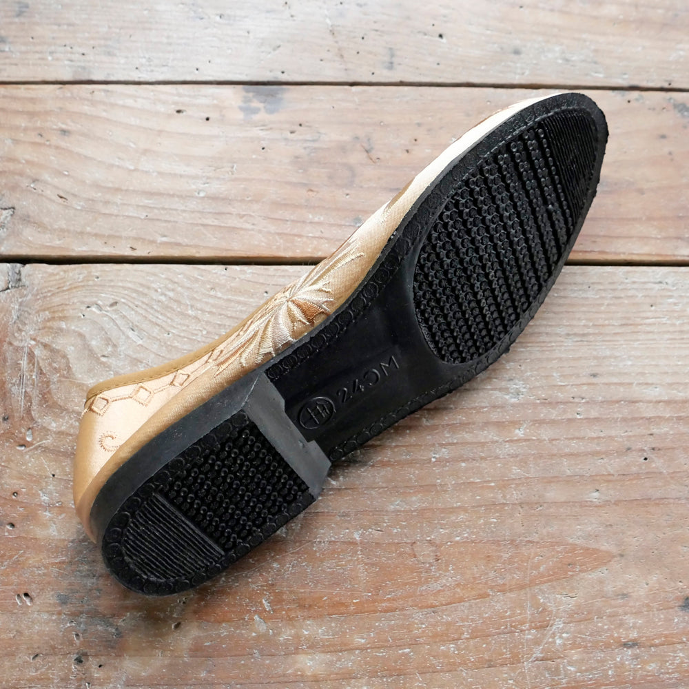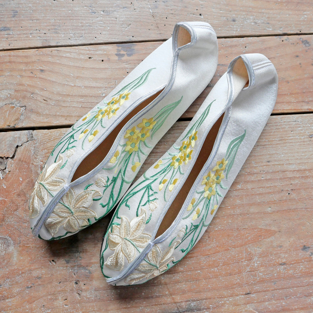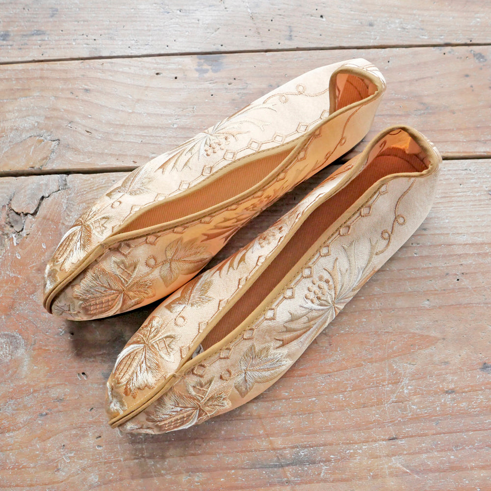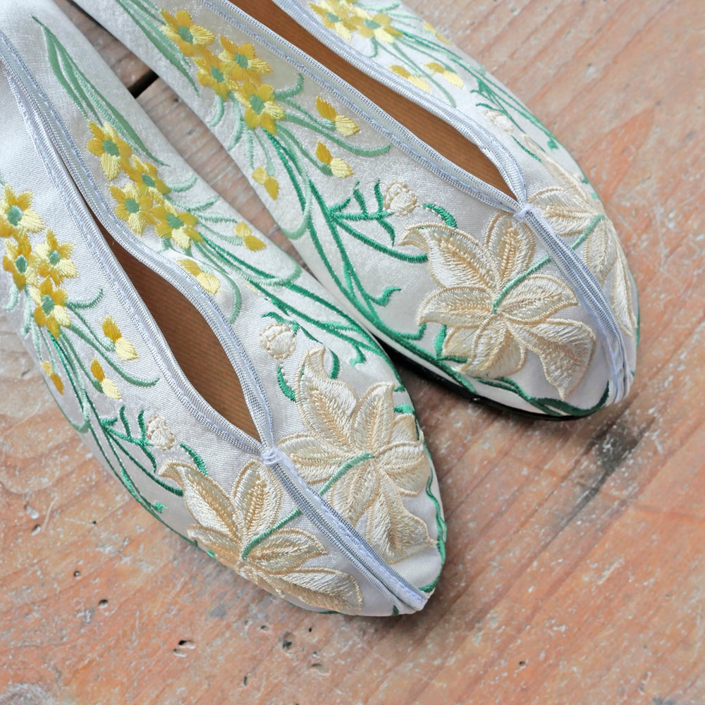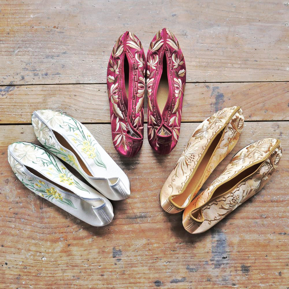台湾南部の街、台南の工房にて生地から切って手作業により作られています。底がペッタンコ(かかと15mm)になっている所が可愛らしく、ソール部が丈夫な作りなので長い間履いて頂けます。足のつま先から甲の部分にかけて小さめの作りなので、サイズで迷われている方は、0.5cmから1cm大きめのものをお選びいただき、少し大きい場合は中敷きで調整して頂くと夏は素足で、肌寒い時期はタイツや靴下などとも合わせていただけます。