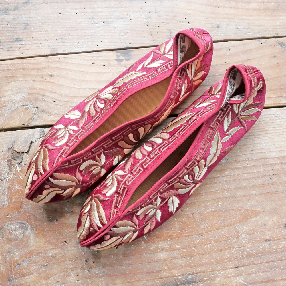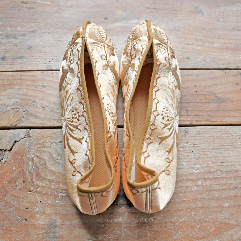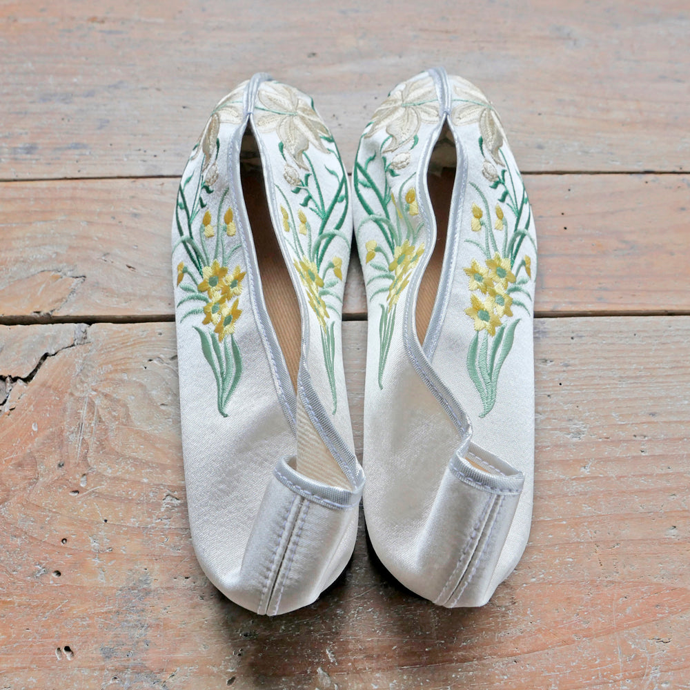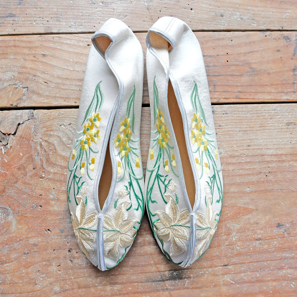台湾南部の街、台南の工房にて生地から切って手作業により作られています。底がペッタンコ(かかと15mm)になっている所が可愛らしく、ソール部が丈夫な作りなので長い間履いて頂けます。足のつま先から甲の部分にかけて小さめの作りなので、サイズで迷われている方は、0.5cmから1cm大きめのものをお選びいただき、少し大きい場合は中敷きで調整して頂くと夏は素足で、肌寒い時期はタイツや靴下などとも合わせていただけます。