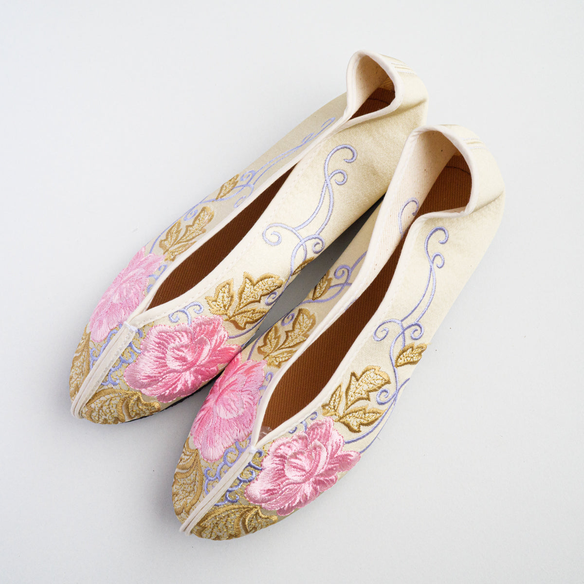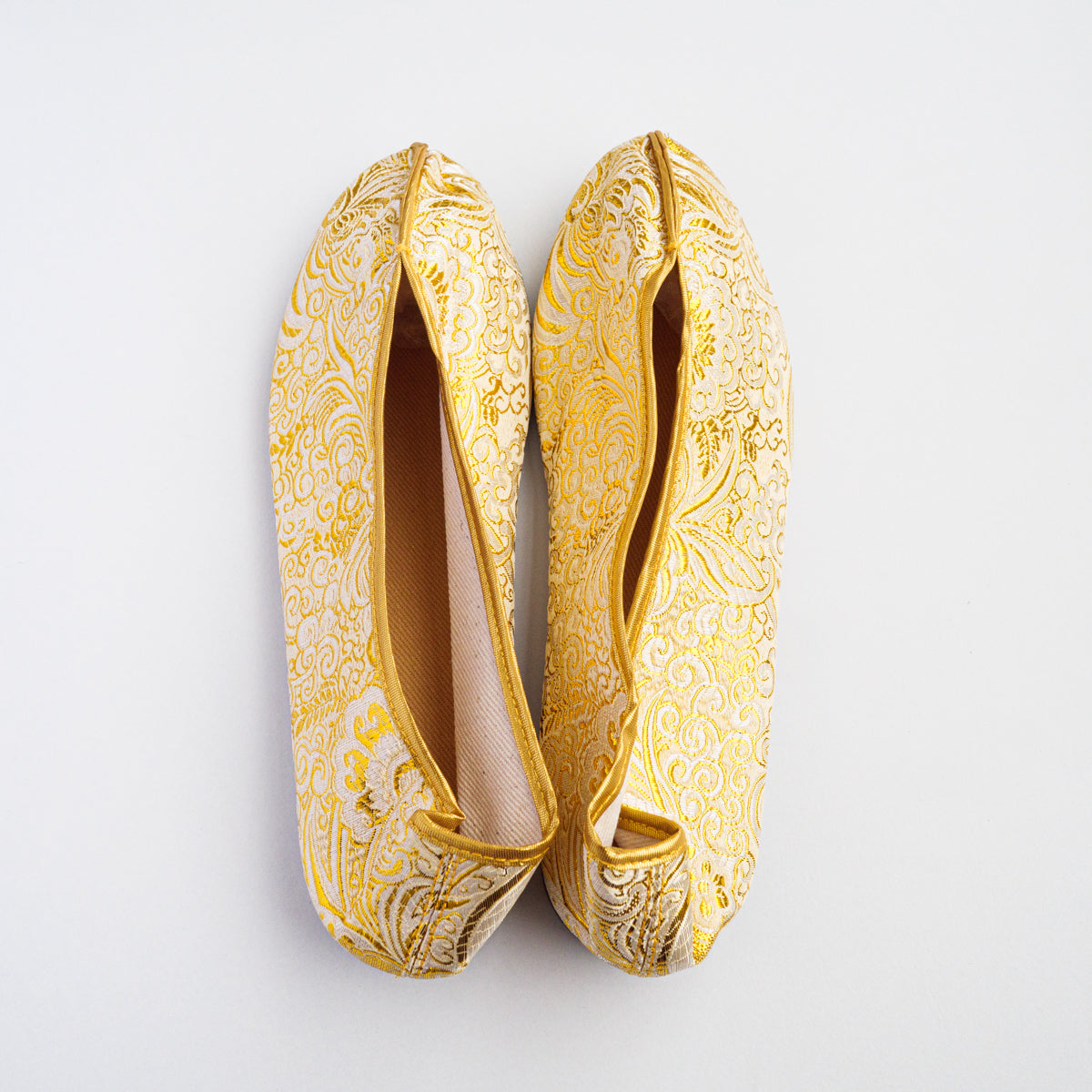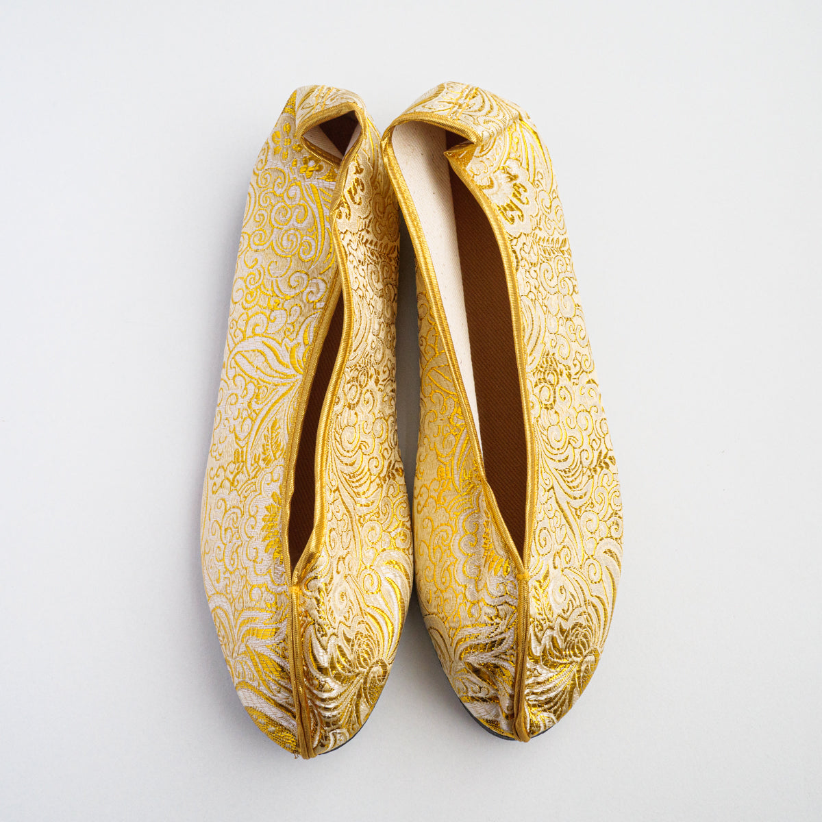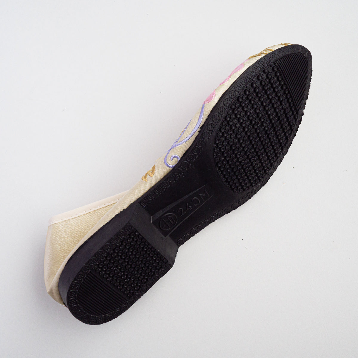 台湾南部の街、台南の工房にて生地から切って手作業により作られています。底がペッタンコ(かかと15mm)になっている所が可愛らしく、ソール部が丈夫な作りなので長い間履いて頂けます。足のつま先から甲の部分にかけて小さめの作りなので、サイズで迷われている方は、0.5cmから1cm大きめのものをお選びいただき、少し大きい場合は中敷きで調整して頂くと夏は素足で、肌寒い時期はタイツや靴下などとも合わせていただけます。