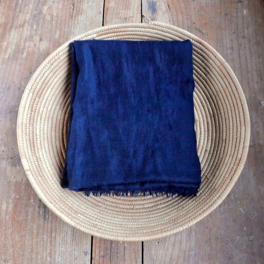 とても繊維が細く弾力性があり、極上の柔らかさを誇る高級素材である手織りのカシミヤのストール。ヒマラヤ山脈に生息する山羊の毛を使用したもので、こちらは中でも一番良質なお腹や首の産毛部分を使用した極薄毛を藍染めしたもので、薄手軽量にも関わらず、しっかりとした保温性があるので冬にもご使用頂けます。よく見ると細かく菱形模様が手織りされているのが分かります。保温性や保湿性に優れているのも嬉しいです。お洗濯の際にはドライクリーニングに出してください。