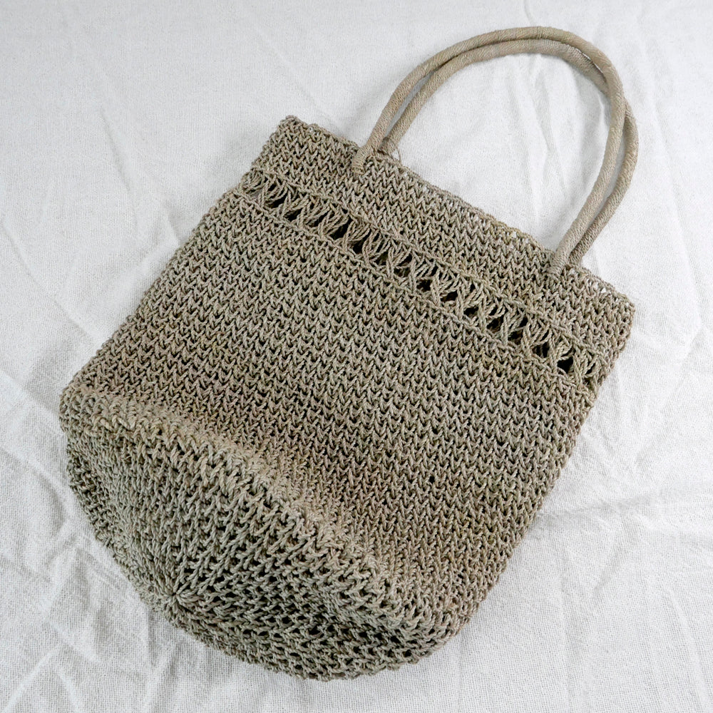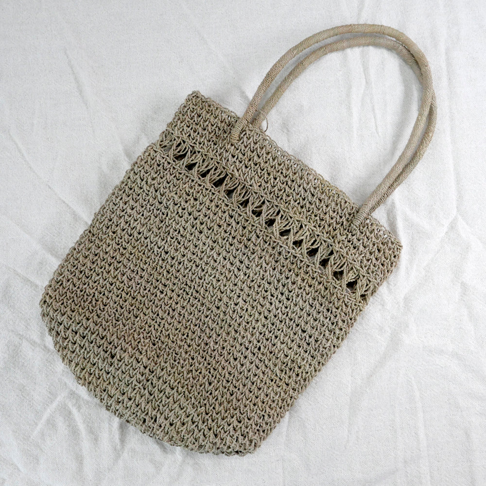 インドネシアのスラバヤ郊外の工房で作られている、ヤシの葉の繊維を手編みしたバッグ。底には円状のマチが付いています。さらに当ブランドロゴのココナッツ殻で作ったタグが付いており、その紐の部分はパイナップルの繊維で作られています。こちらは小型でスッキリした印象のバッグです。