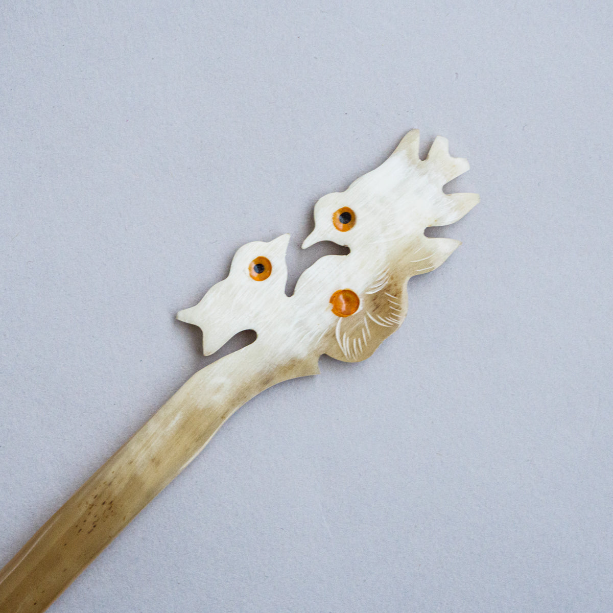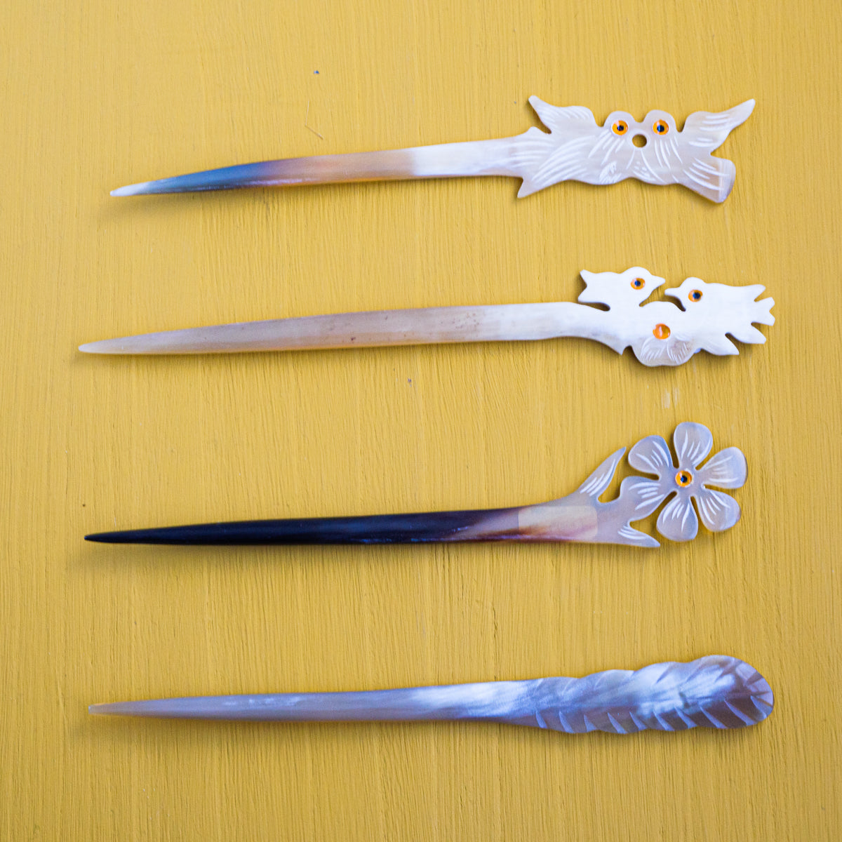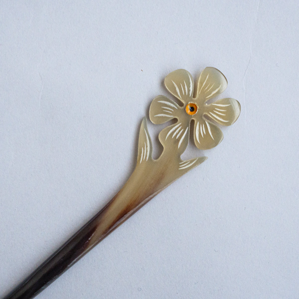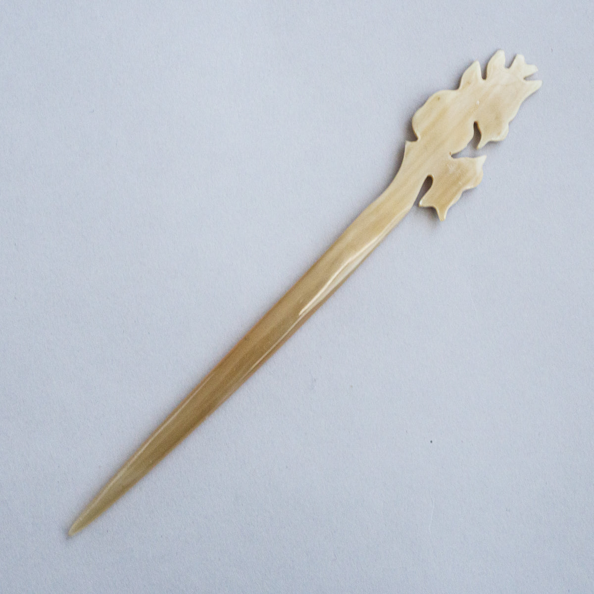 水牛の角を整形、手彫りして制作された可愛さ満点のかんざし。水牛の角は漢方にも使われている材質で、現地では頭皮の血行も良くなると言われている理にかなった製品。どれも水牛の角そのもののお色で、一つとして同じものがございません。こちらは先が1本のシングルシリーズになります。