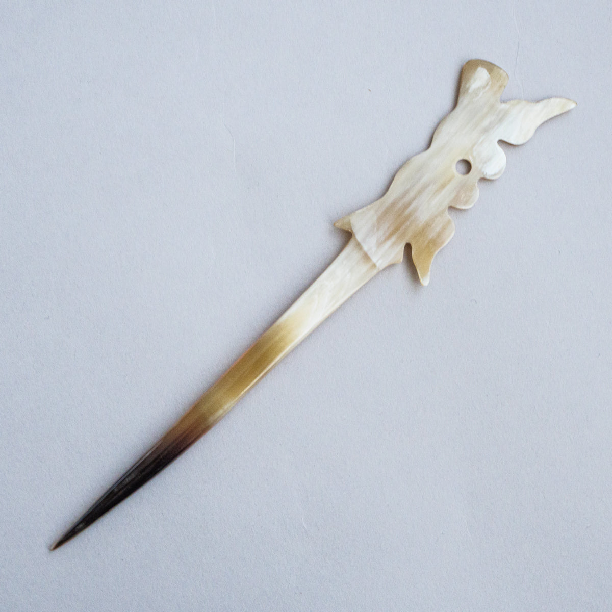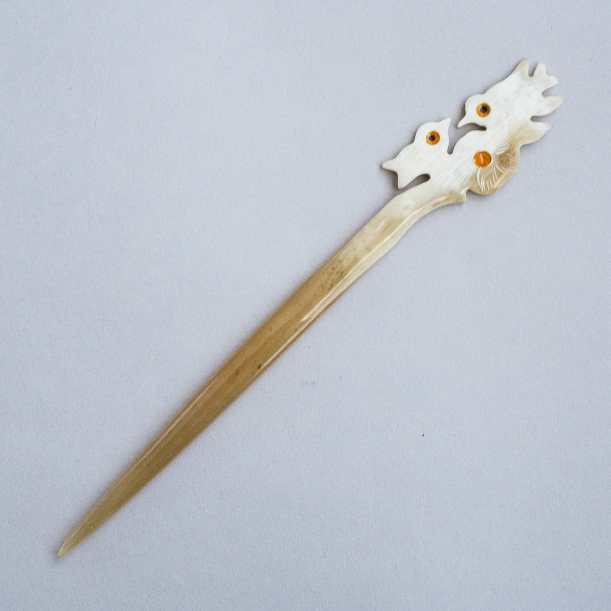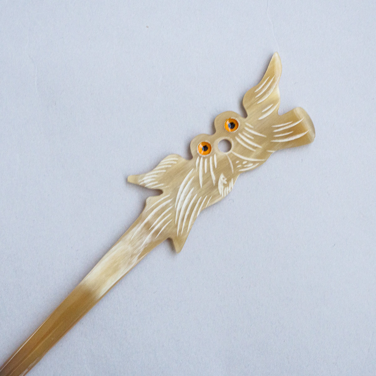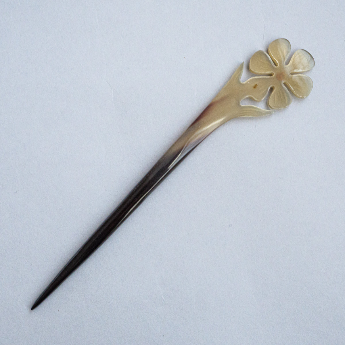 水牛の角を整形、手彫りして制作された可愛さ満点のかんざし。水牛の角は漢方にも使われている材質で、現地では頭皮の血行も良くなると言われている理にかなった製品。どれも水牛の角そのもののお色で、一つとして同じものがございません。こちらは先が1本のシングルシリーズになります。