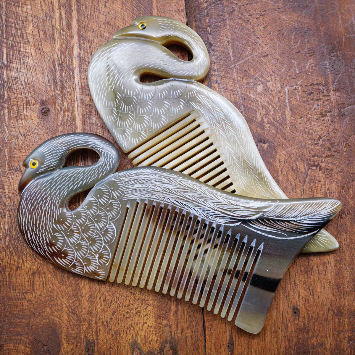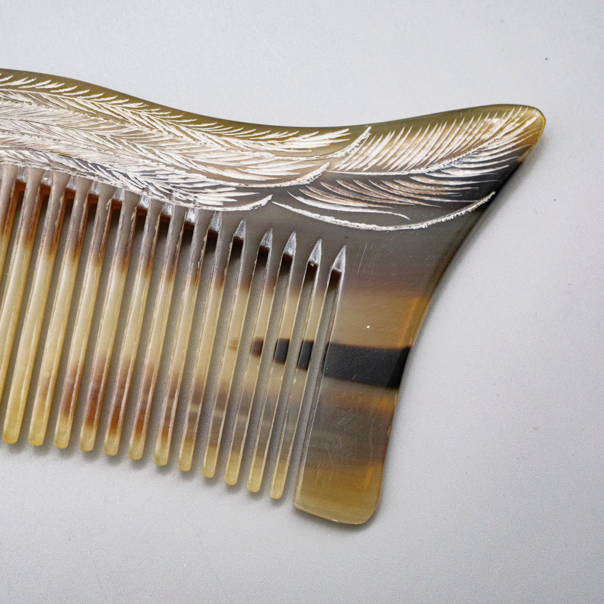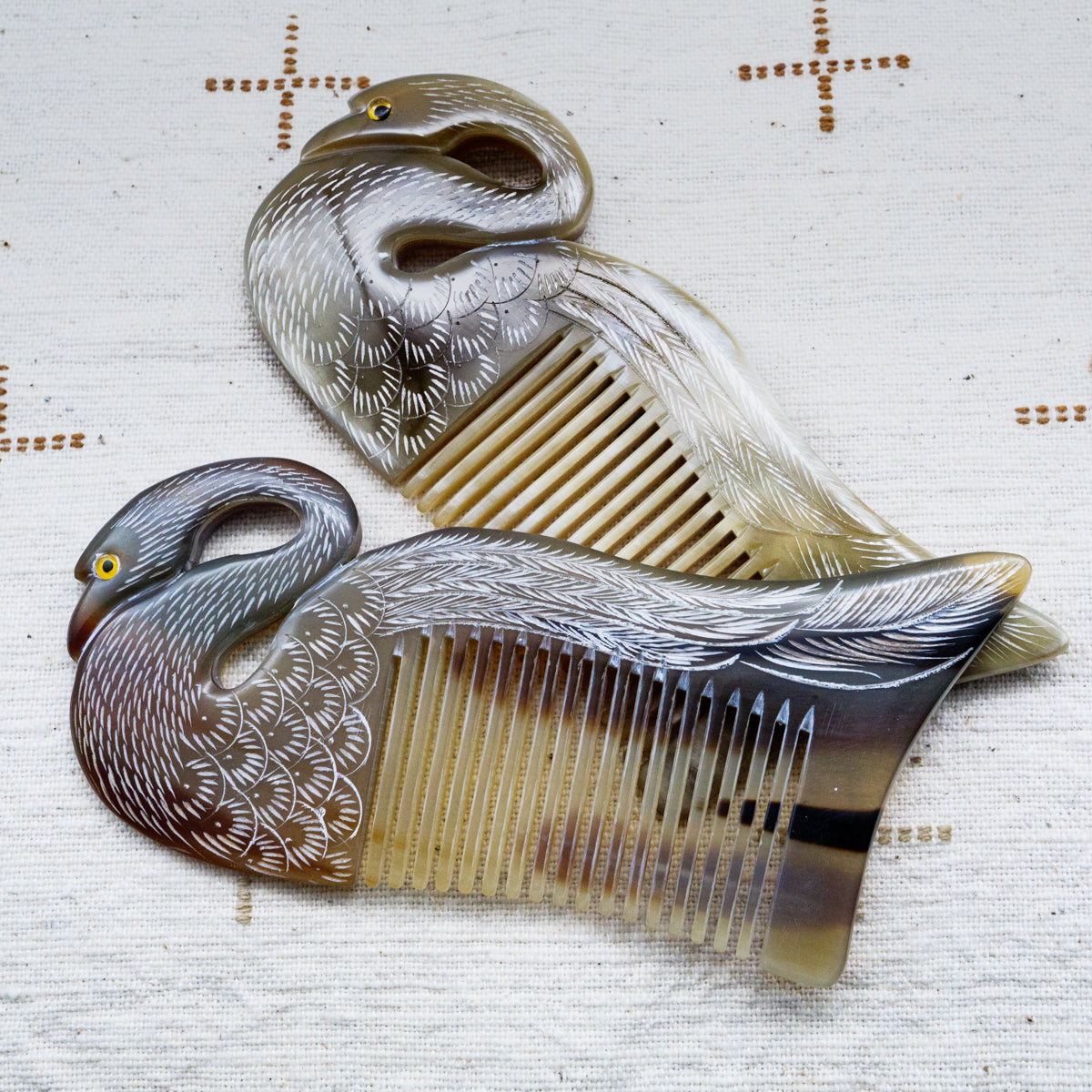 水牛の角を整形、手彫りして制作された可愛さ満点のコーム。水牛の角は漢方にも使われている材質で、現地では頭皮の血行も良くなると言われている理にかなった製品。どれも水牛の角そのもののお色なのですが、一つとして同じものがございません。こちらは水牛角櫛シリーズの中でも一番豪華な仕様で、両側にデザインが施されており、さらにとても厚みがあり丈夫です。