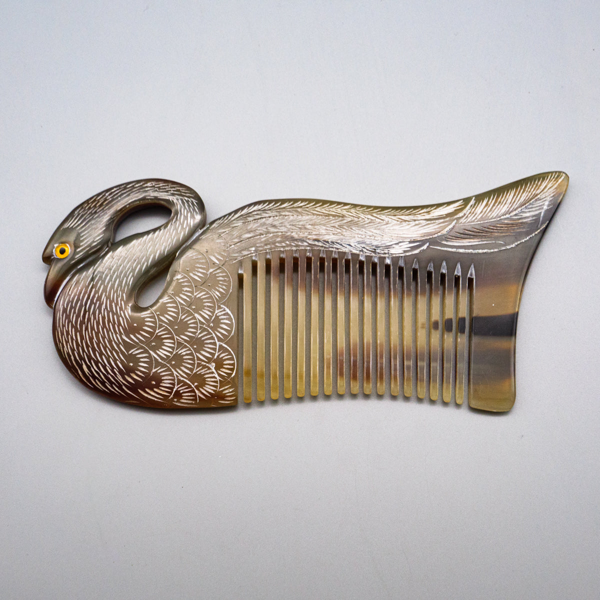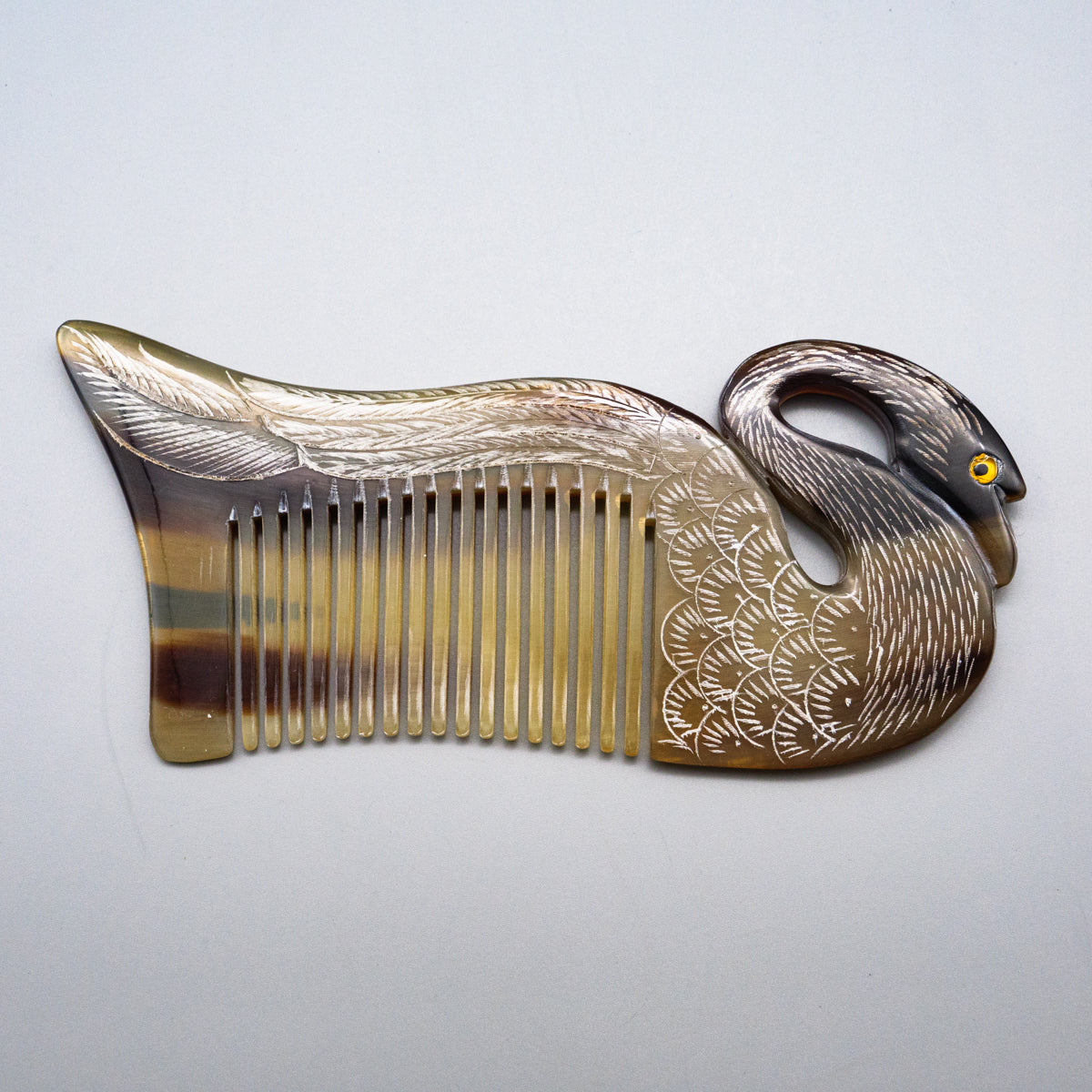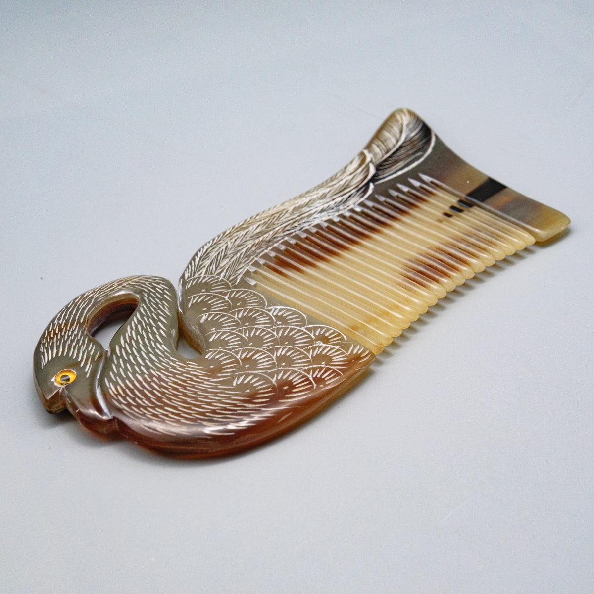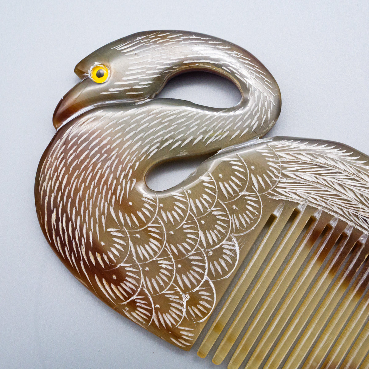 水牛の角を整形、手彫りして制作された可愛さ満点のコーム。水牛の角は漢方にも使われている材質で、現地では頭皮の血行も良くなると言われている理にかなった製品。どれも水牛の角そのもののお色なのですが、一つとして同じものがございません。こちらは水牛角櫛シリーズの中でも一番豪華な仕様で、両側にデザインが施されており、さらにとても厚みがあり丈夫です。