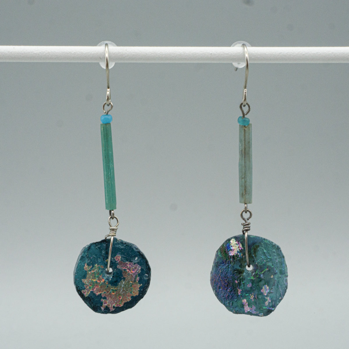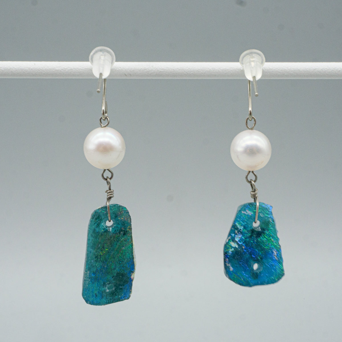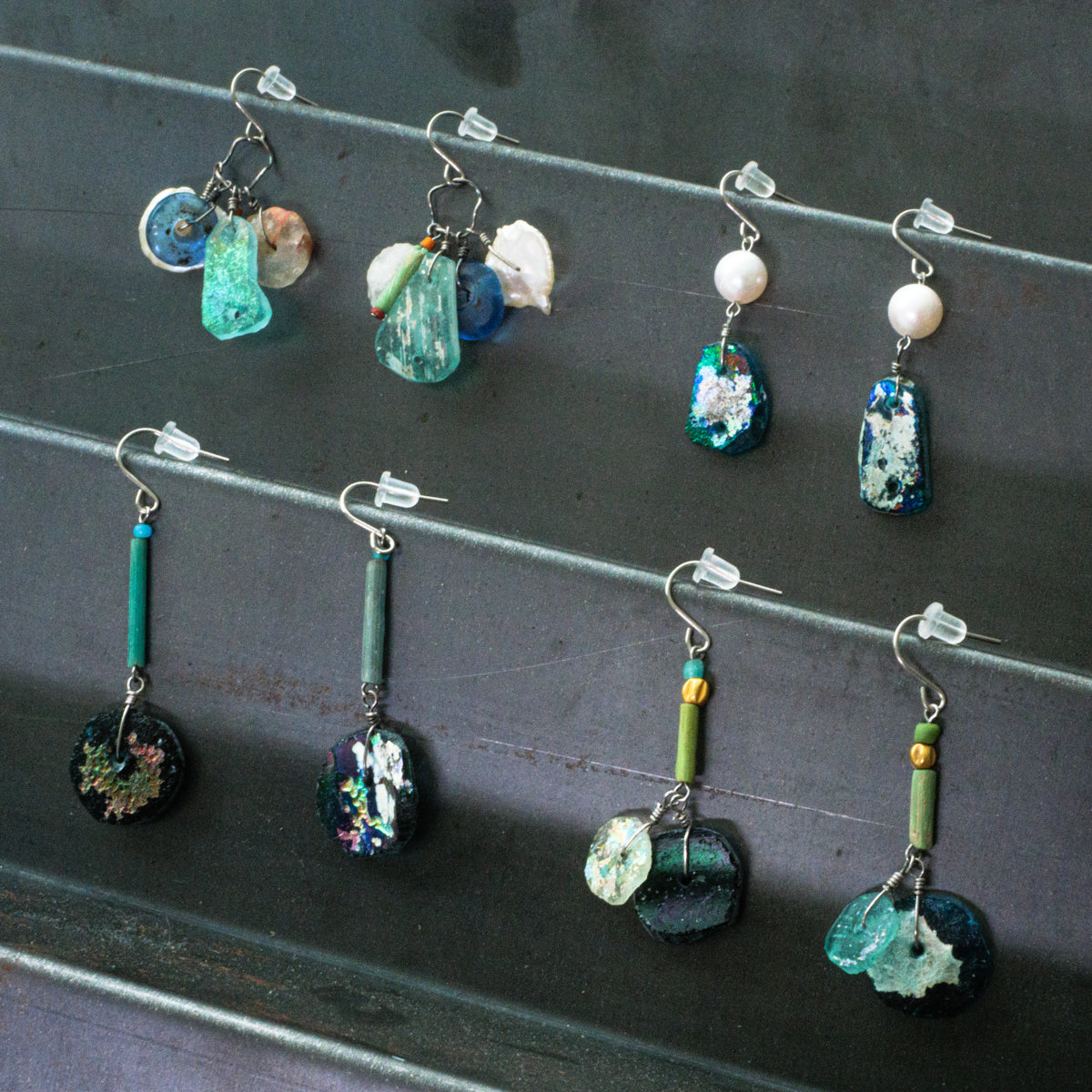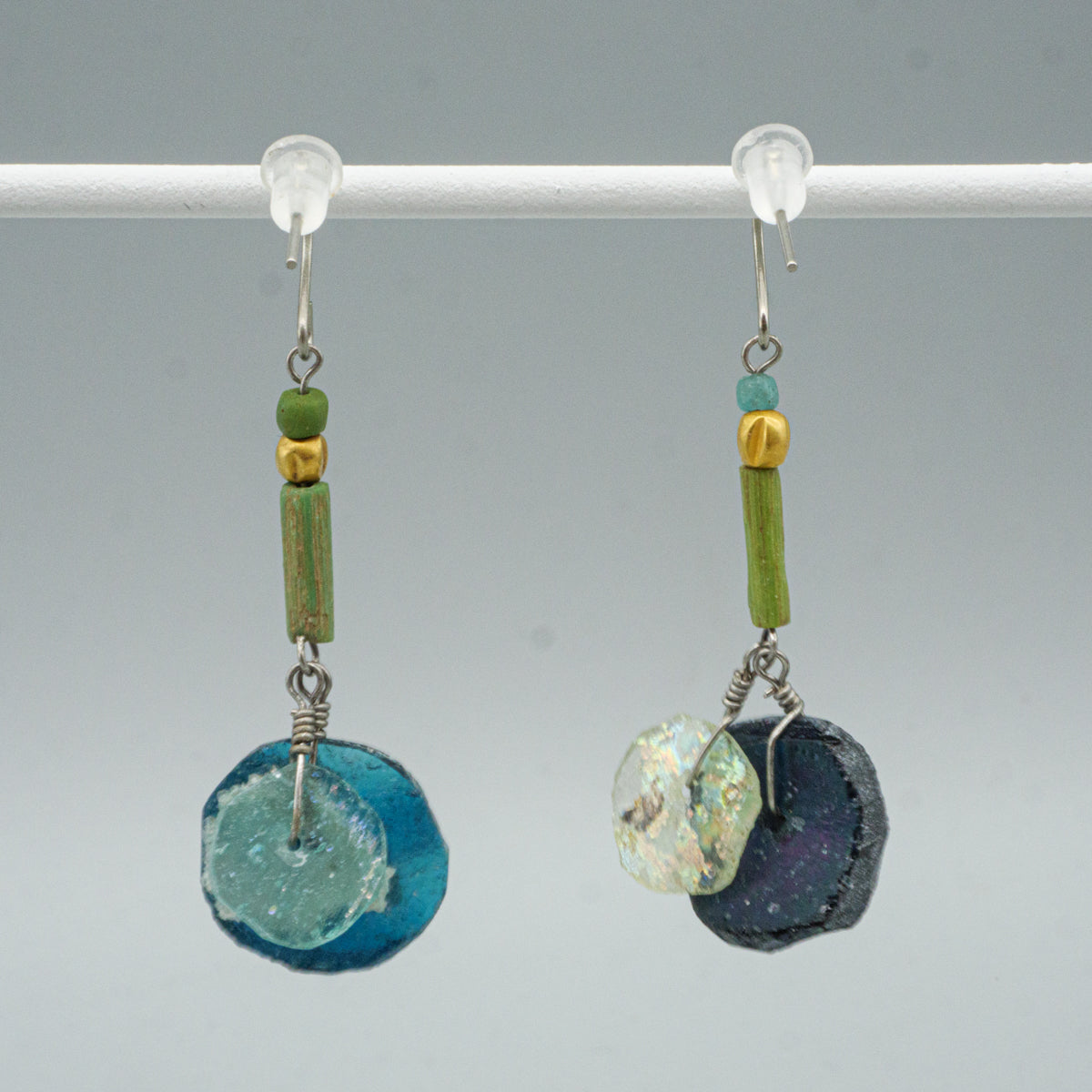 今から約1600年から2000年前のローマ時代からササン朝ペルシャ時代にかけて作られたガラス製品はローマングラスと呼ばれています。時代に渡る厳しい自然の中で、砂はガラスの表面に化学反応を起こさせ、銀化と云われる荘厳な輝きを与えました。こちらはそのローマングラスをアトリエサジが厳選しアクセサリーにしたもので、太陽光に反射した姿がとても美しいです。