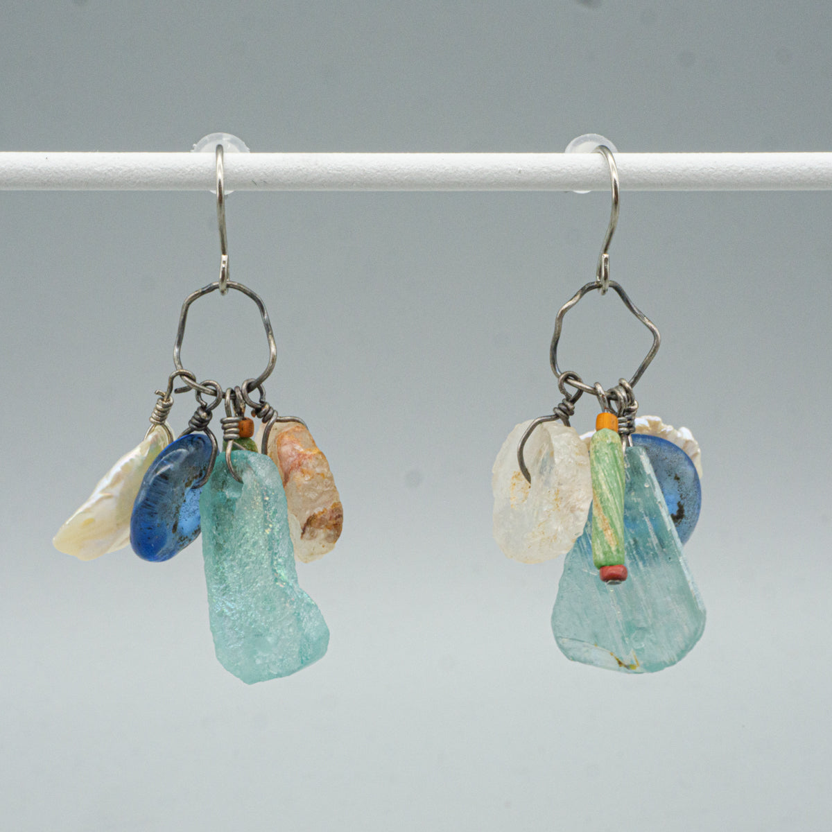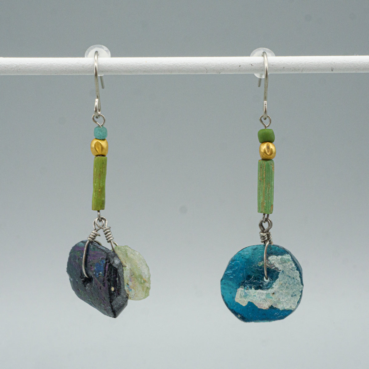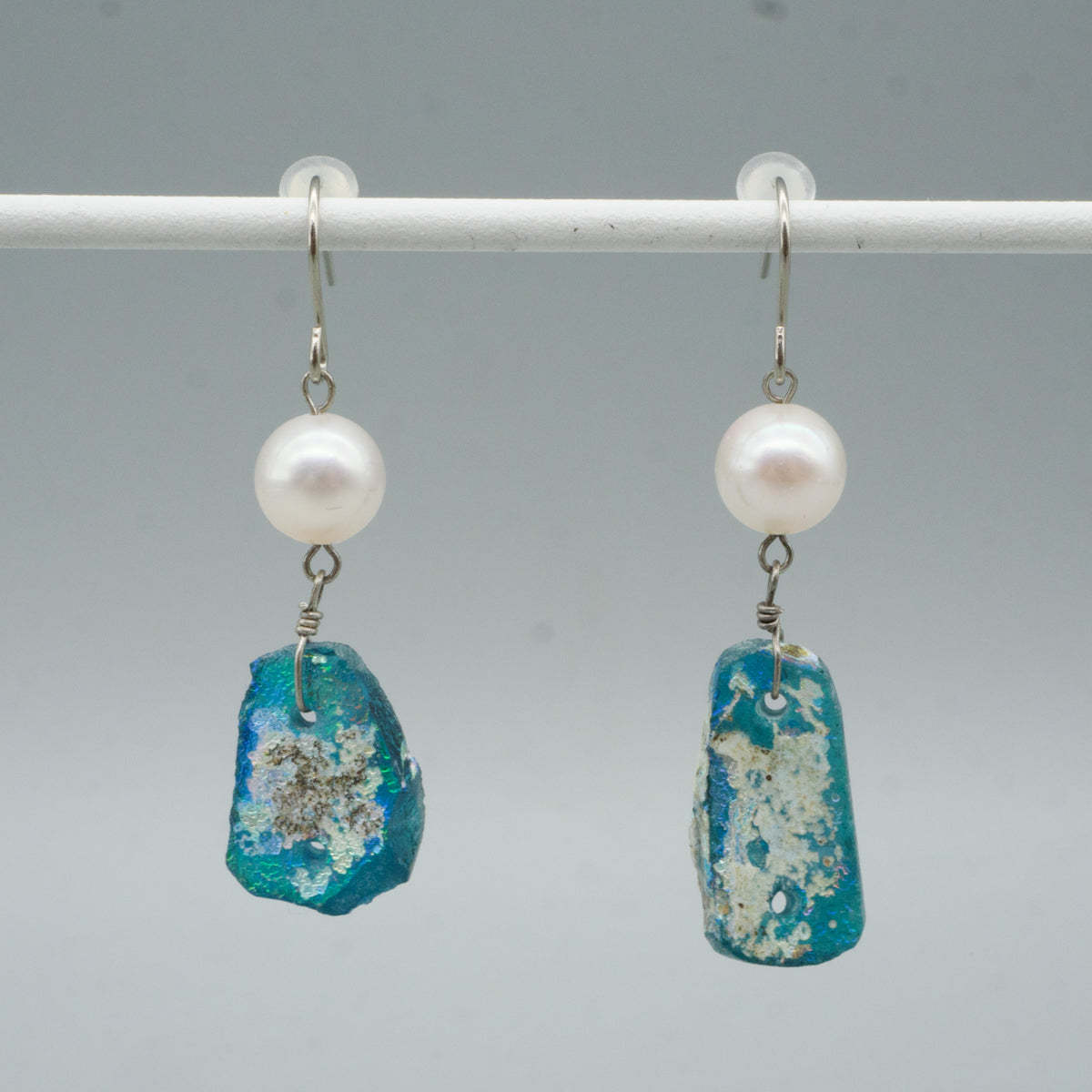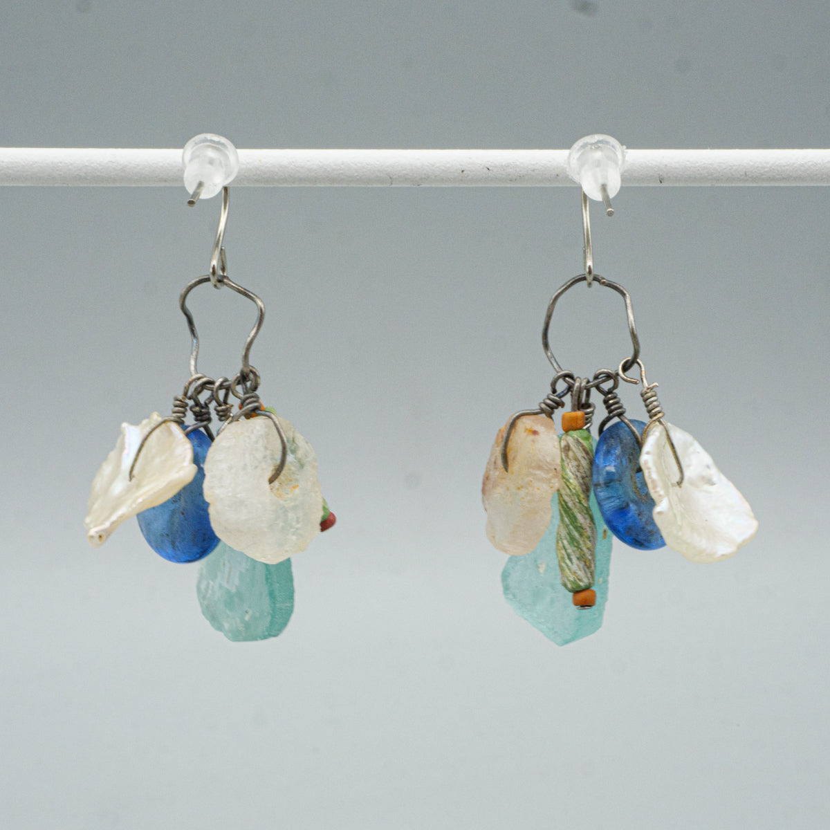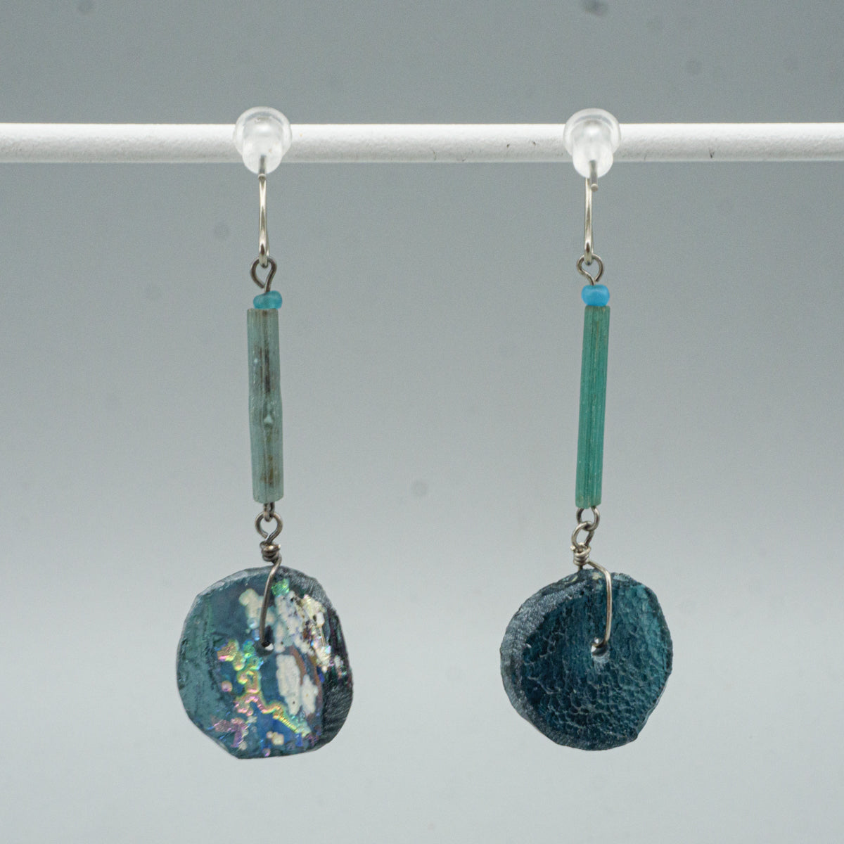 今から約1600年から2000年前のローマ時代からササン朝ペルシャ時代にかけて作られたガラス製品はローマングラスと呼ばれています。時代に渡る厳しい自然の中で、砂はガラスの表面に化学反応を起こさせ、銀化と云われる荘厳な輝きを与えました。こちらはそのローマングラスをアトリエサジが厳選しアクセサリーにしたもので、太陽光に反射した姿がとても美しいです。