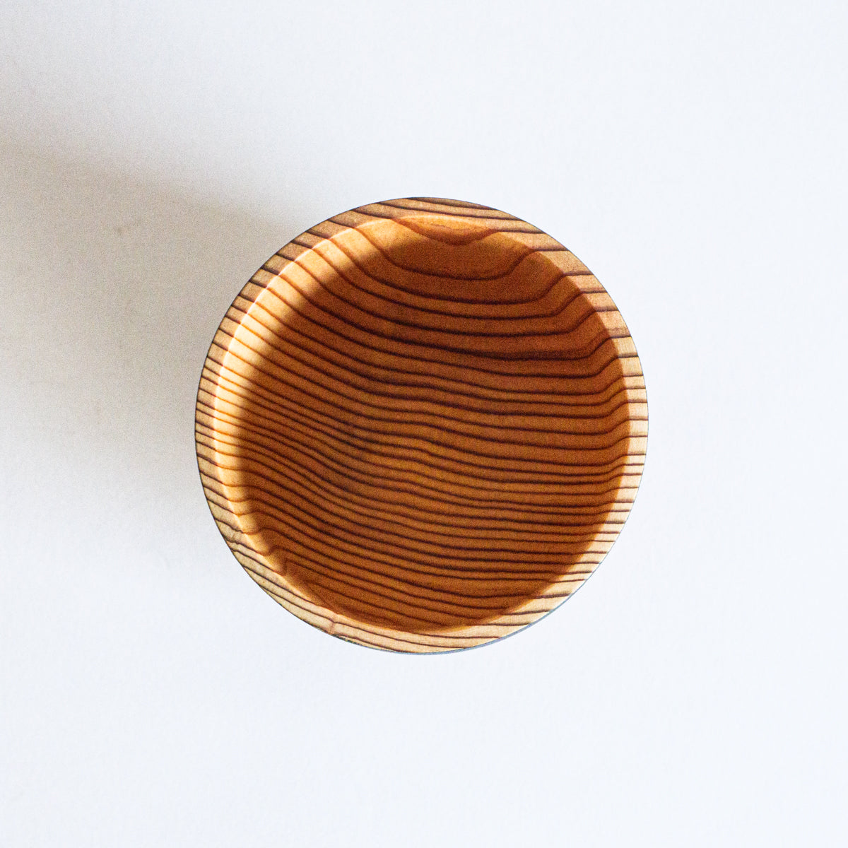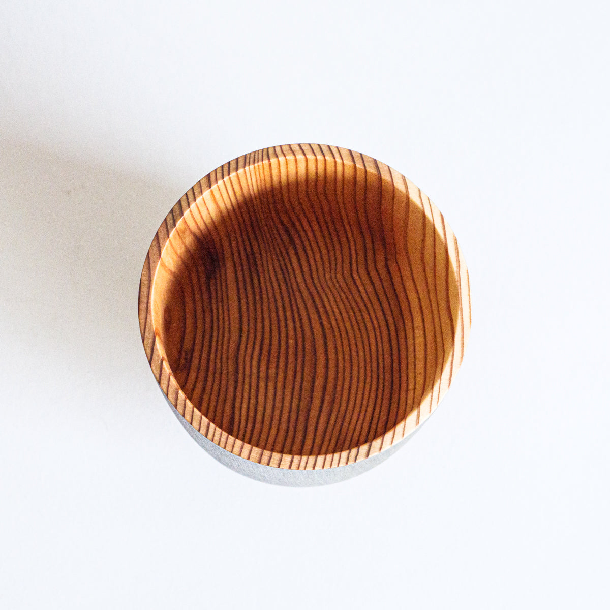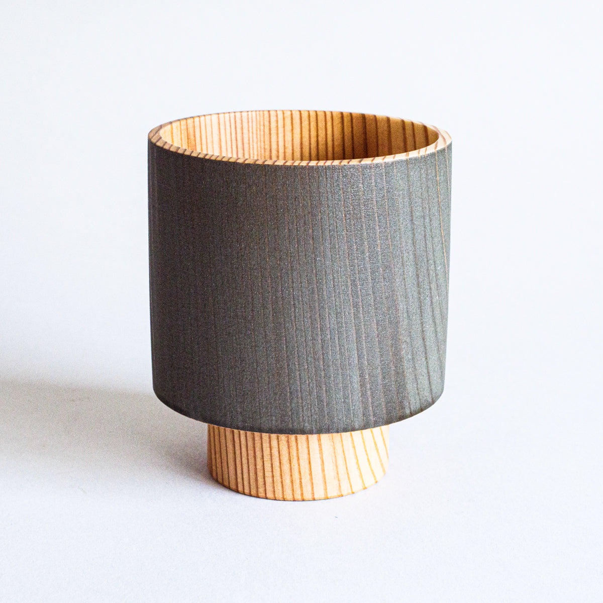 当店のロングセラーアイテム。鹿児島県霧島市の山中にある工房FUQUGI(フクギ)にて、上質な吉野杉を丁寧に削り出して制作されたコップ。こちらは定番のCup Qシリーズよりも太くて、木の幹の形をしているのでトランクと名付けられたシリーズ。底には土台もございます。杉の特製でもある保温性もあり、冷たいものはひんやりと美味しくいただけます。口当たりもなめらかで、冷酒やビール好きにはたまりません。表面は安全な食用のウレタン塗装を施してあり、普通に洗剤で洗えるのも嬉しいところです。木製製品ですので、長い間の漬け置きや電子レンジ、食洗機のご使用は避けてください。