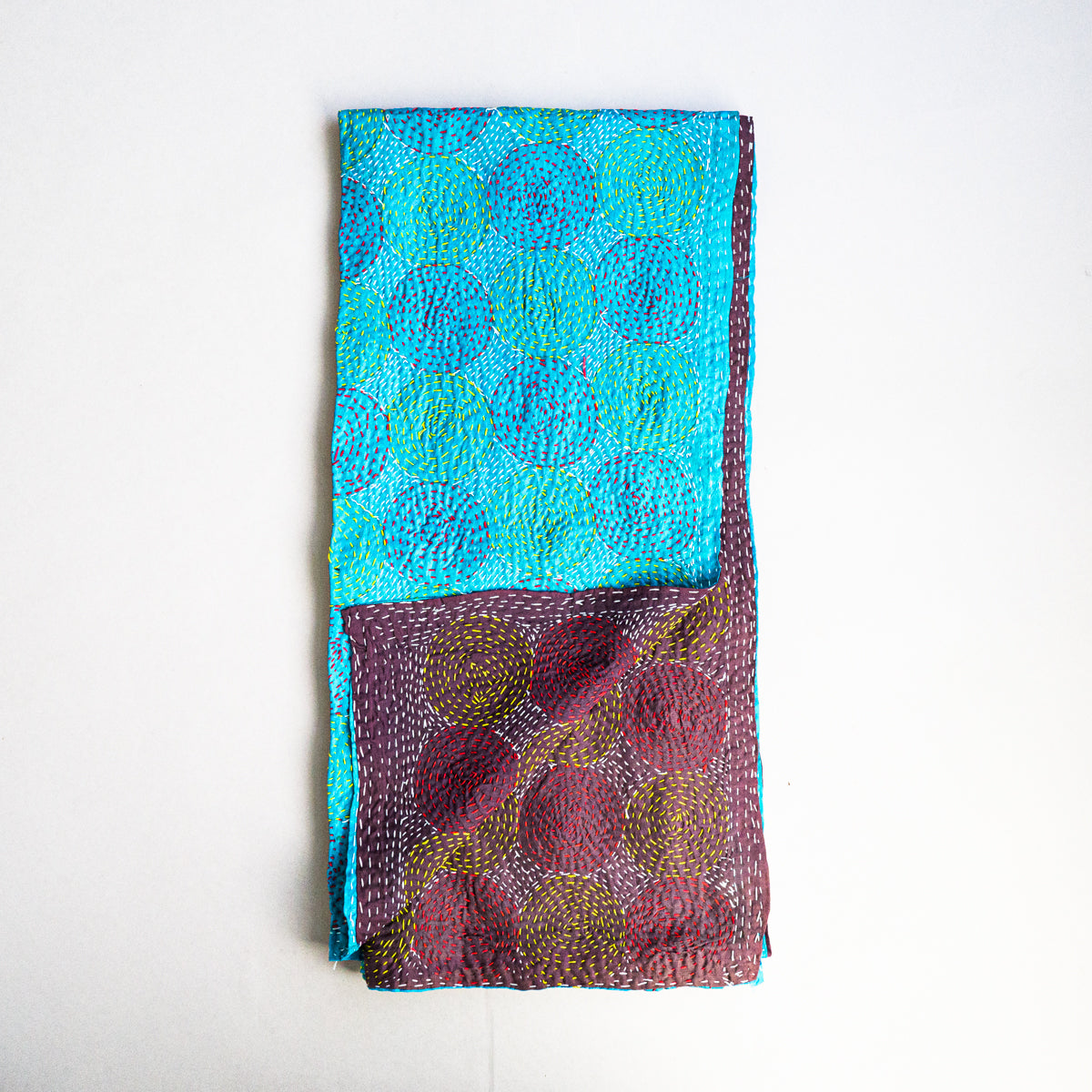 インドの民族衣装サリーのシルクの古布を、現代の人たちが綿糸で刺し子を施したもので、とても可愛らしいストールとしてお使い頂けます。2枚の生地を使用しているのでリバーシブルでもお使い頂けます。こちらは刺し子模様がサークル模様のシリーズになります。当店で販売するカンタストールは、お値段がお求めやすく、何と言っても心地よい手触りが自慢です。1つとして同じ物がないので、是非お気に入りの1枚を探してみてください。