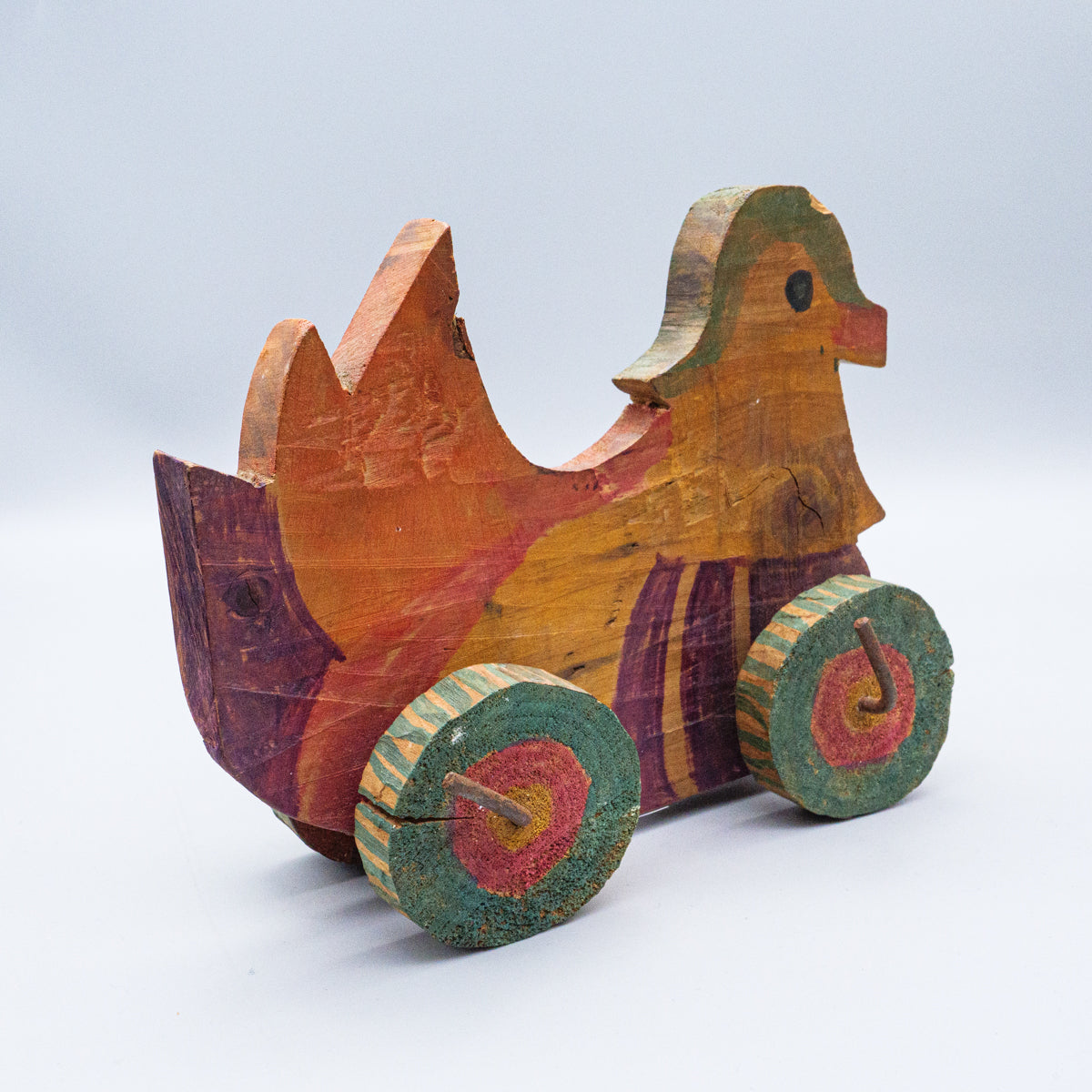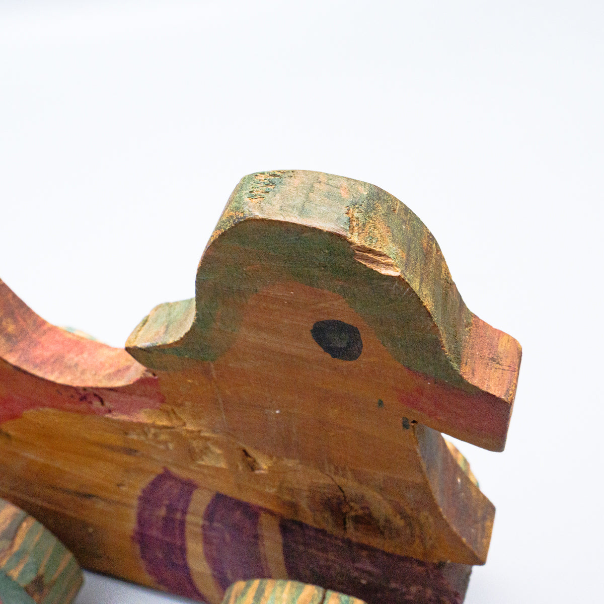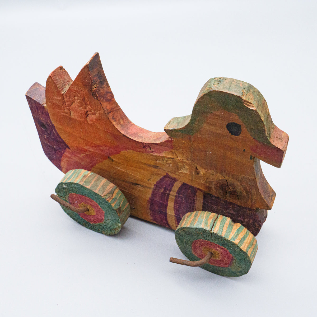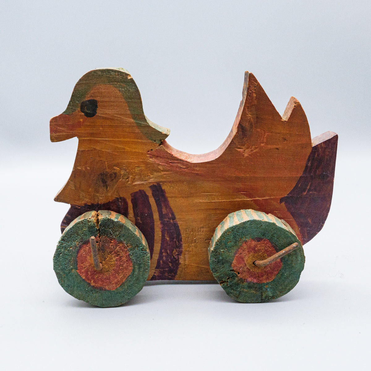 昭和時代のオシドリの形をした車輪付きの子供の玩具。経年変化をして、ほのかに残った手描きのペイントや木の質感で、とても愛らしい雰囲気を醸し出しています。