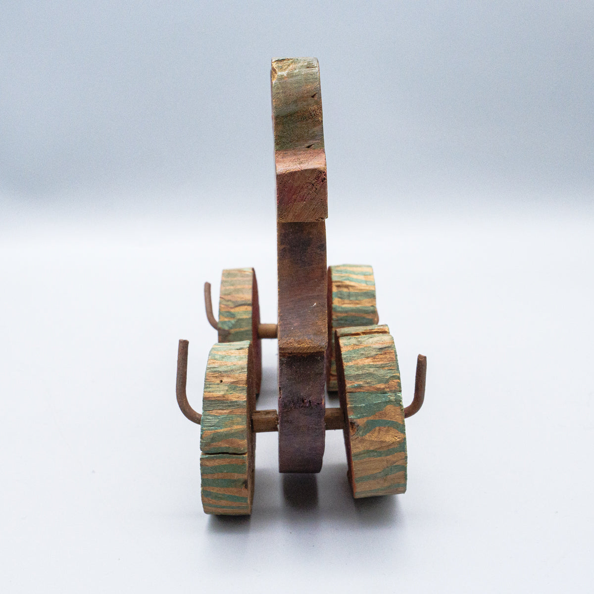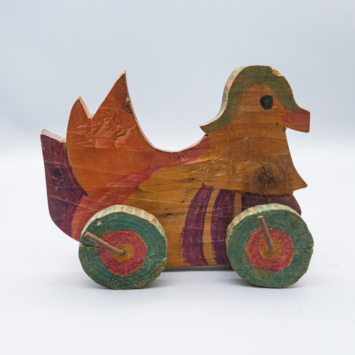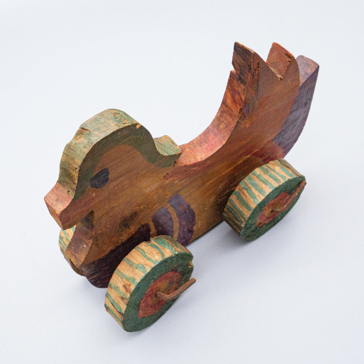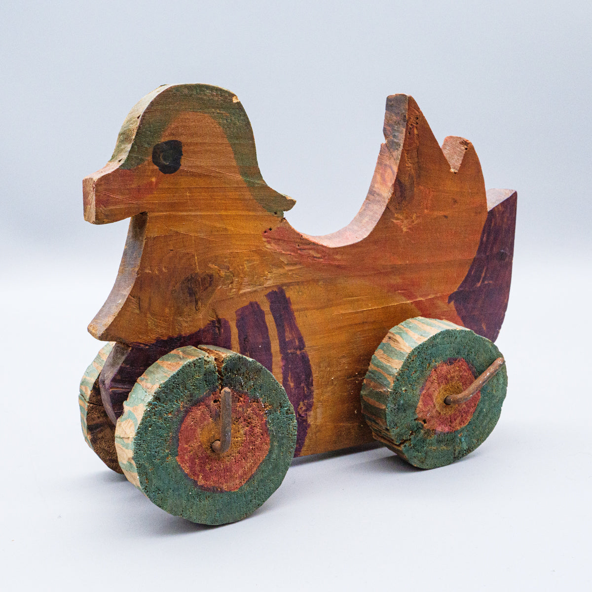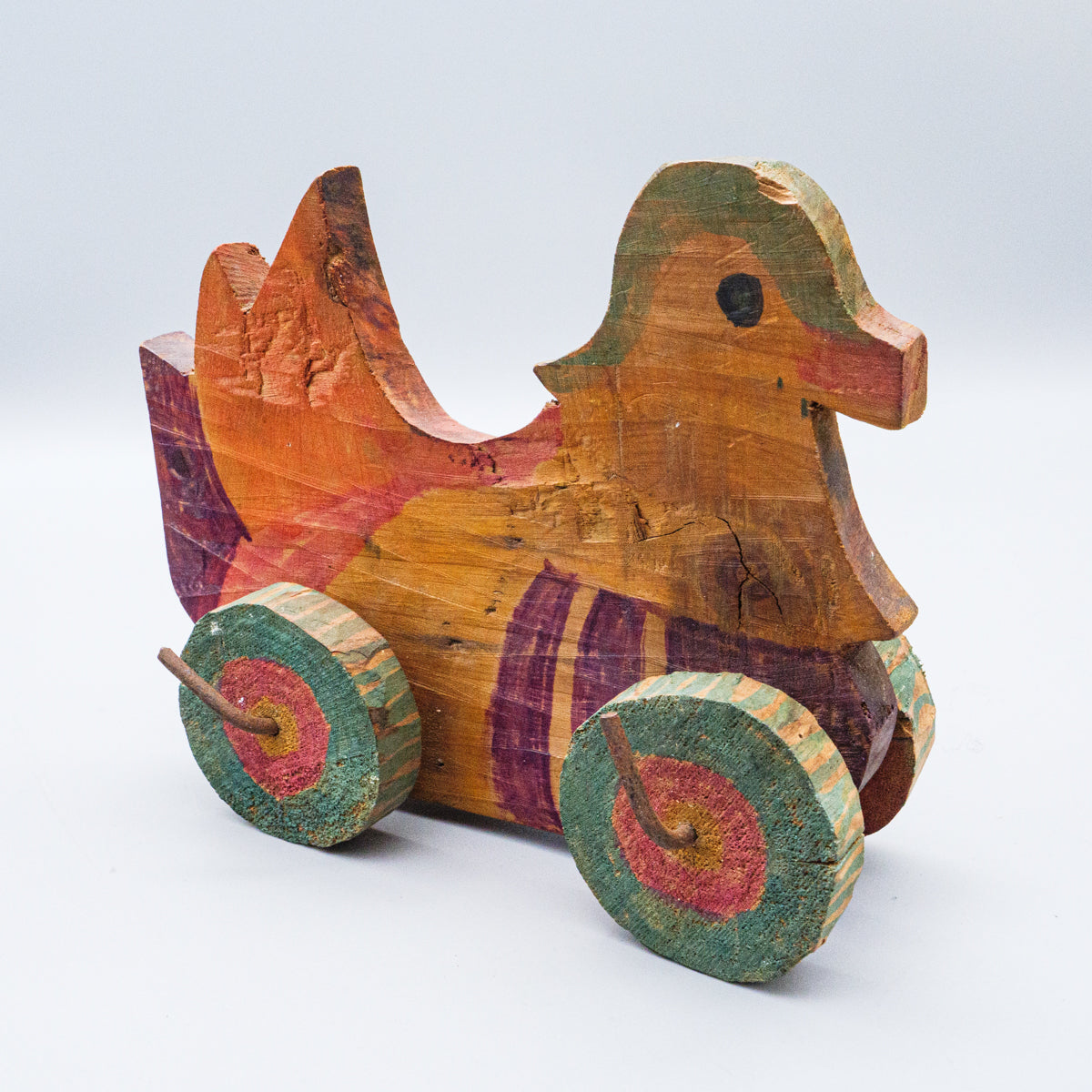 昭和時代のオシドリの形をした車輪付きの子供の玩具。経年変化をして、ほのかに残った手描きのペイントや木の質感で、とても愛らしい雰囲気を醸し出しています。
