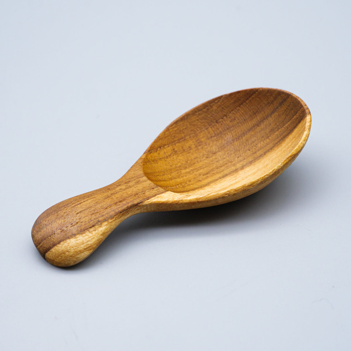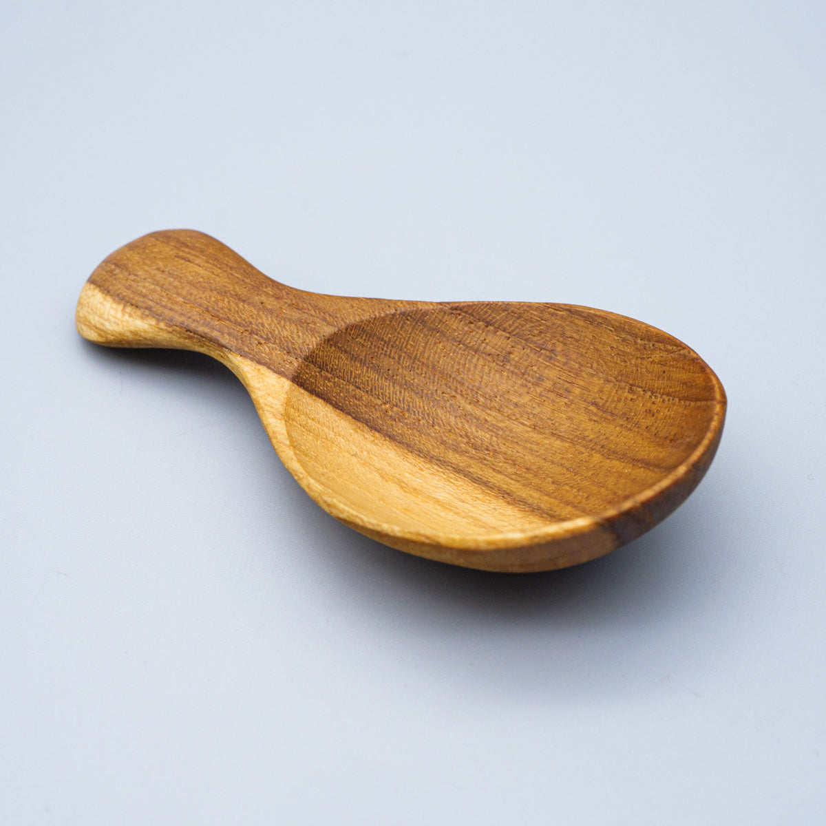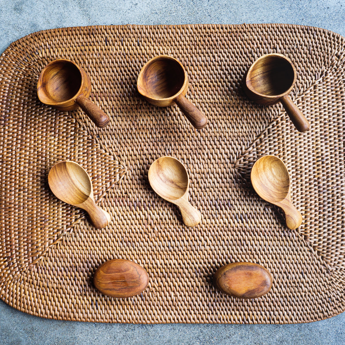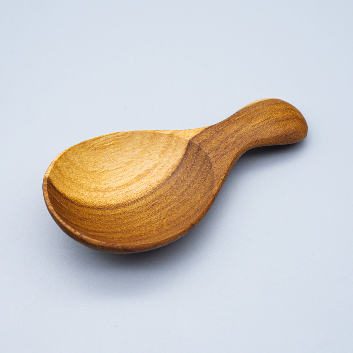 硬いチーク材を使用した様々なカトラリー。丸くて深い愛らしい形をしたスクープ(物をすくう道具)。茶葉や調味料入れとしてお使い頂ける匙。まるで地面に落ちている石のような素朴な箸置き。通常の洗剤で洗って頂けますが、乾いたらすぐにフキンで吹いてあげて、時々自然由来のオイルを塗ってあげると長持ちします。