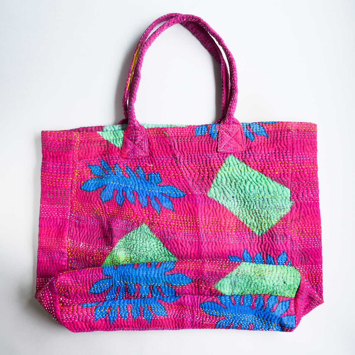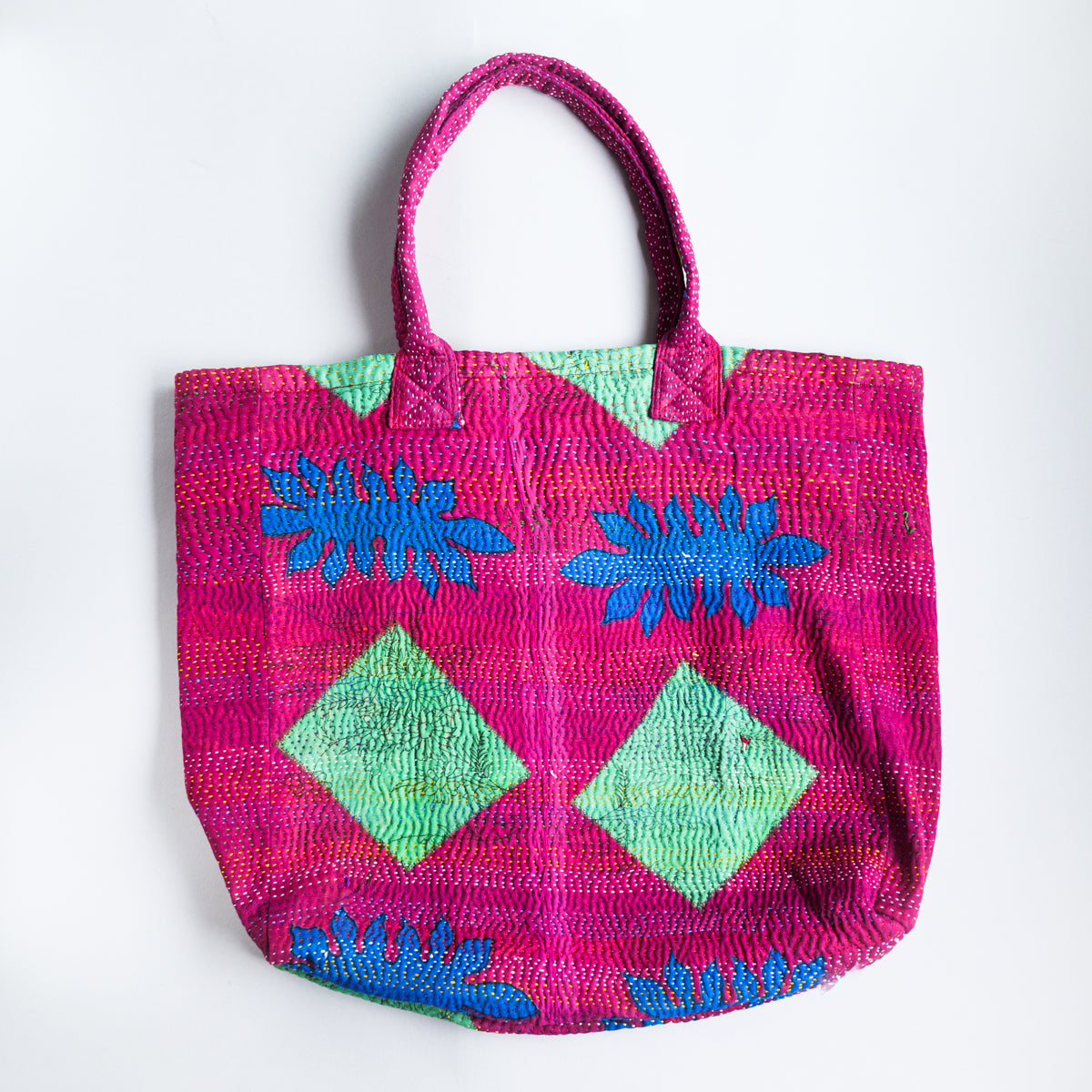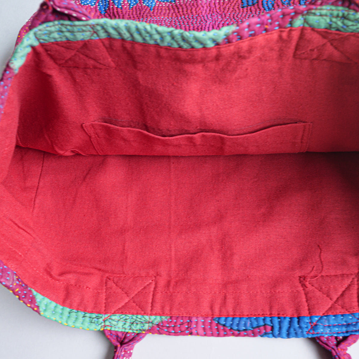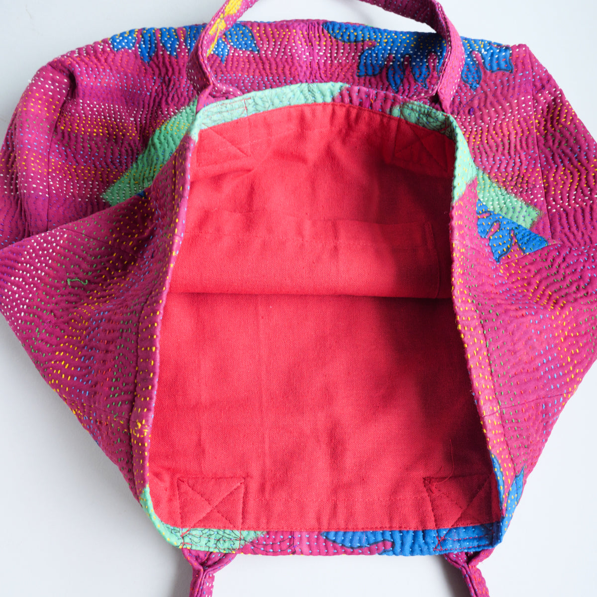 パキスタンよりのインドのラリーキルト生地のトートバッグ。良く見ると本体部分表面の真ん中で生地が繋ぎ合わせてあり、その上から無数に刺し子模様があります。本当に良い出来映えです。内側生地の片側には横19 x 縦23cmのポケットも付いています。幅11cmの側面と底面にマチが付いてますので、かなりたっぷり入ります。画像ではマチ部分が柔らかいため、側面マチの真ん中で折られた状態になっていますが、サイズ表記はマチ部分を除外したものになります。