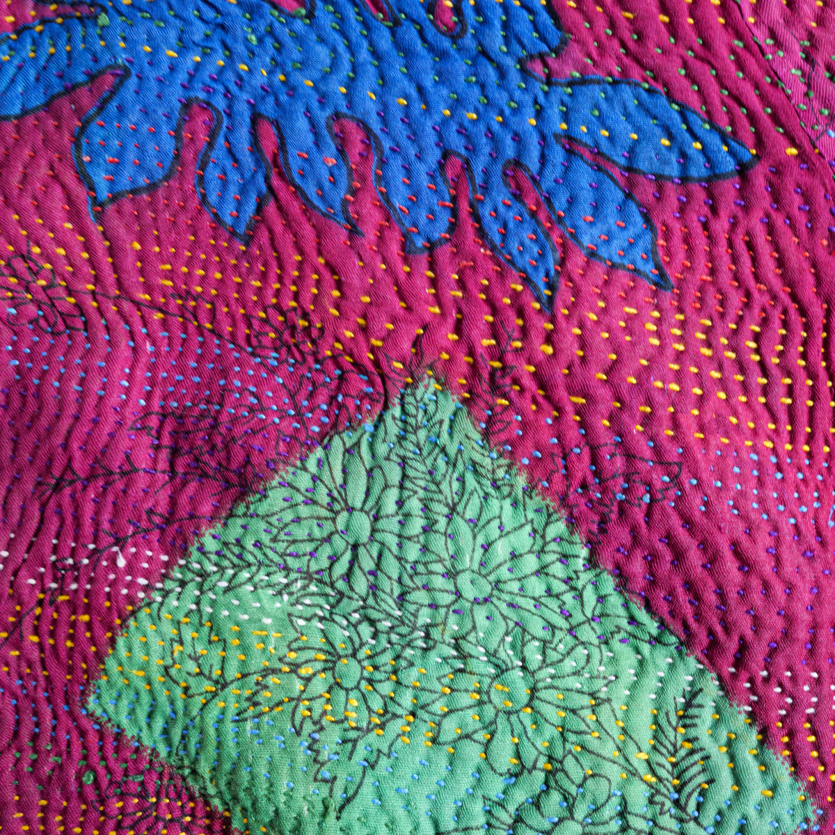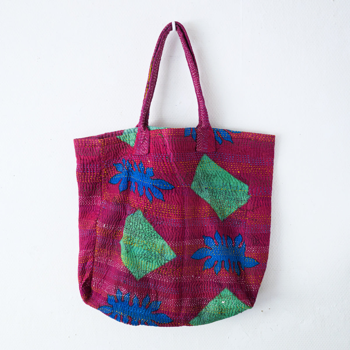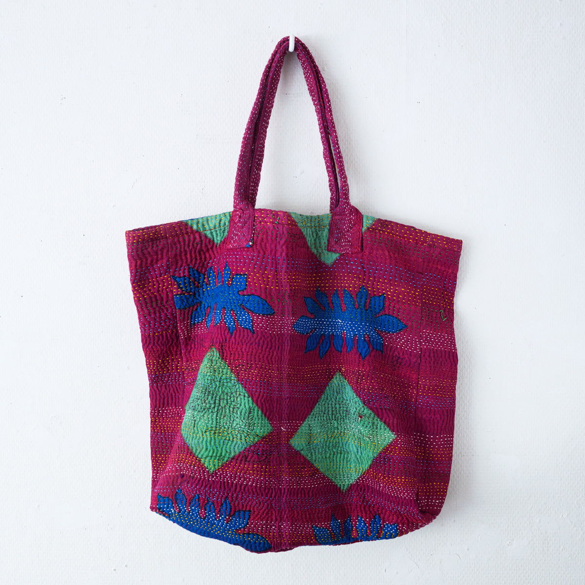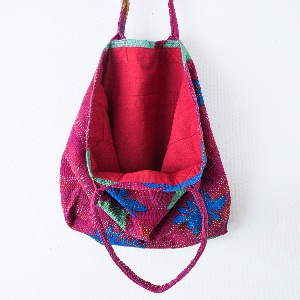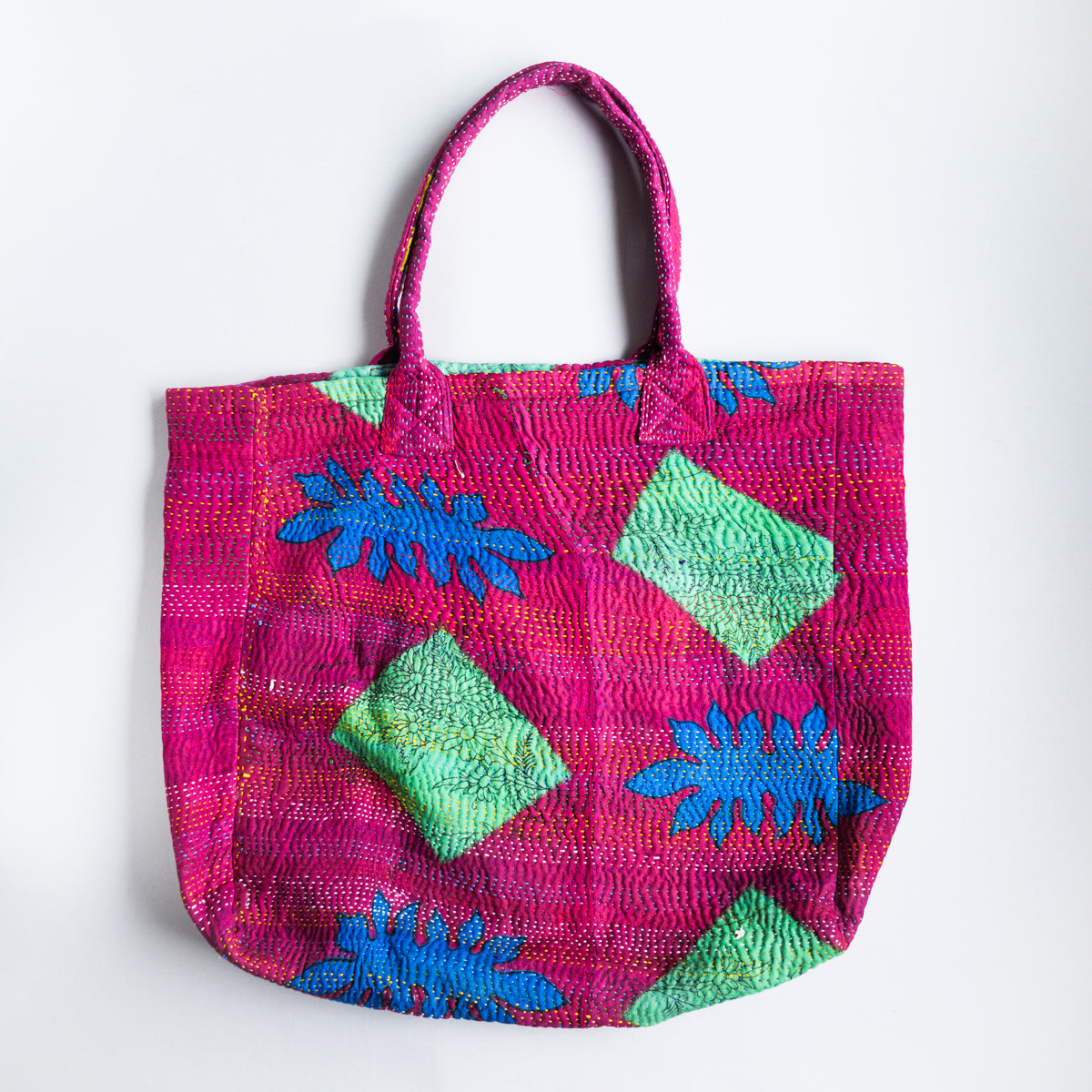 パキスタンよりのインドのラリーキルト生地のトートバッグ。良く見ると本体部分表面の真ん中で生地が繋ぎ合わせてあり、その上から無数に刺し子模様があります。本当に良い出来映えです。内側生地の片側には横19 x 縦23cmのポケットも付いています。幅11cmの側面と底面にマチが付いてますので、かなりたっぷり入ります。画像ではマチ部分が柔らかいため、側面マチの真ん中で折られた状態になっていますが、サイズ表記はマチ部分を除外したものになります。