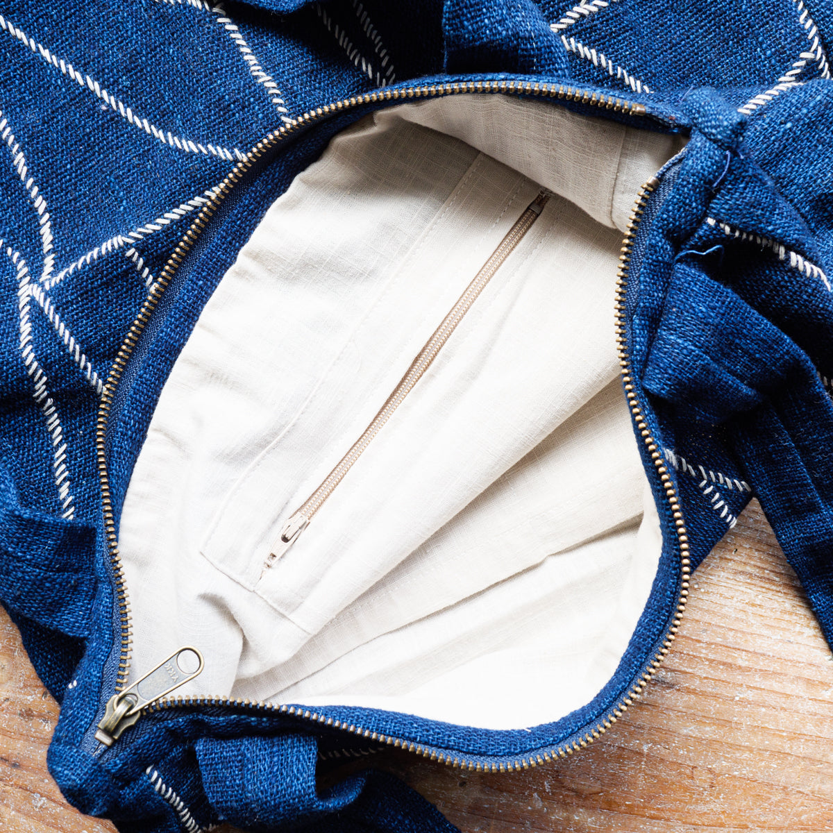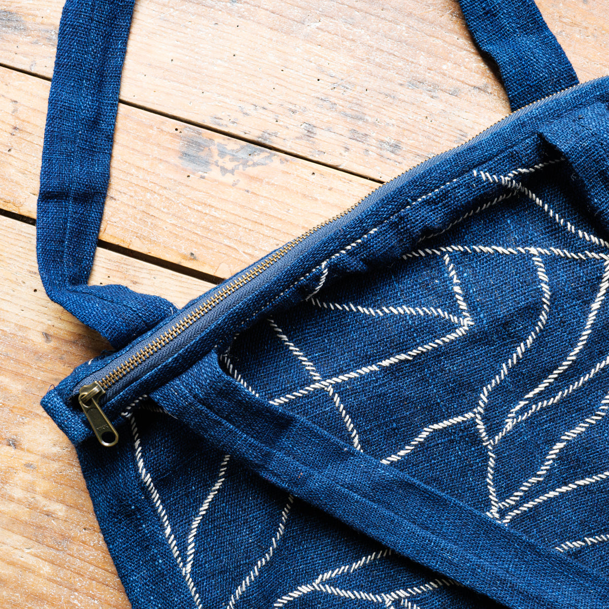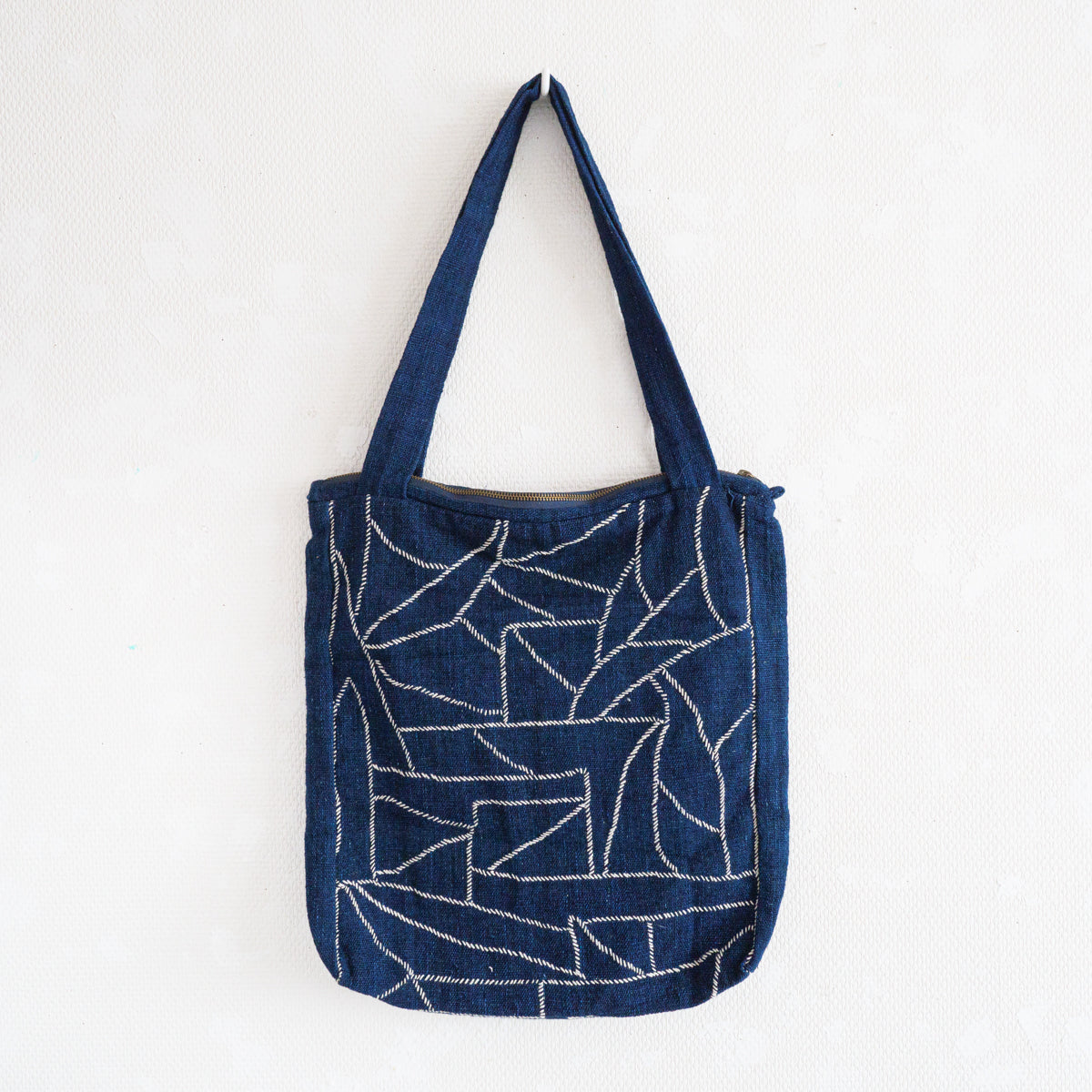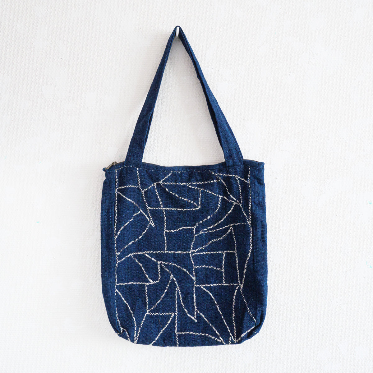 深い藍の色に白のステッチ模様が美しいトートバッグ。マチがあるので、見た目よりもたっぷり入ります。上部はファスナーが付いており、さらに内側には1つファスナー付きポケットも付いています。