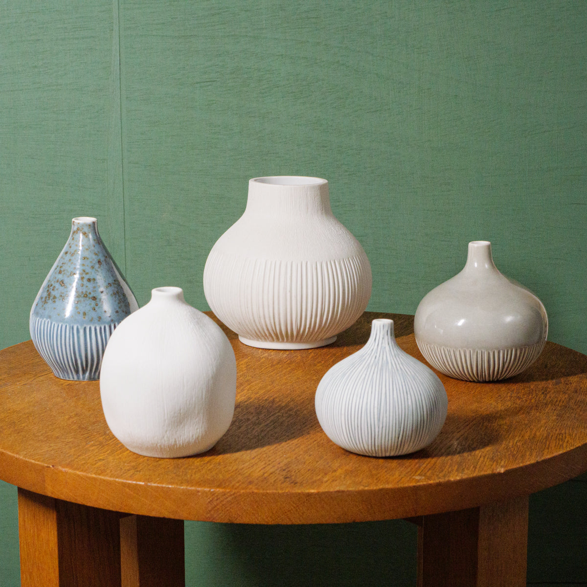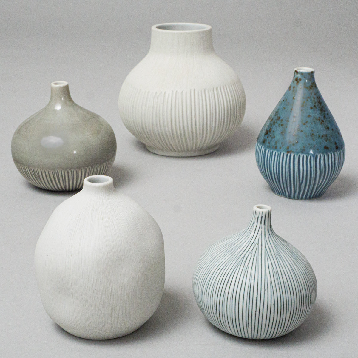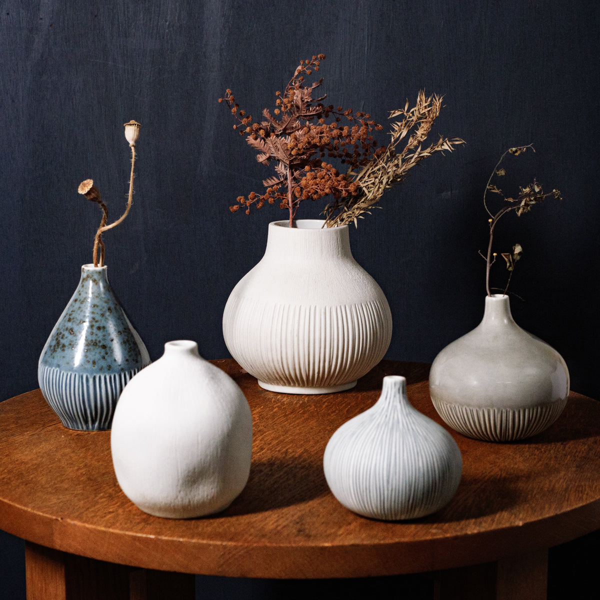 タイ北部陶器の街ランパーンの工房で制作された花器のシリーズ。大部分のものが先が細いのが特徴で、まさしく一輪挿しといった佇まいです。