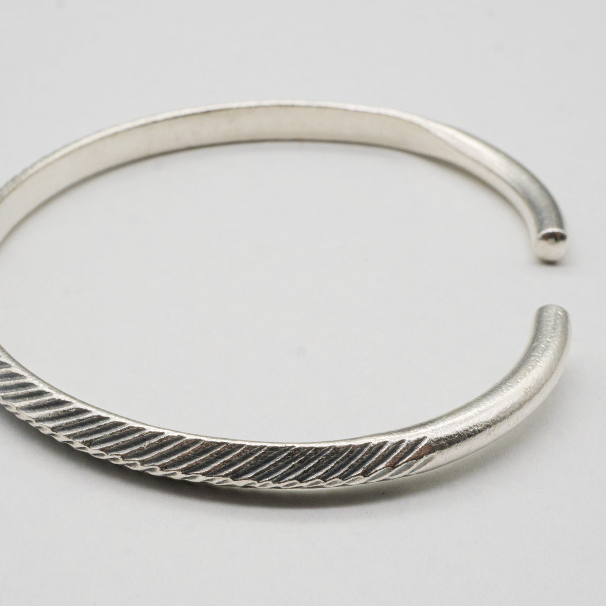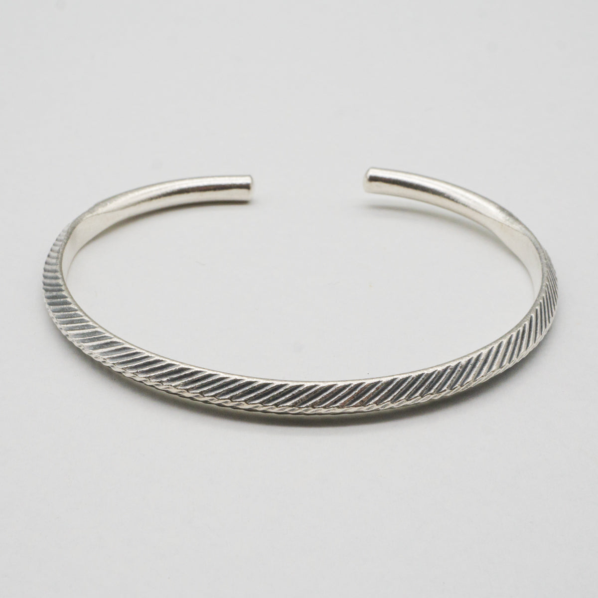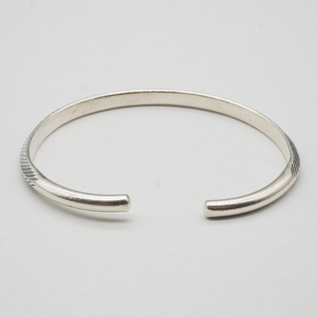 タイ北部からミャンマーにかけて分布する少数民族、カレン族が製作したシルバーアクセサリー。95%以上の高純度のシルバーで、軽くて柔らかいのが特徴です。さりげなく特徴的なデザインでとても付けやすいです。こちらのバングルは全てフリーサイズになります。