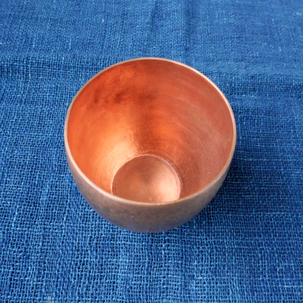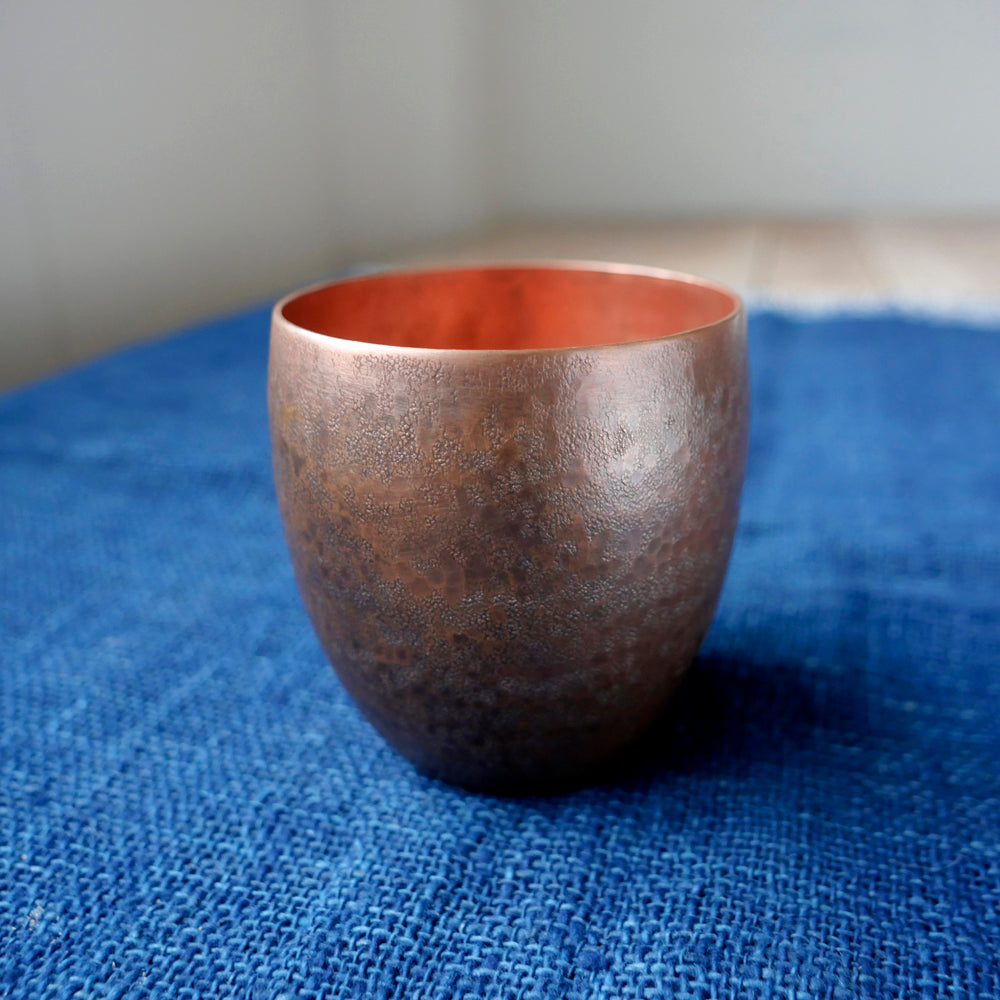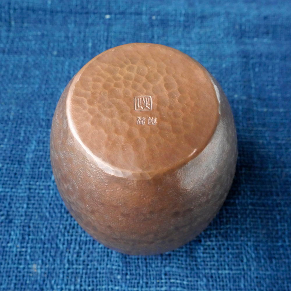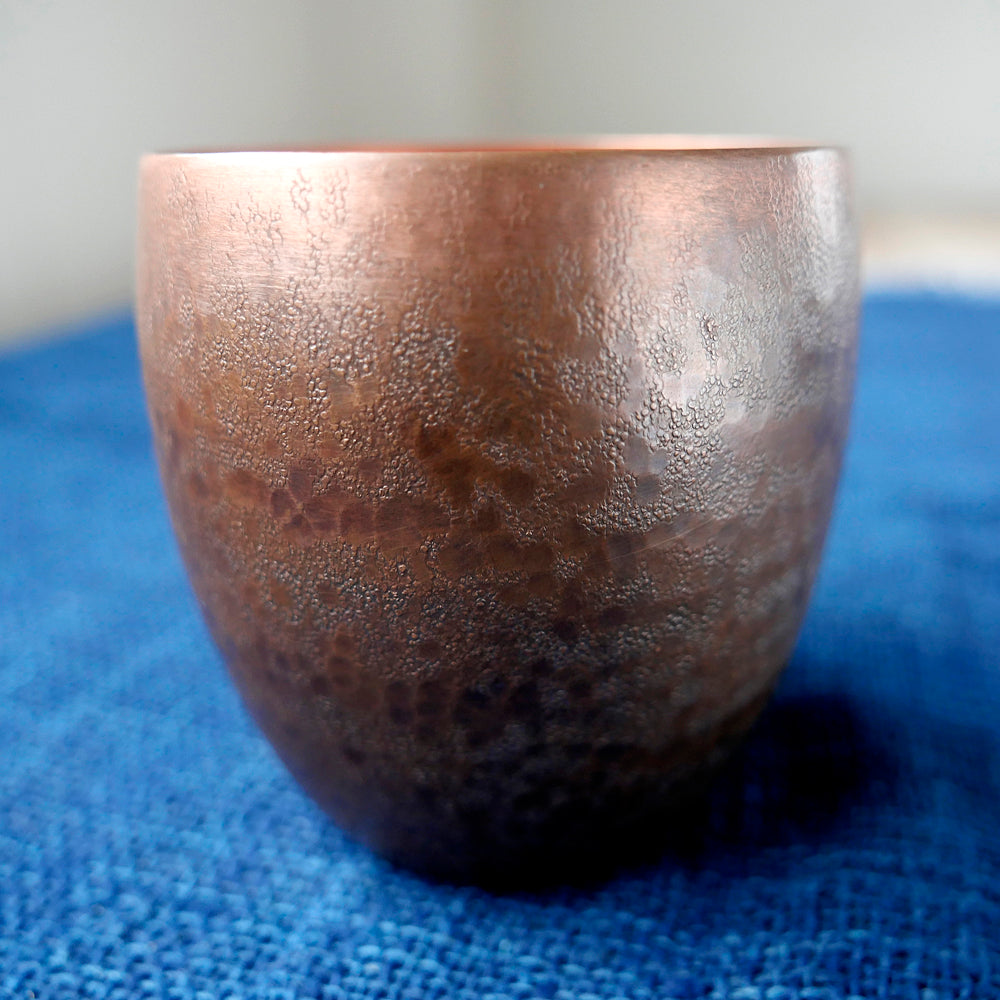こちらは銅のカップで、銅は抗菌作用があるのできれいに保てます。銅は経年変化も美しく、まさに一生ものの逸品です。また丹精に数千回も叩き描いた槌目模様は美しさだけではなく、本体の強度を増す役割も果たしています。