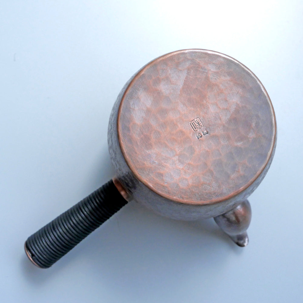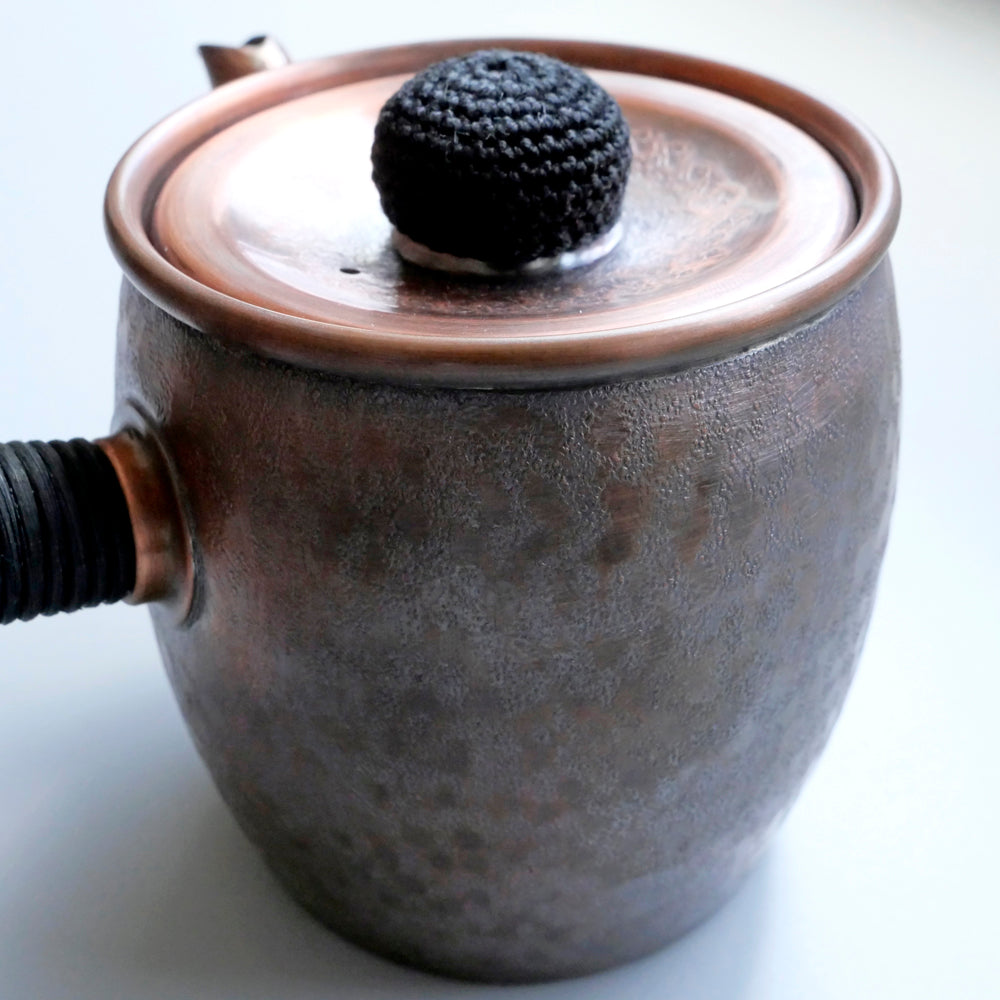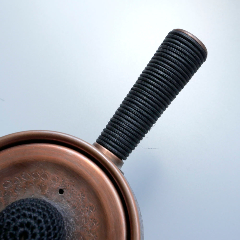 こちらは銅の急須で、持ち手は熱くならないように蔓を巻き付け、さらに持ち蓋には手編みキャップも付いております。装着可能な金属の茶こしアミも付属。銅は熱伝導が良いため、濃いお茶が好きな方にオススメで、さらに抗菌作用があるのでお手入れも乾拭きだけで大丈夫です。銅は経年変化も美しく、まさに一生ものの逸品です。また丹精に数千回も叩き描いた槌目模様は美しさだけではなく、本体の強度を増す役割も果たしています。