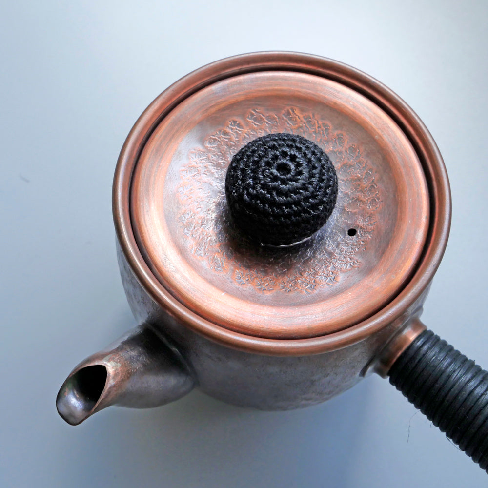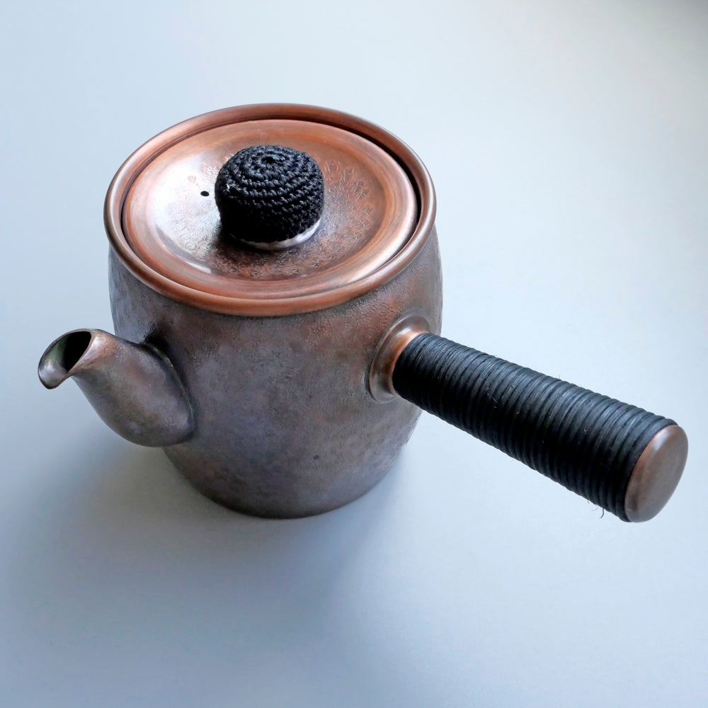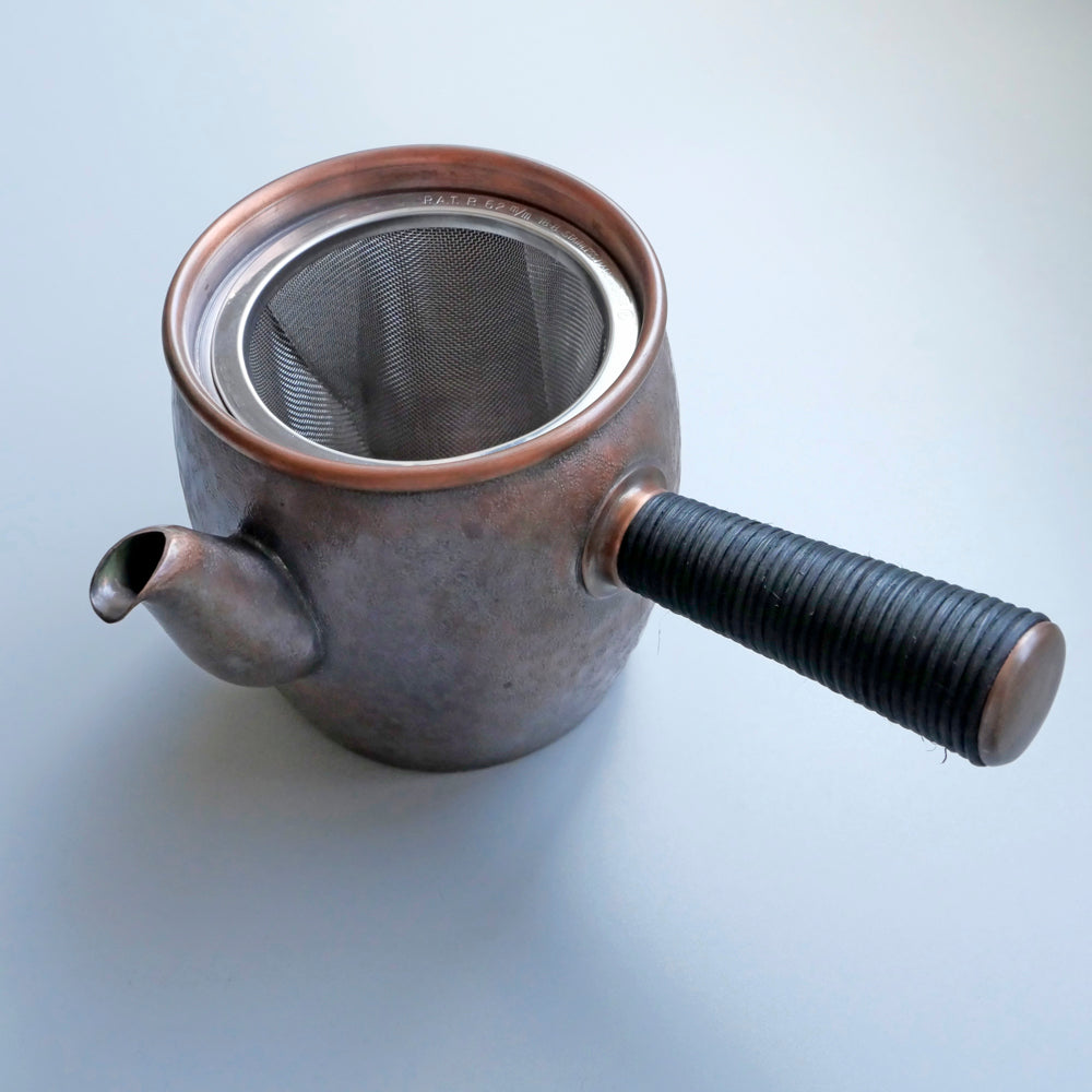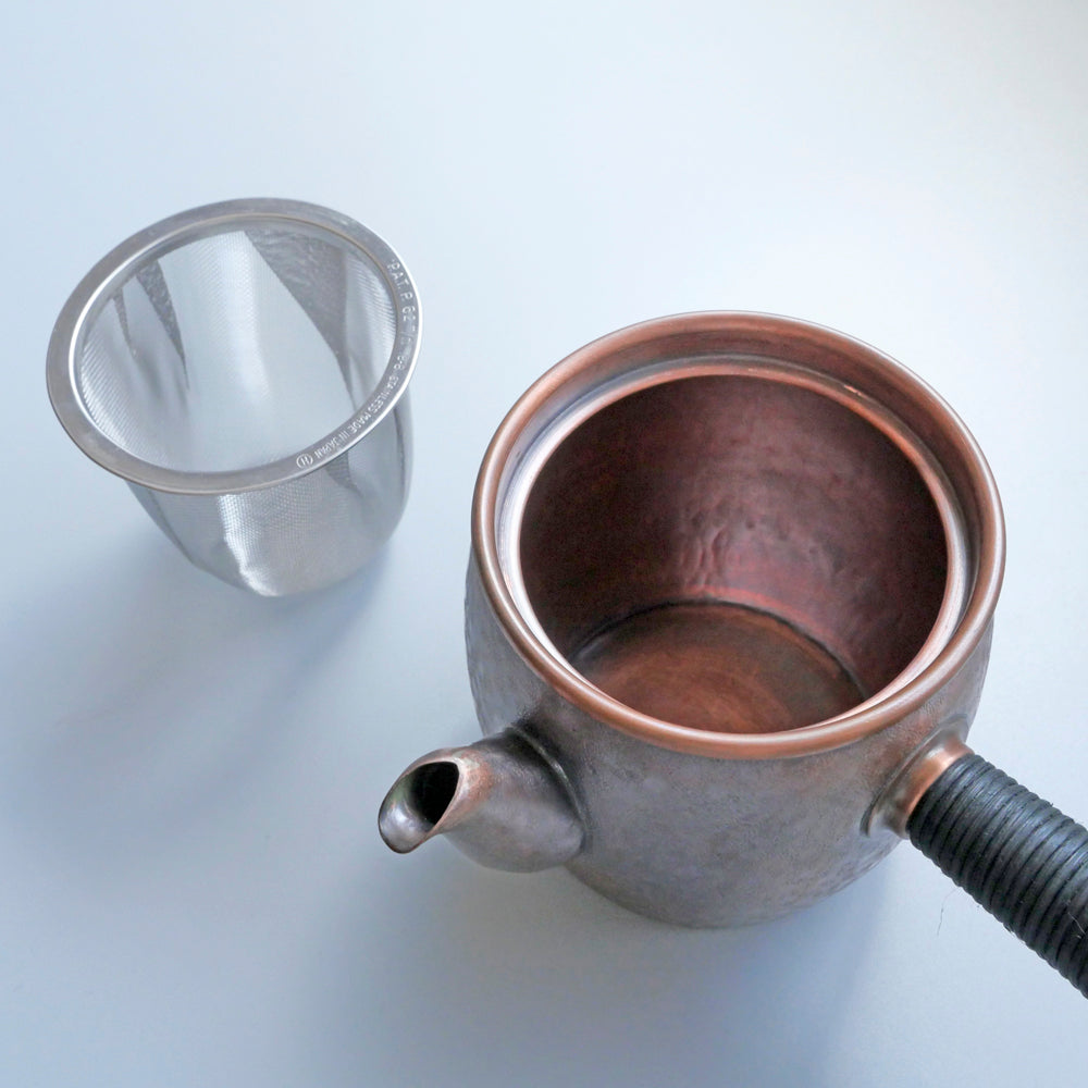こちらは銅の急須で、持ち手は熱くならないように蔓を巻き付け、さらに持ち蓋には手編みキャップも付いております。装着可能な金属の茶こしアミも付属。銅は熱伝導が良いため、濃いお茶が好きな方にオススメで、さらに抗菌作用があるのでお手入れも乾拭きだけで大丈夫です。銅は経年変化も美しく、まさに一生ものの逸品です。また丹精に数千回も叩き描いた槌目模様は美しさだけではなく、本体の強度を増す役割も果たしています。